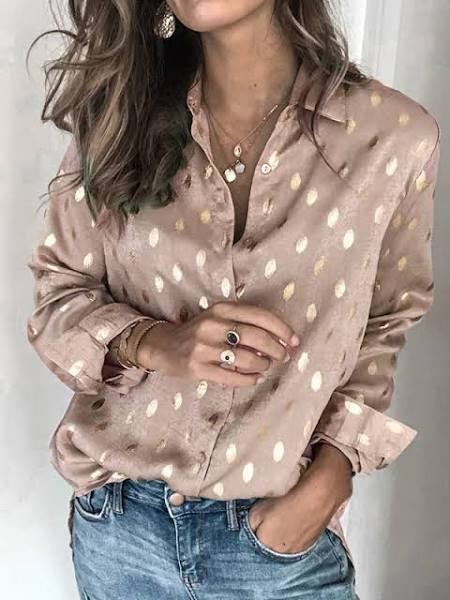 Elevate your everyday style with this long sleeve button down top featuring a shimmering metallic dot pattern that catches the light just right. The classic collar keeps things polished while the shirttail hem adds a touch of laid-back cool—perfect for tucking in or leaving loose. Whether you're dressing it up for the office or down for weekend vibes, this versatile piece is ready to work as hard as you do.