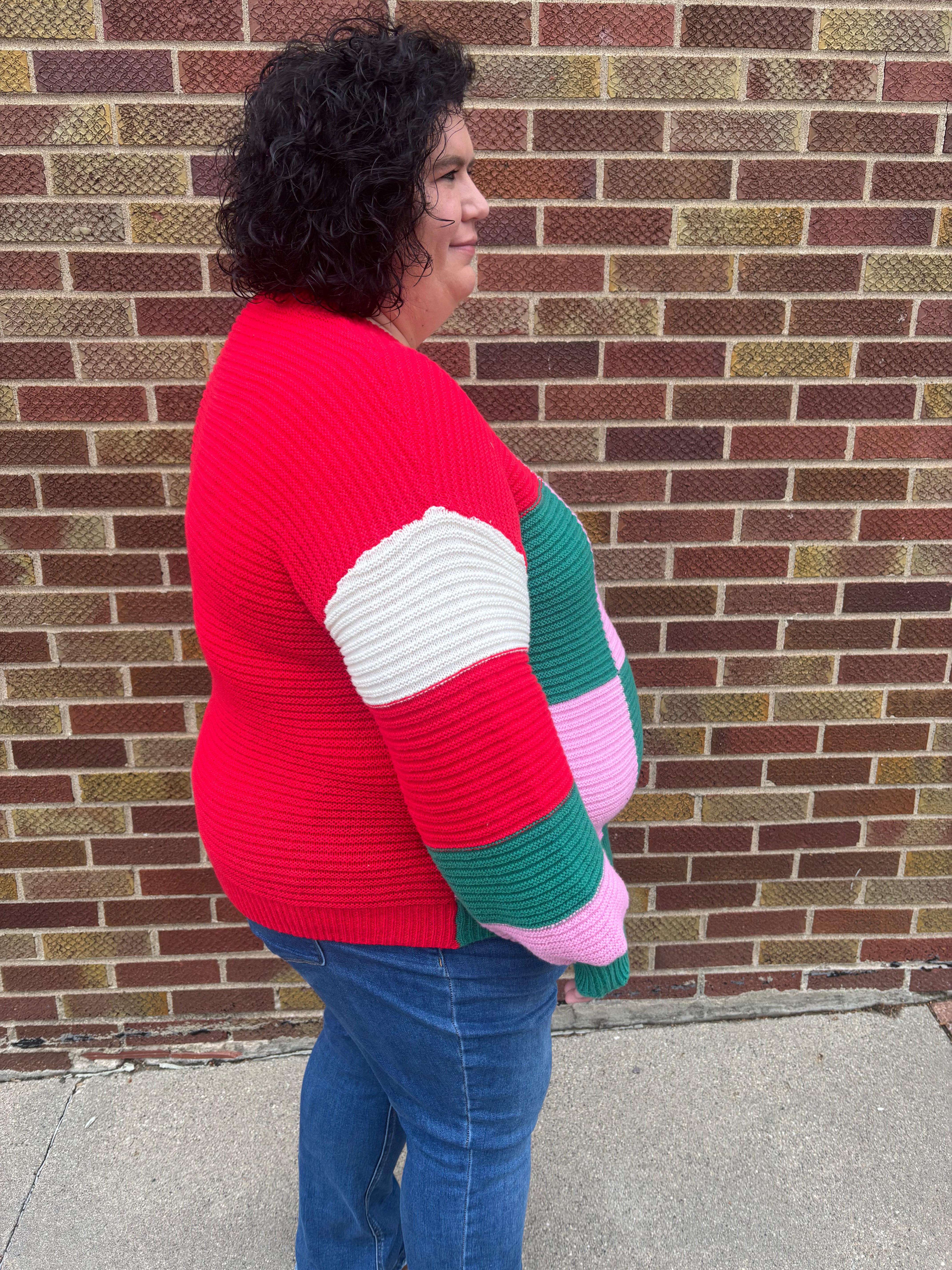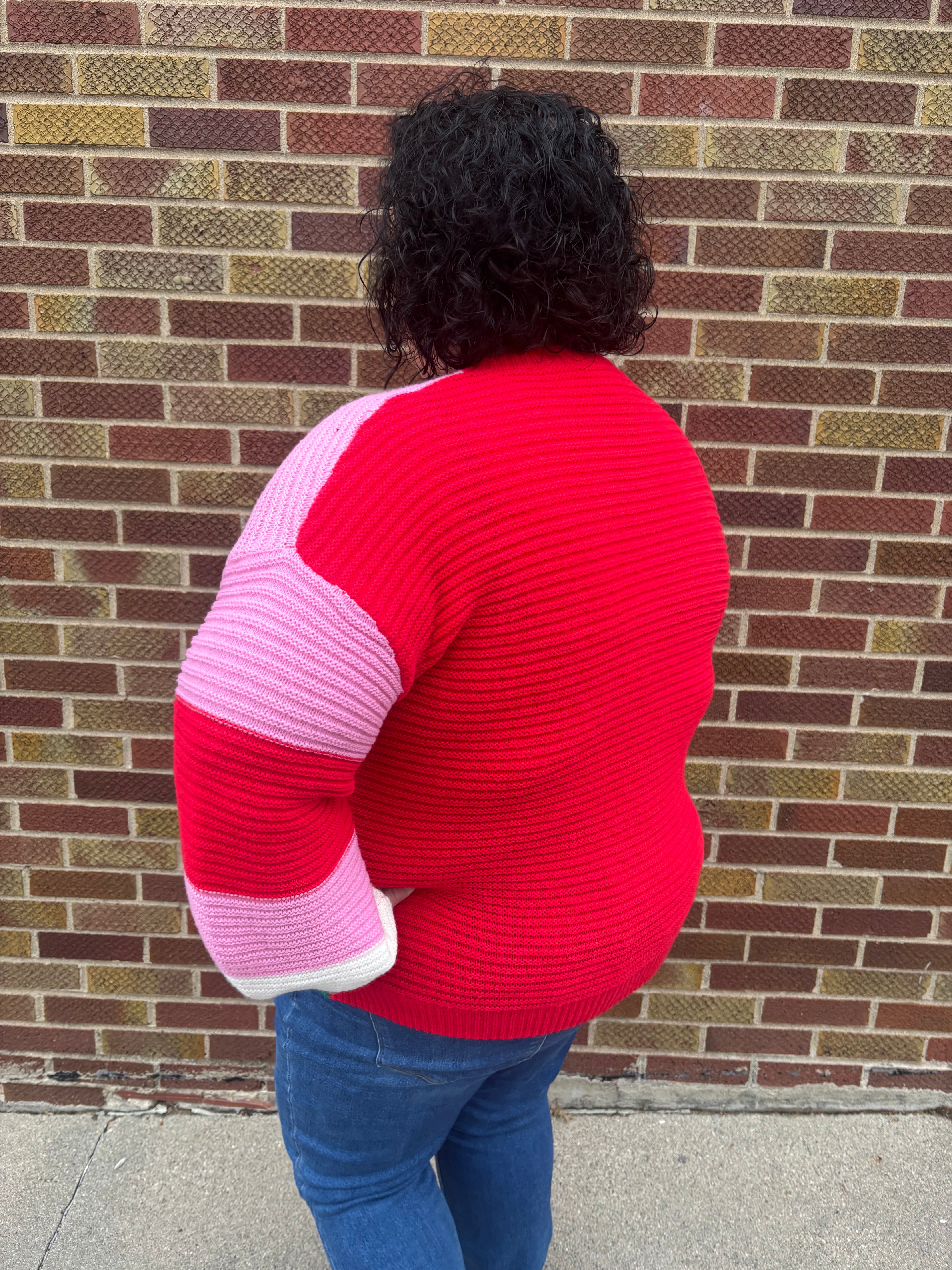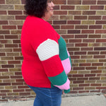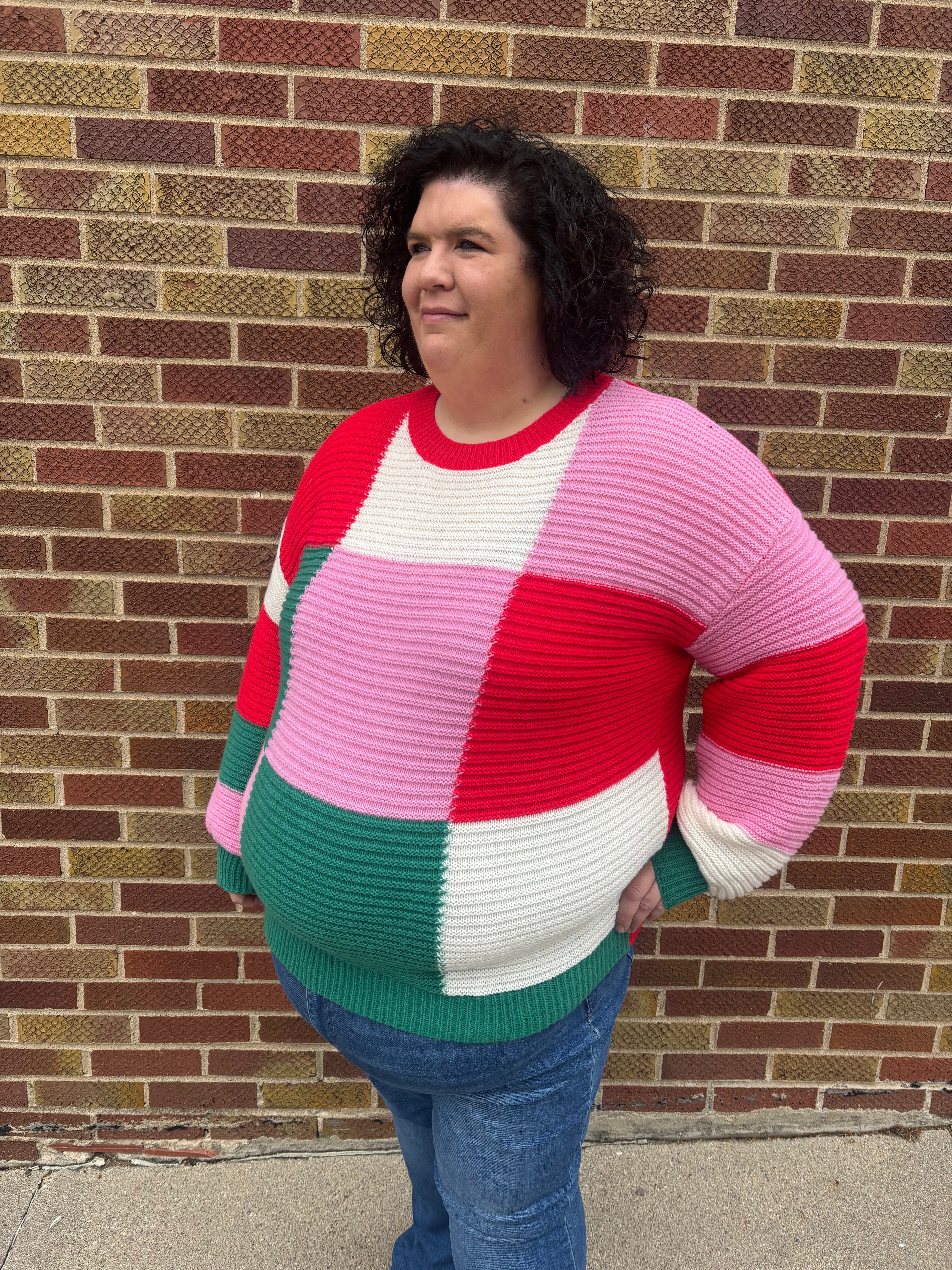 Turn heads in this bold geometric knit sweater that's anything but boring. Featuring a vibrant color-block design in green, red, pink, and white, this piece is a total mood-lifter. The cozy knitted fabric hugs you in all the right ways while the eye-catching pattern does the talking. Perfect for anyone who refuses to blend into the background—because life's too short for basic sweaters.