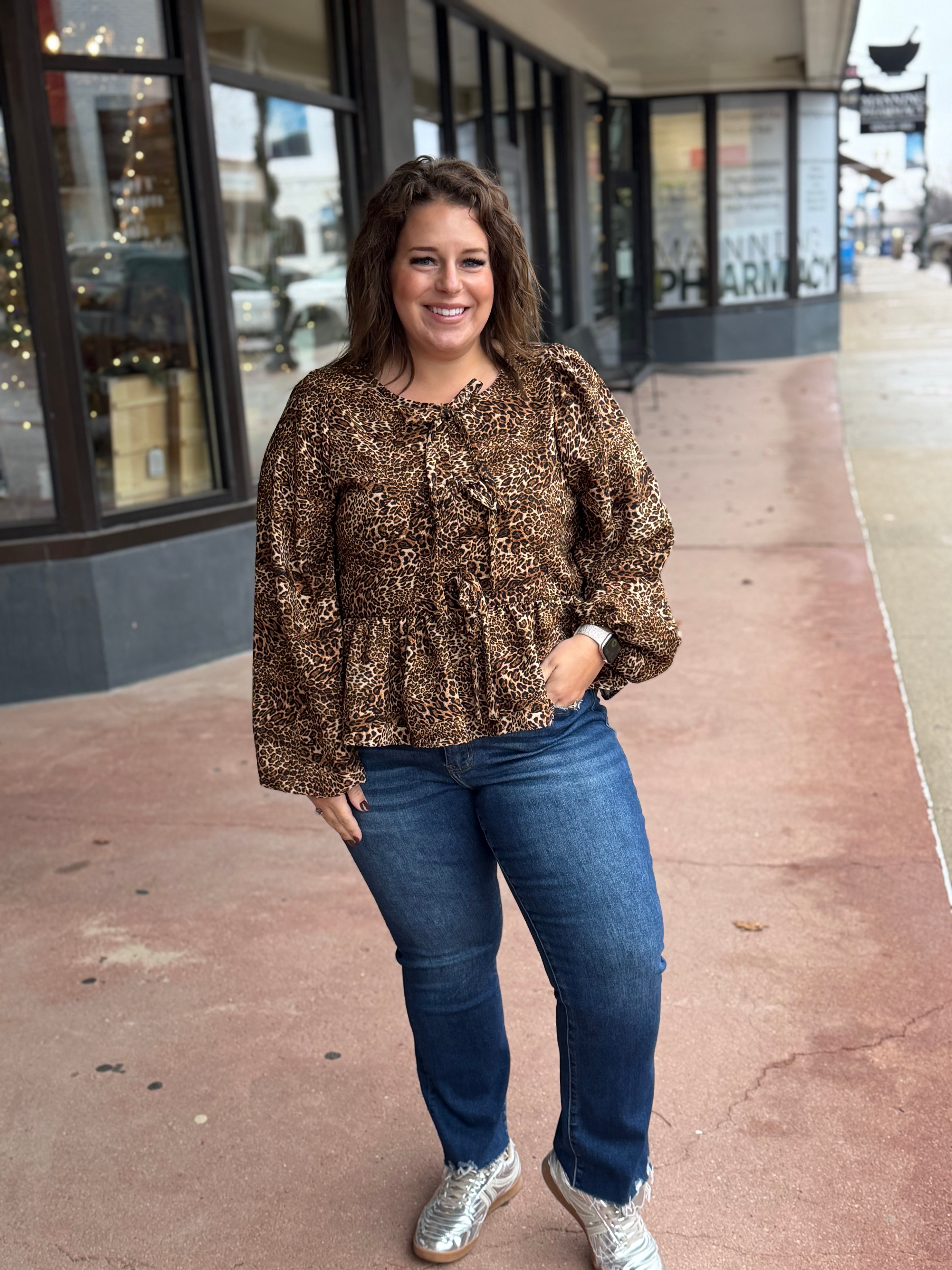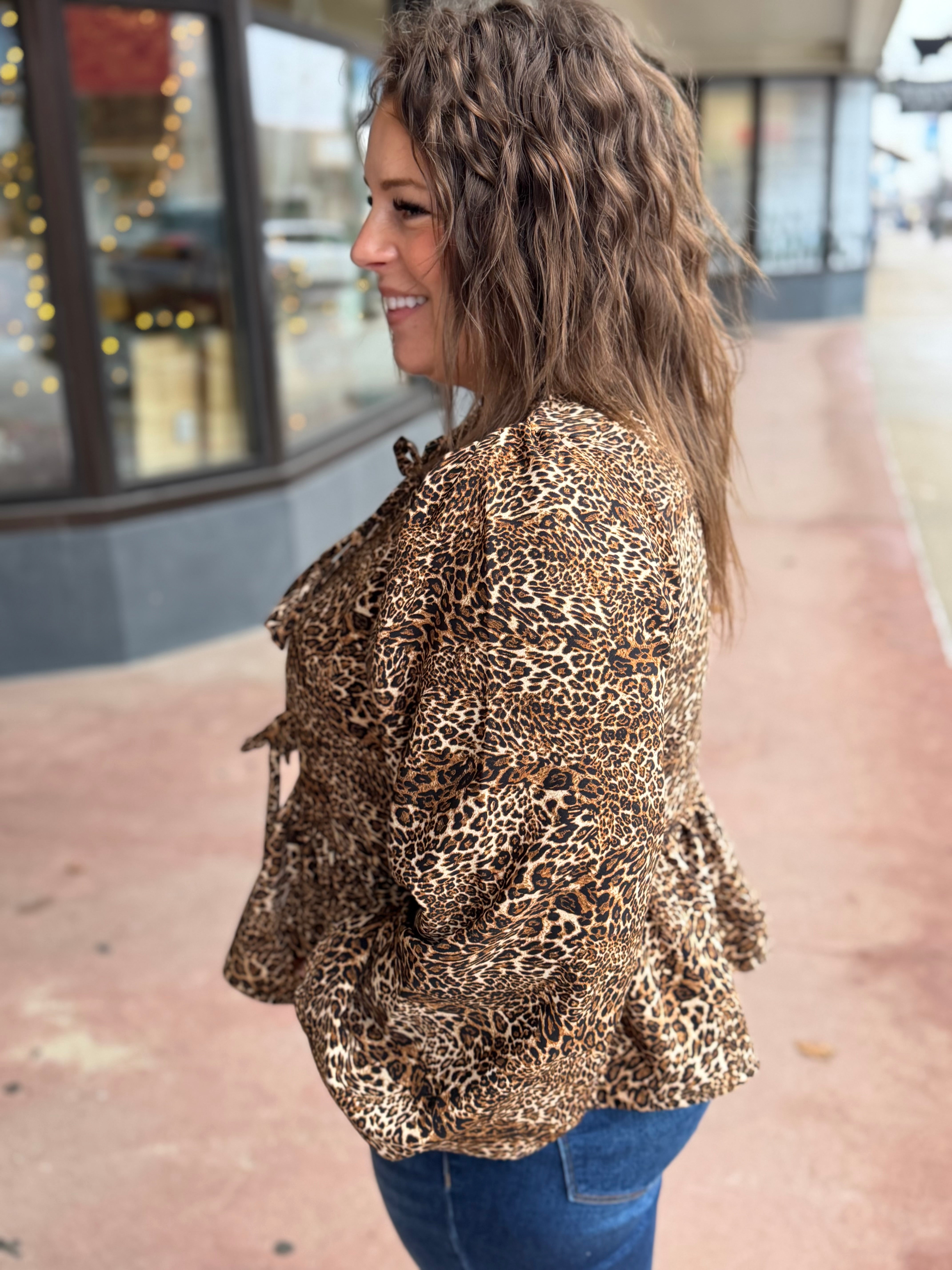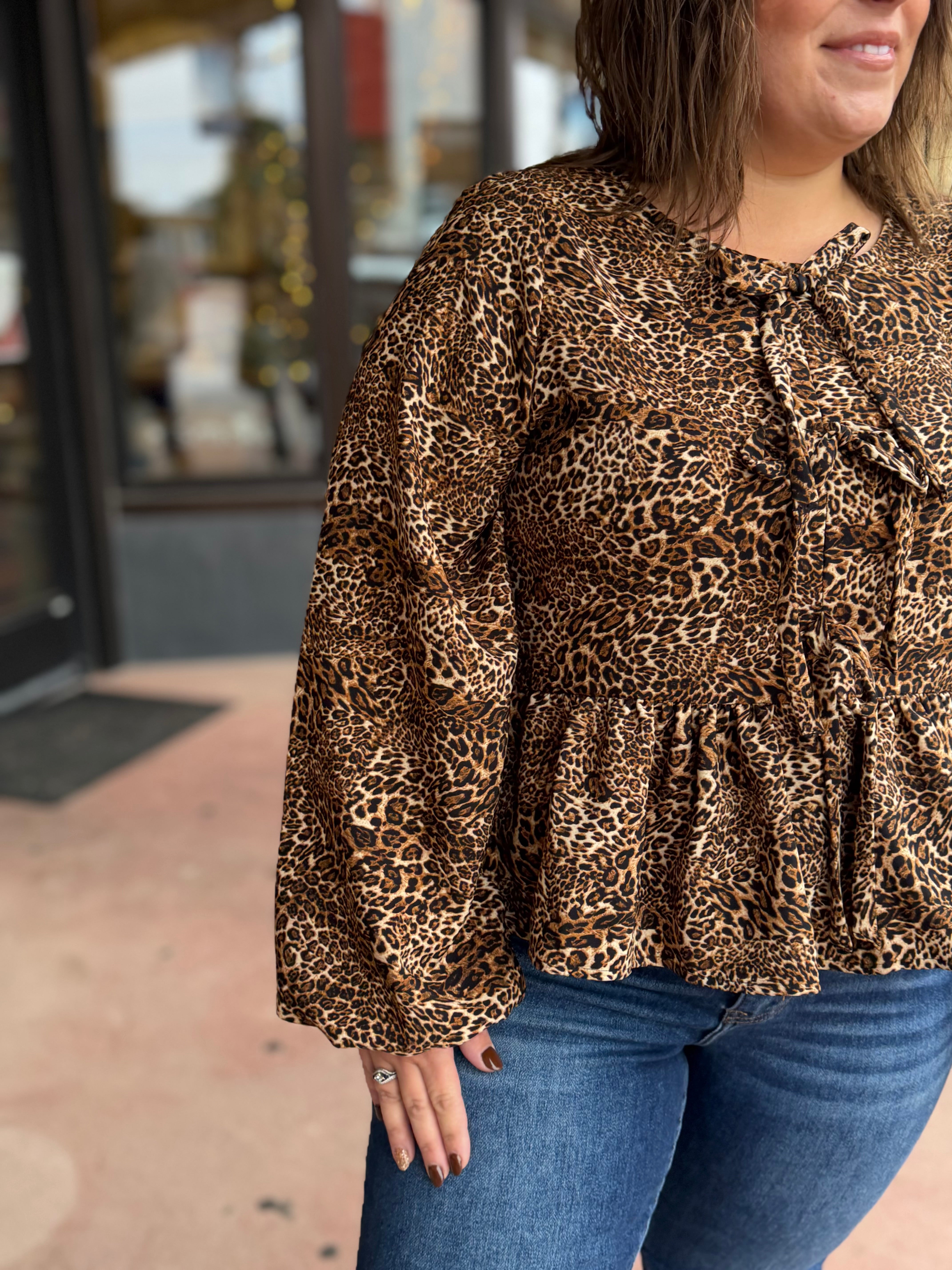 Plus Leopard Print Puff Sleeve Top w/Bow