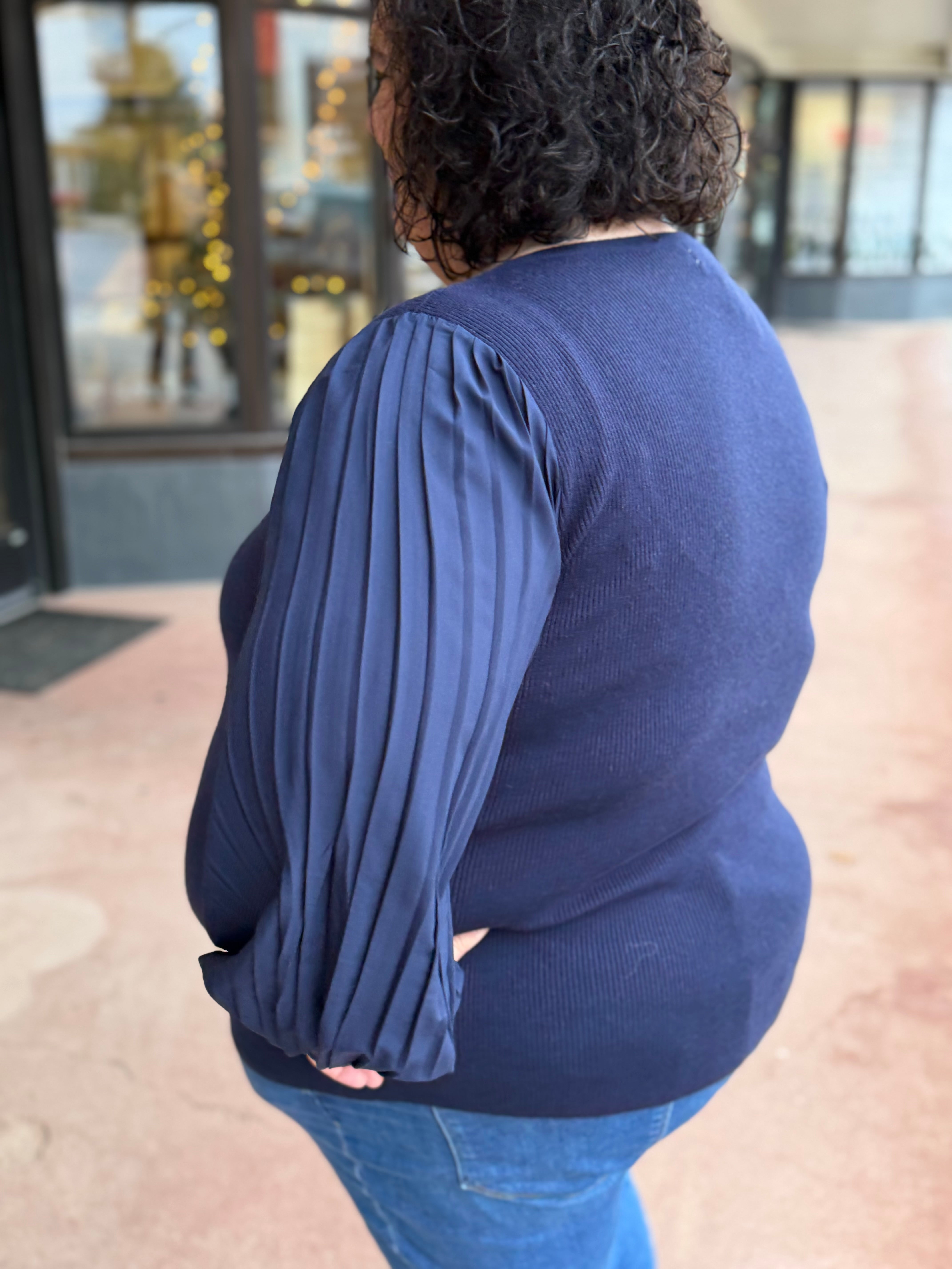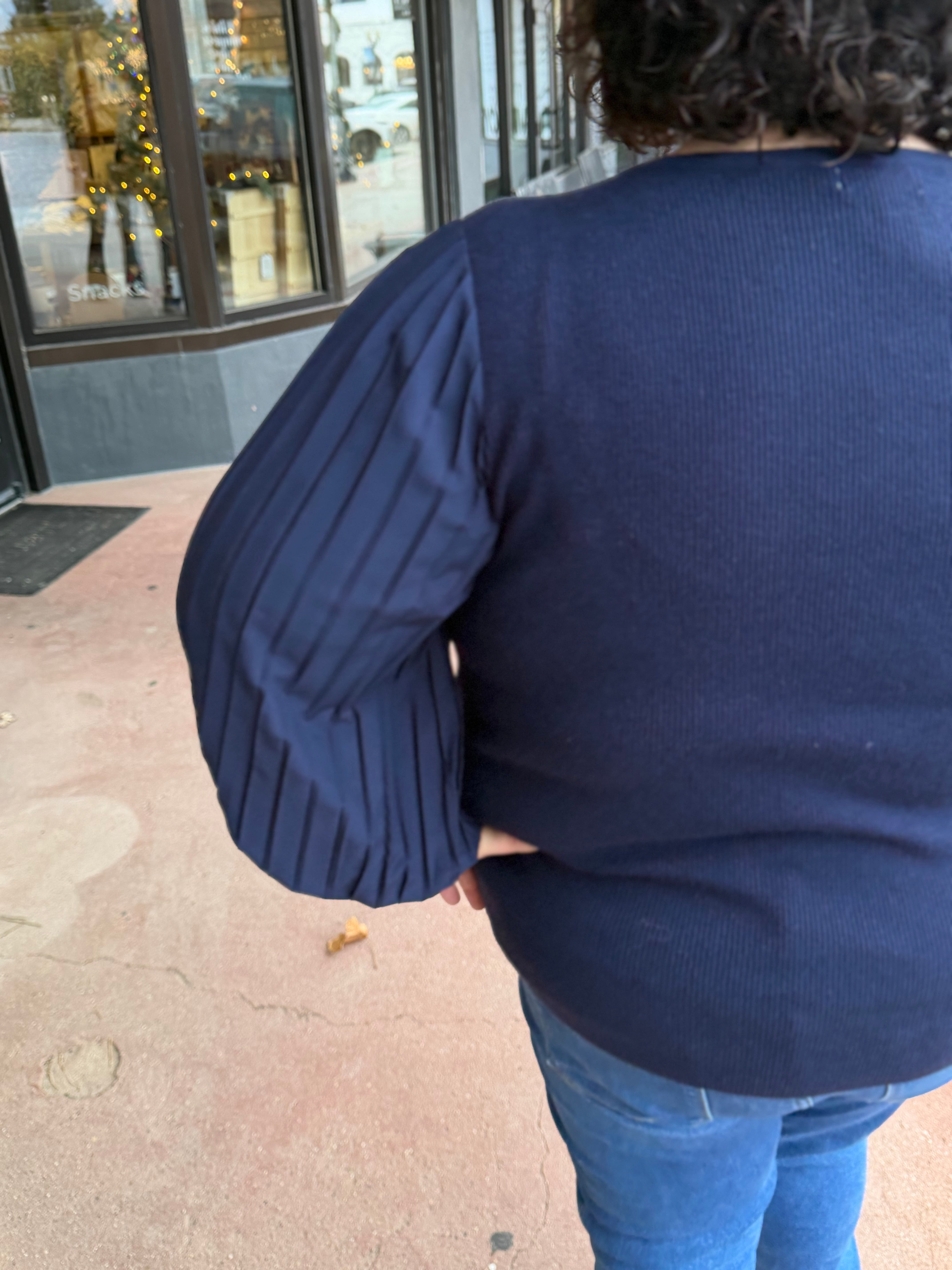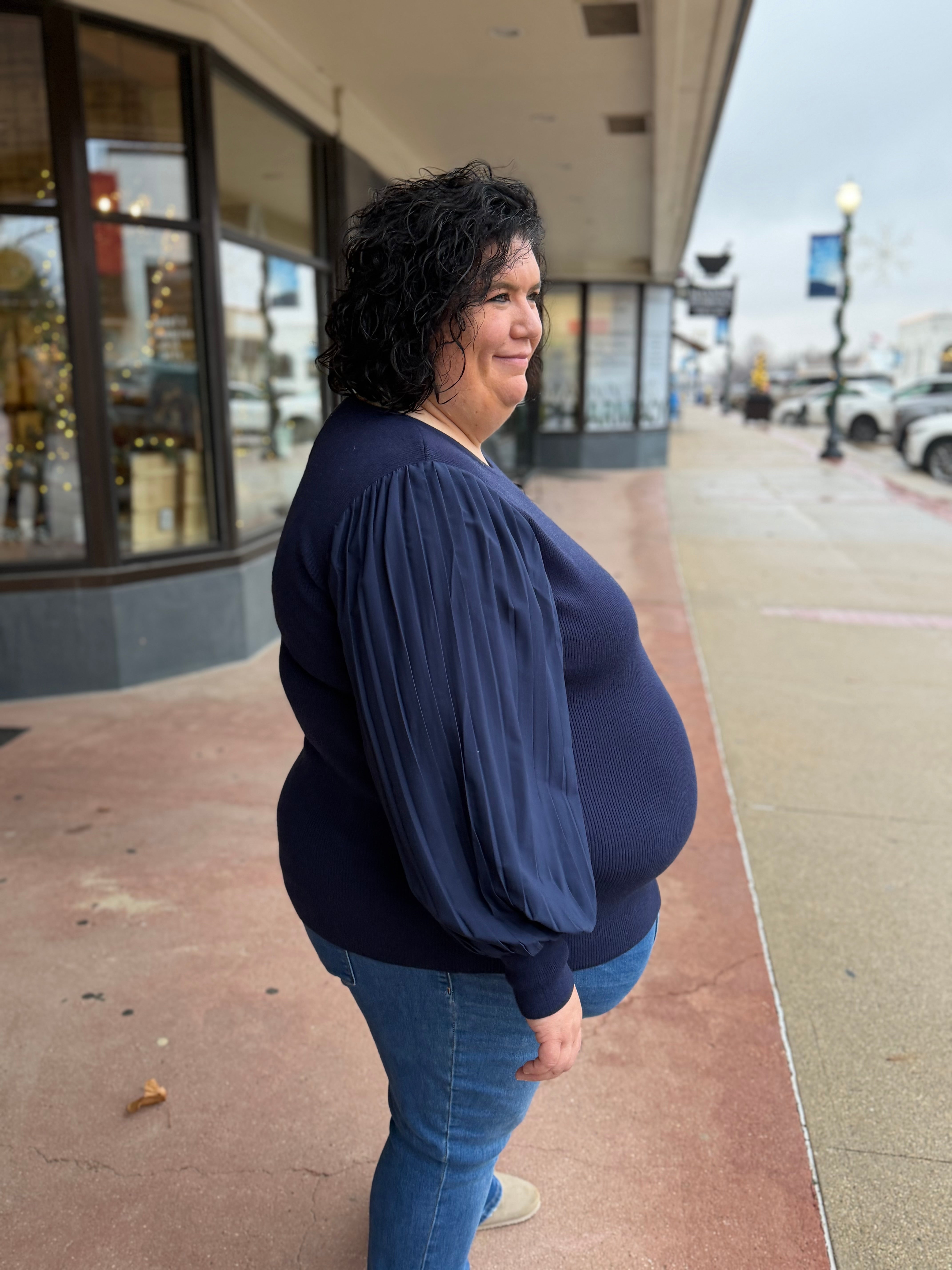 A soft knit fabric with pleated detailing and mixed media accents, it offers depth and sophistication in a flattering silhouette.