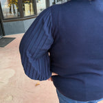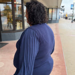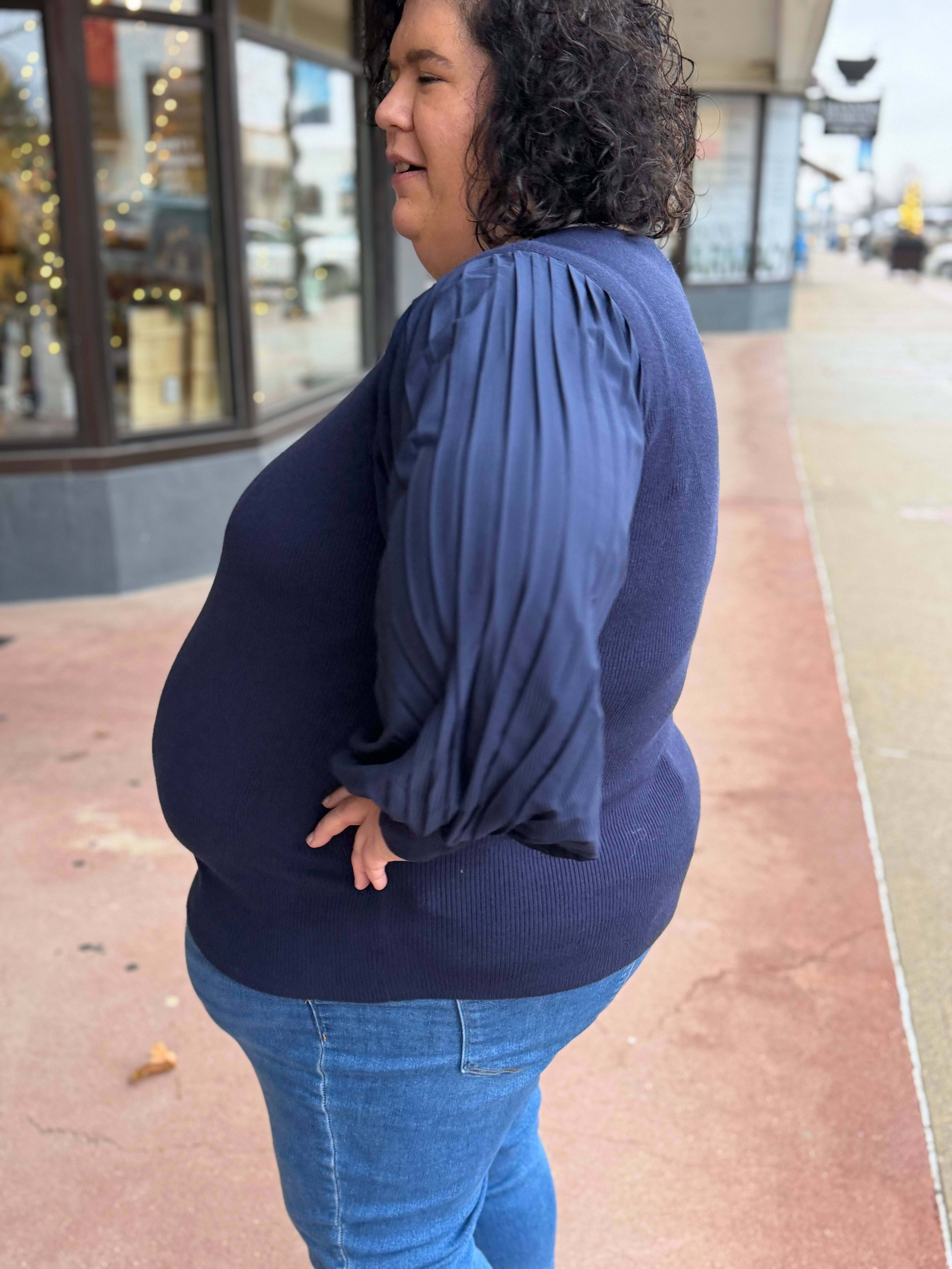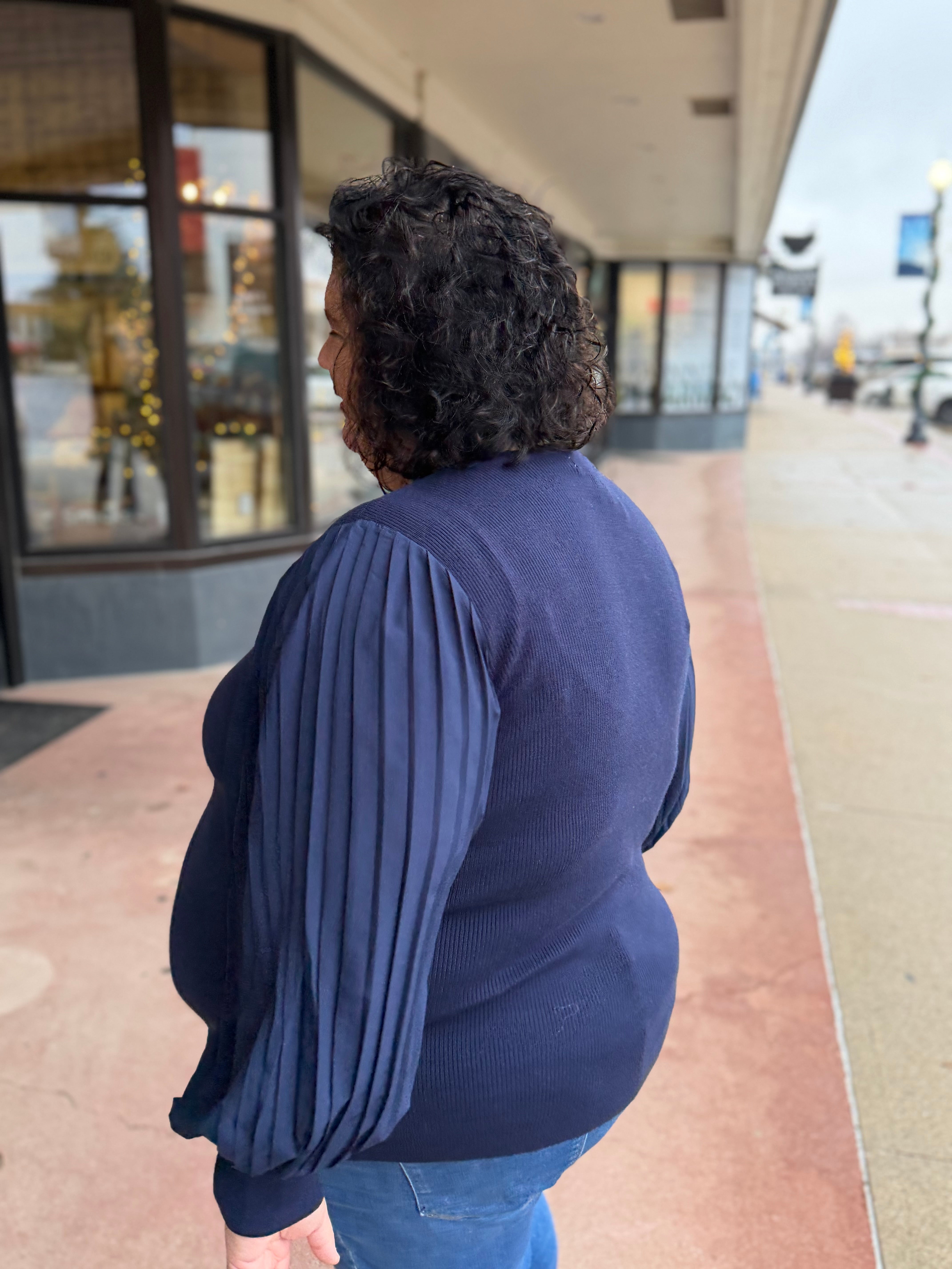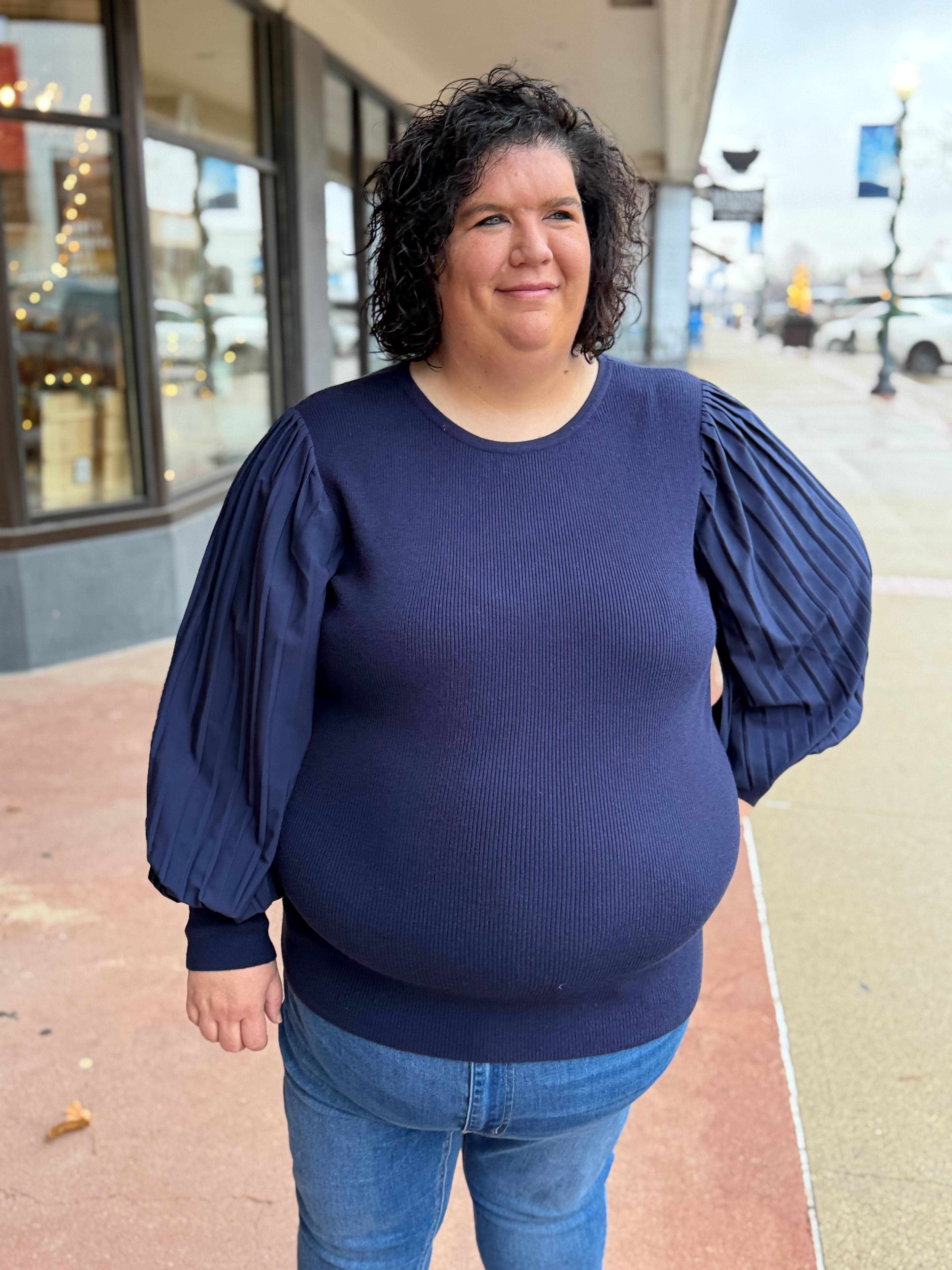 A soft knit fabric with pleated detailing and mixed media accents, it offers depth and sophistication in a flattering silhouette.