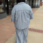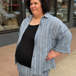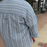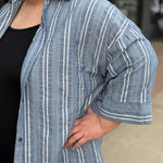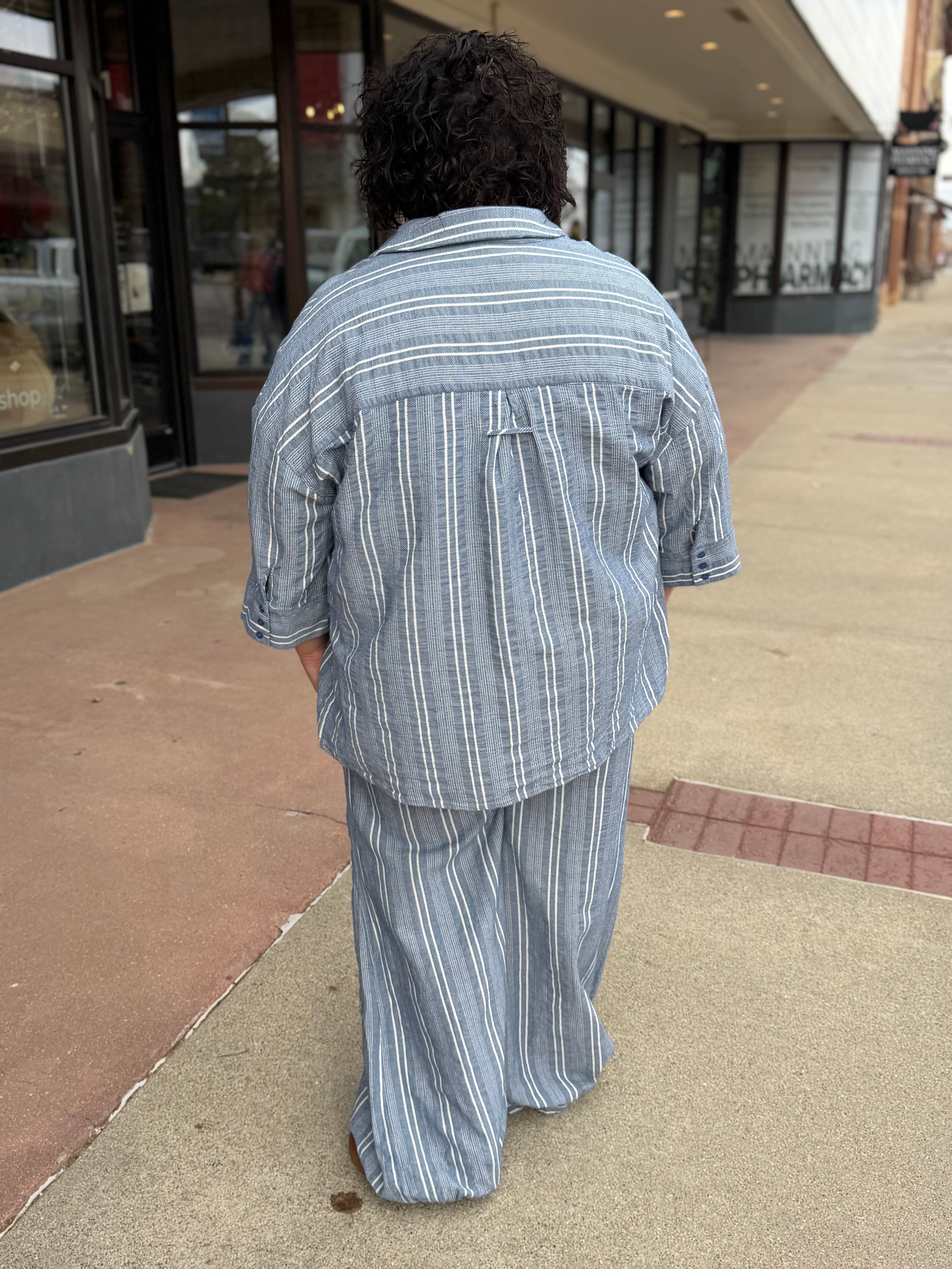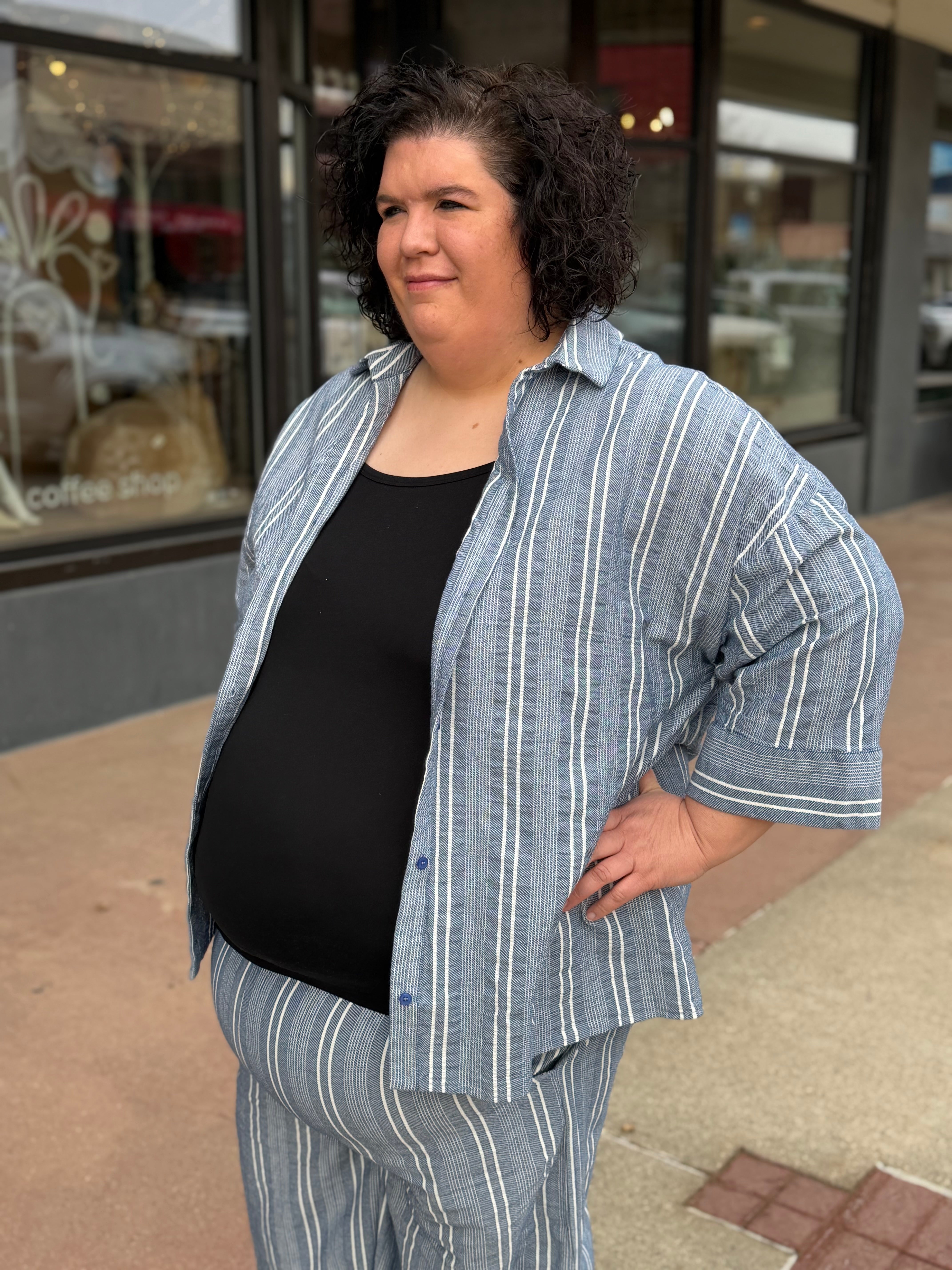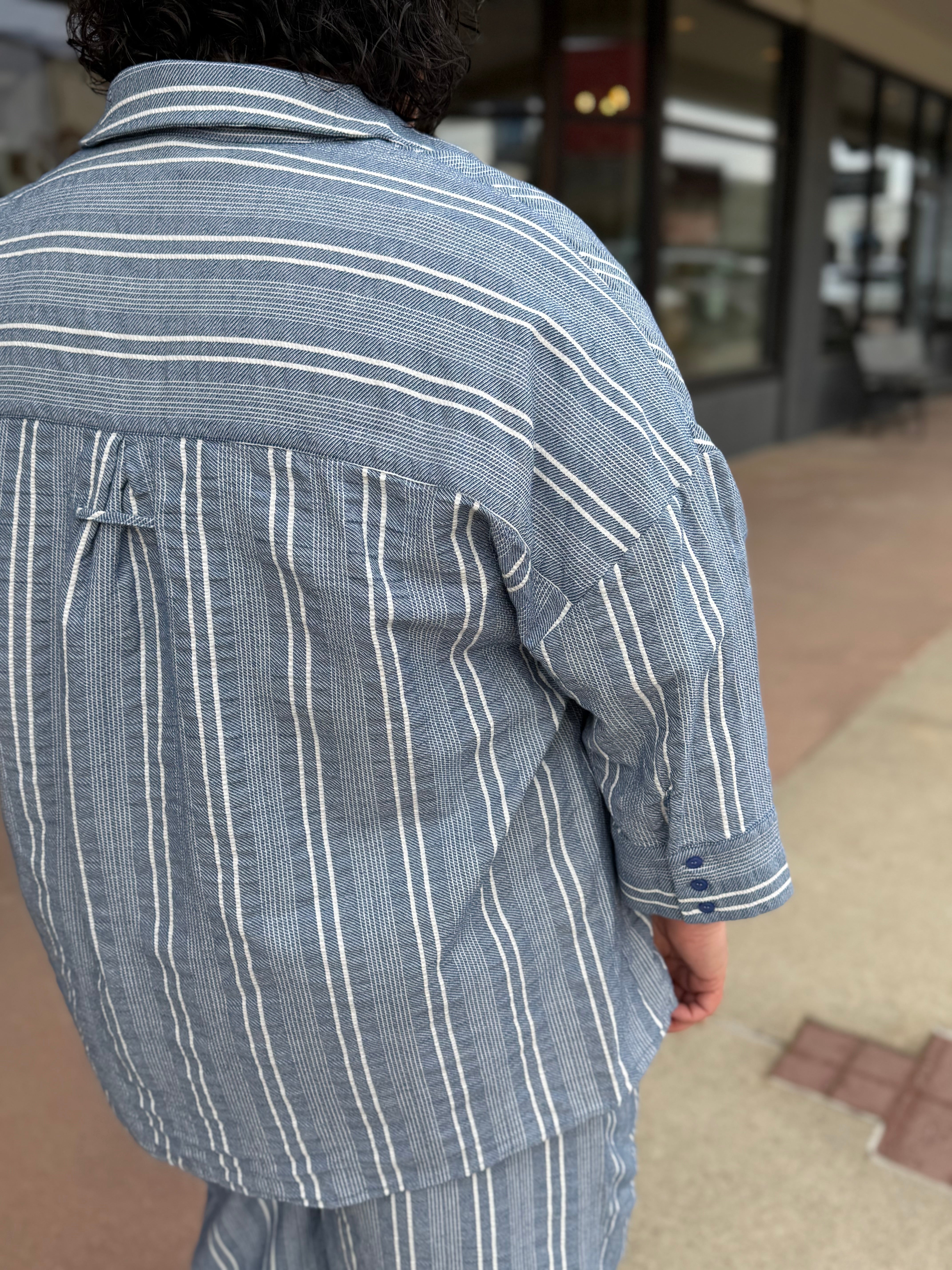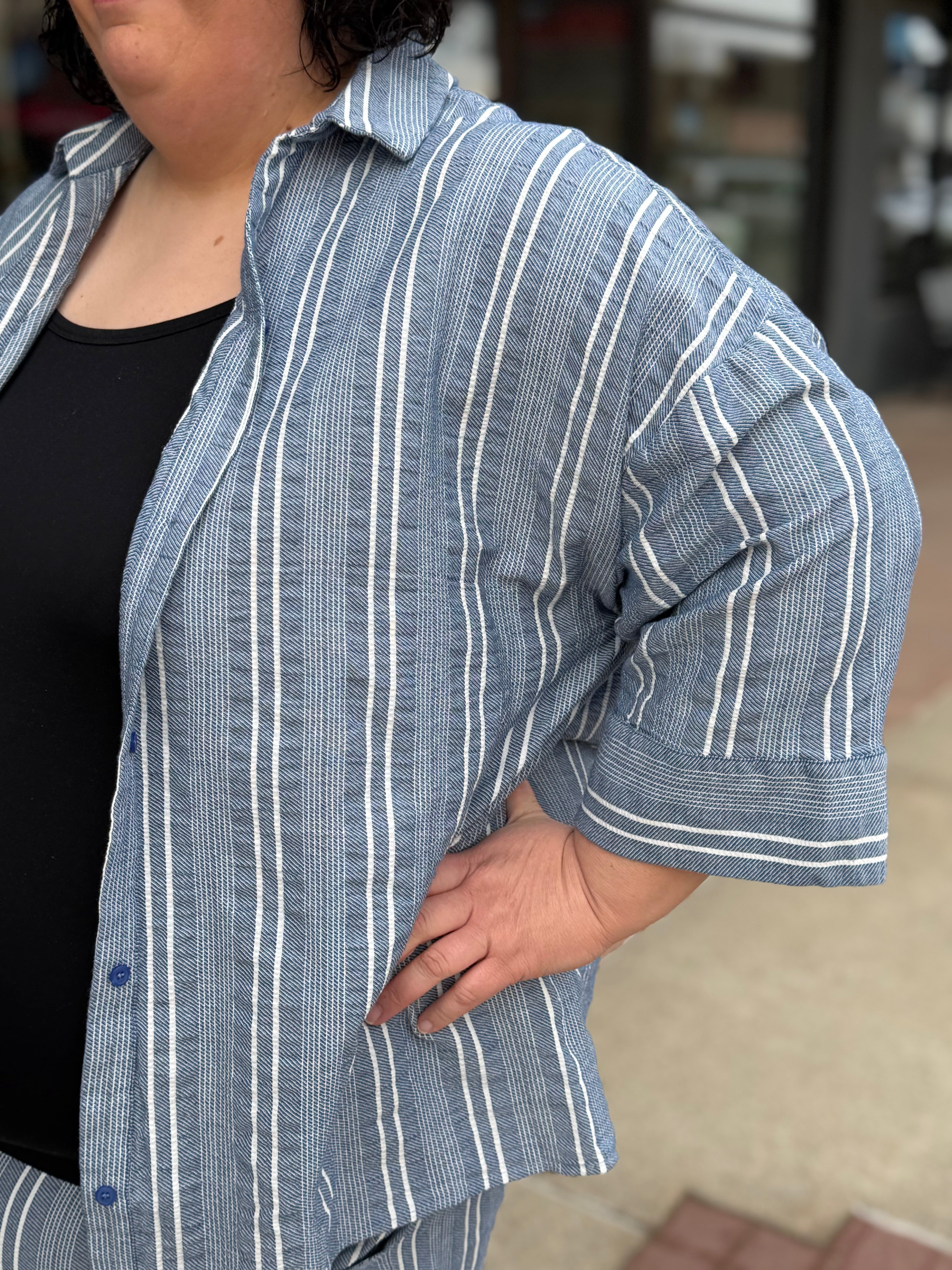 This blue and white striped button-up top is the versatile essential you've been searching for. Featuring a structured collar and flattering three-quarter sleeves.