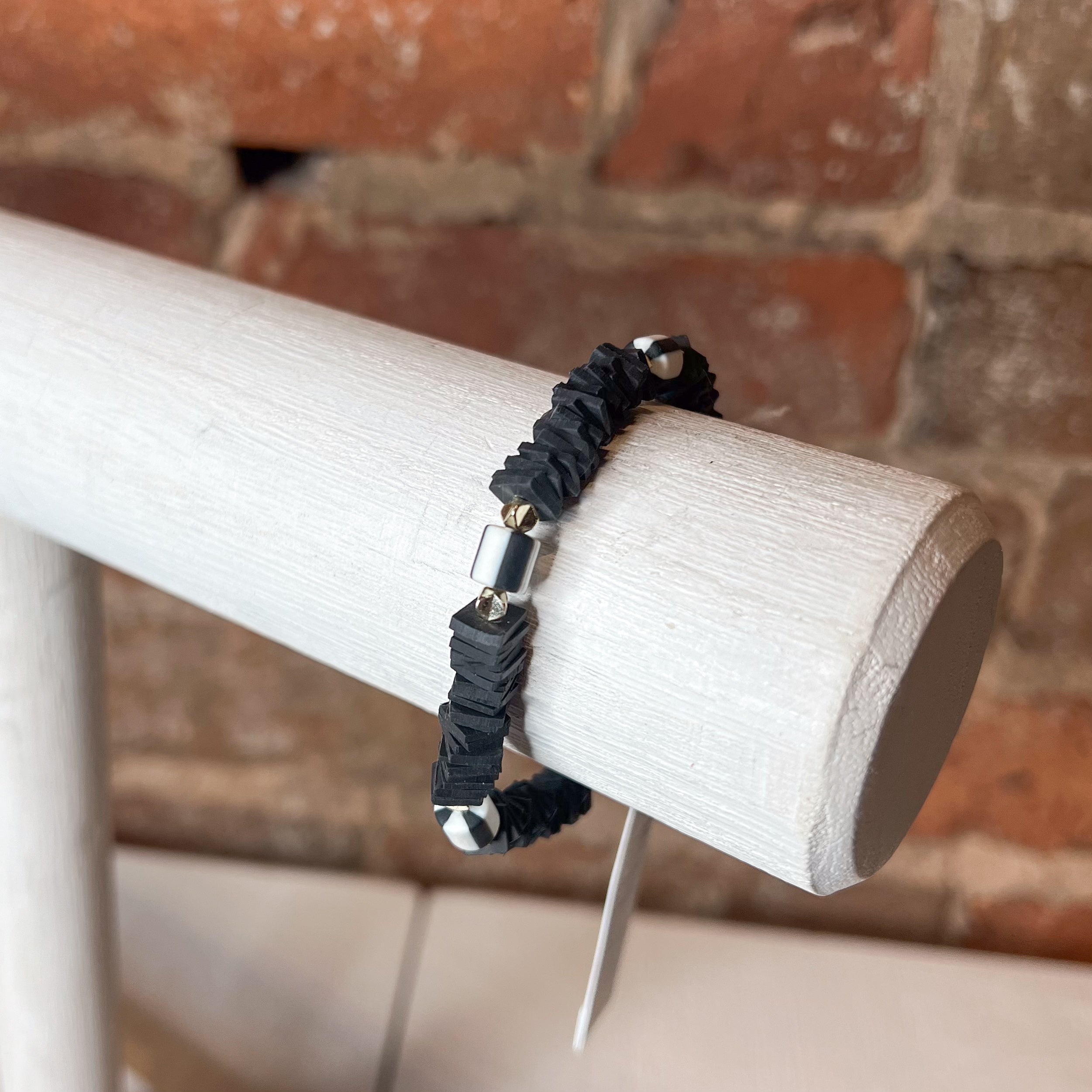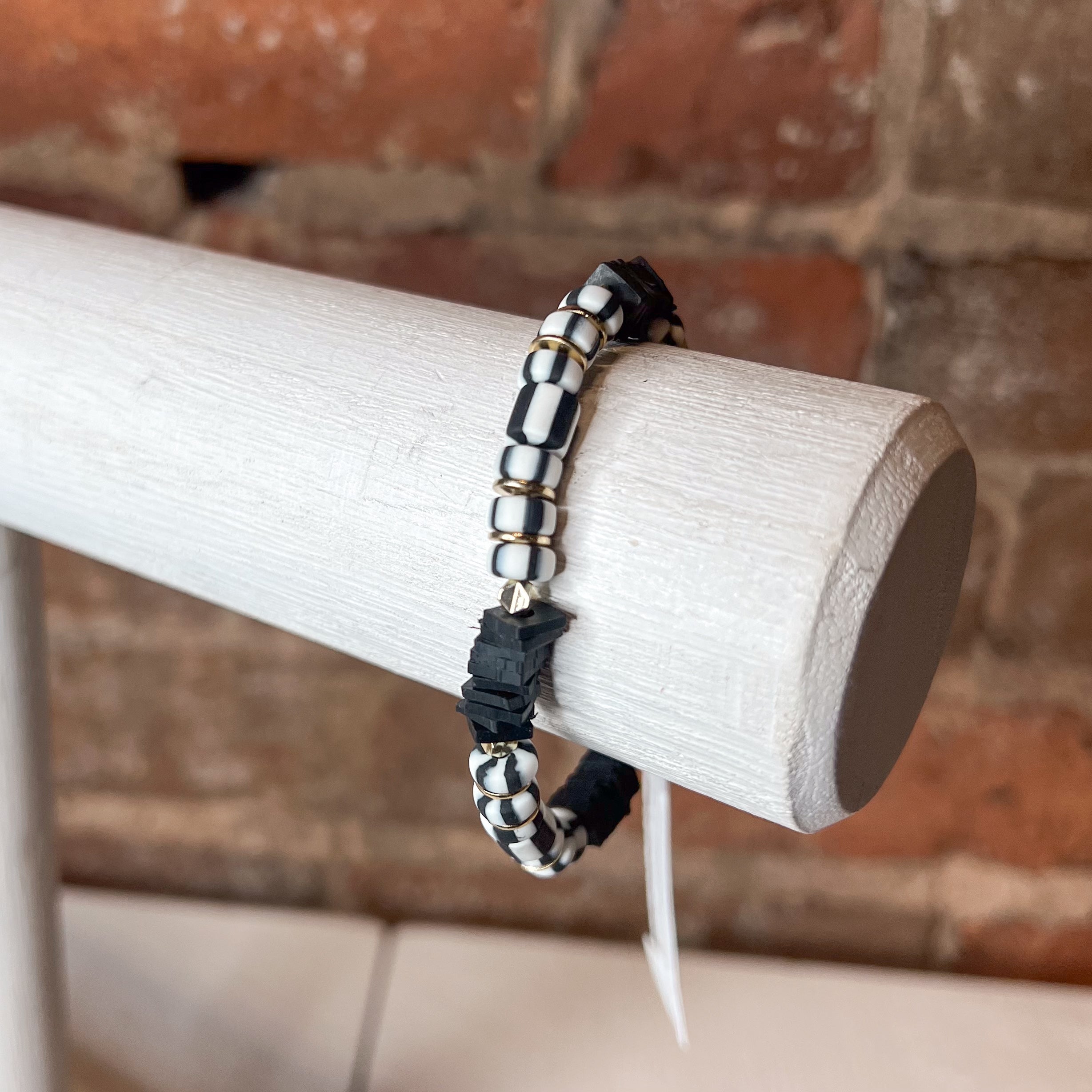 This Black Chunky Heishi Bracelet features a variety of bold black, sleek gold, and crisp white beads, creating a unique and stylish accessory. Elevate your outfit with this eye-catching bracelet that adds a touch of sophistication to any look.