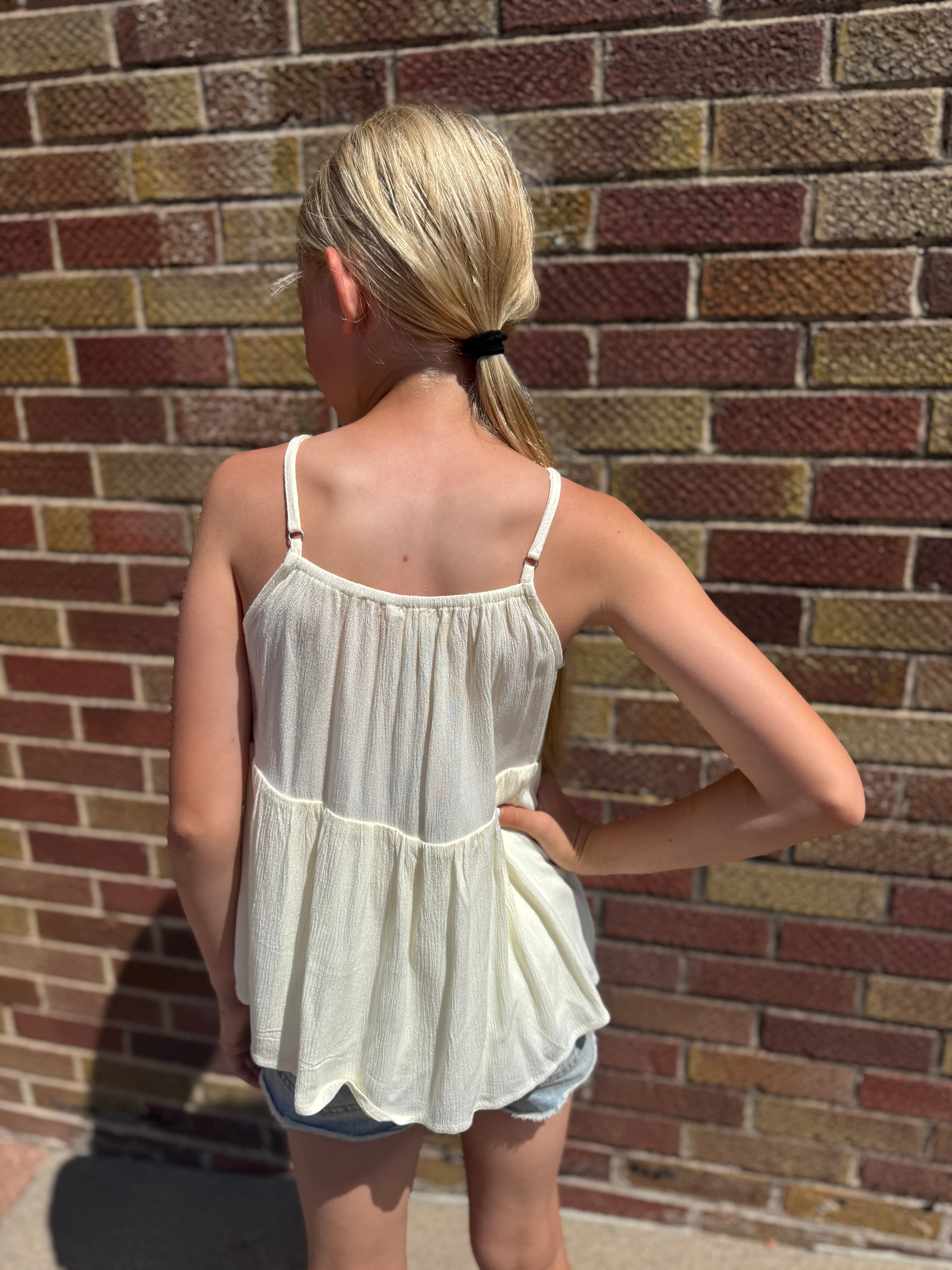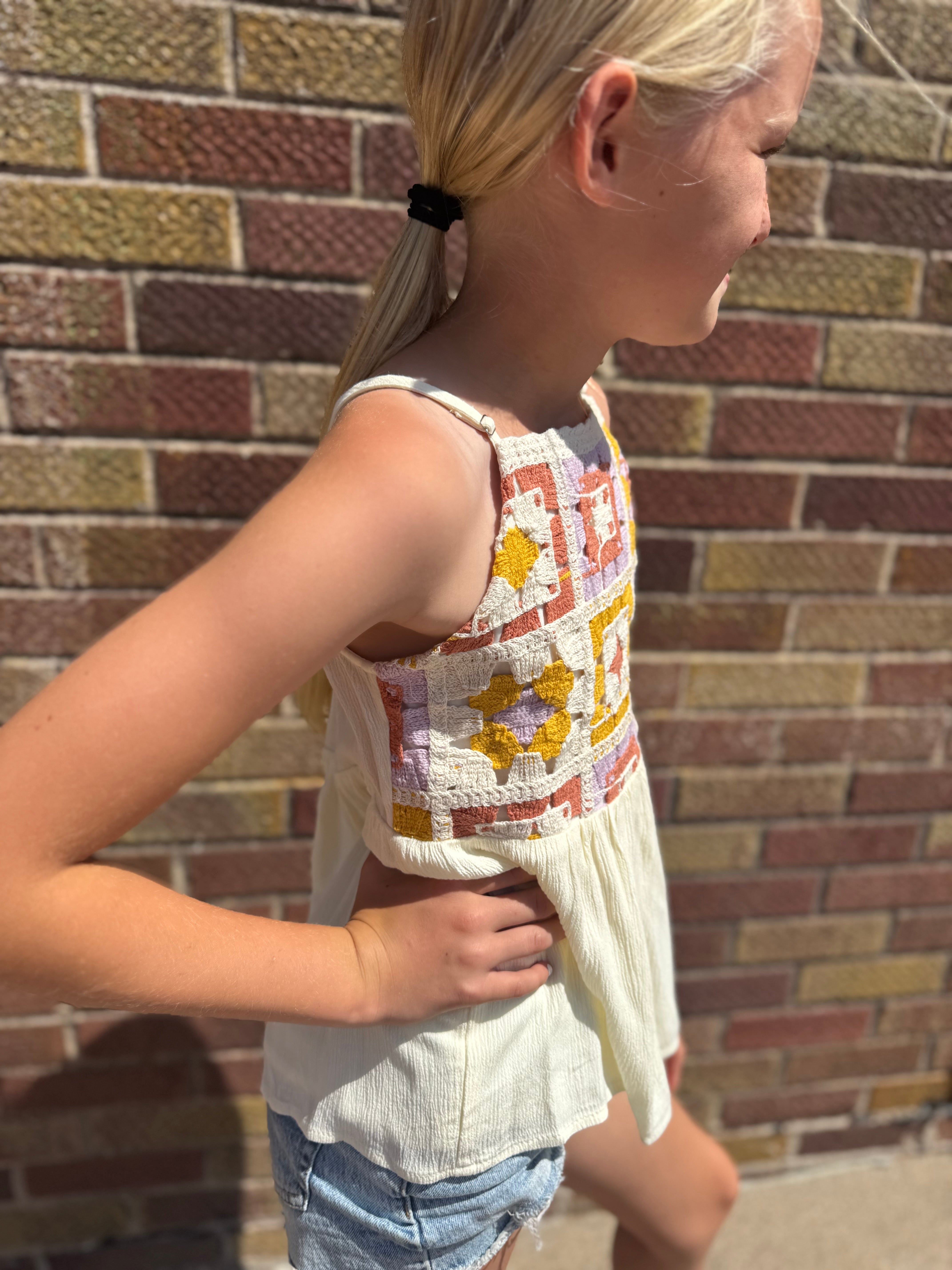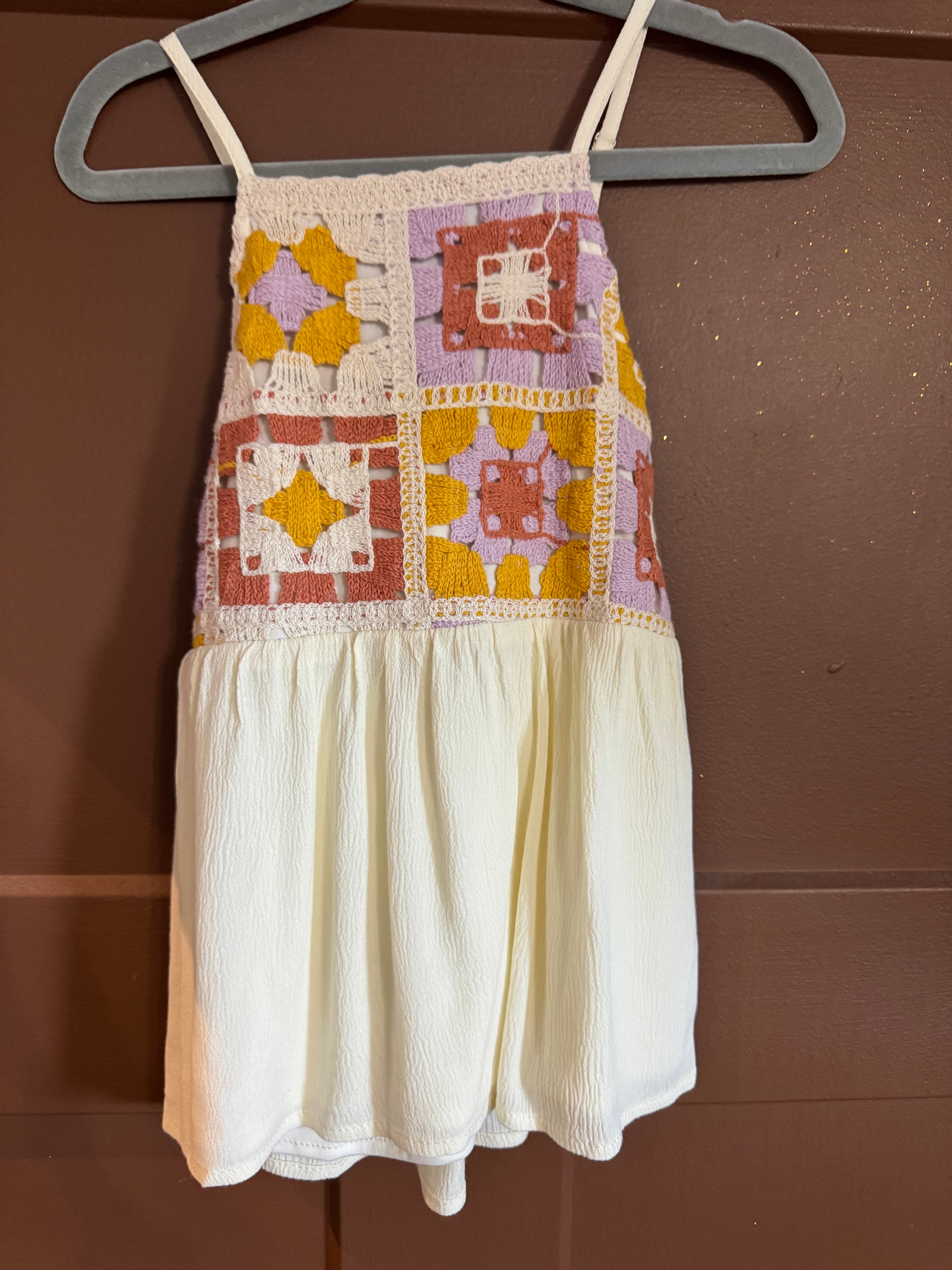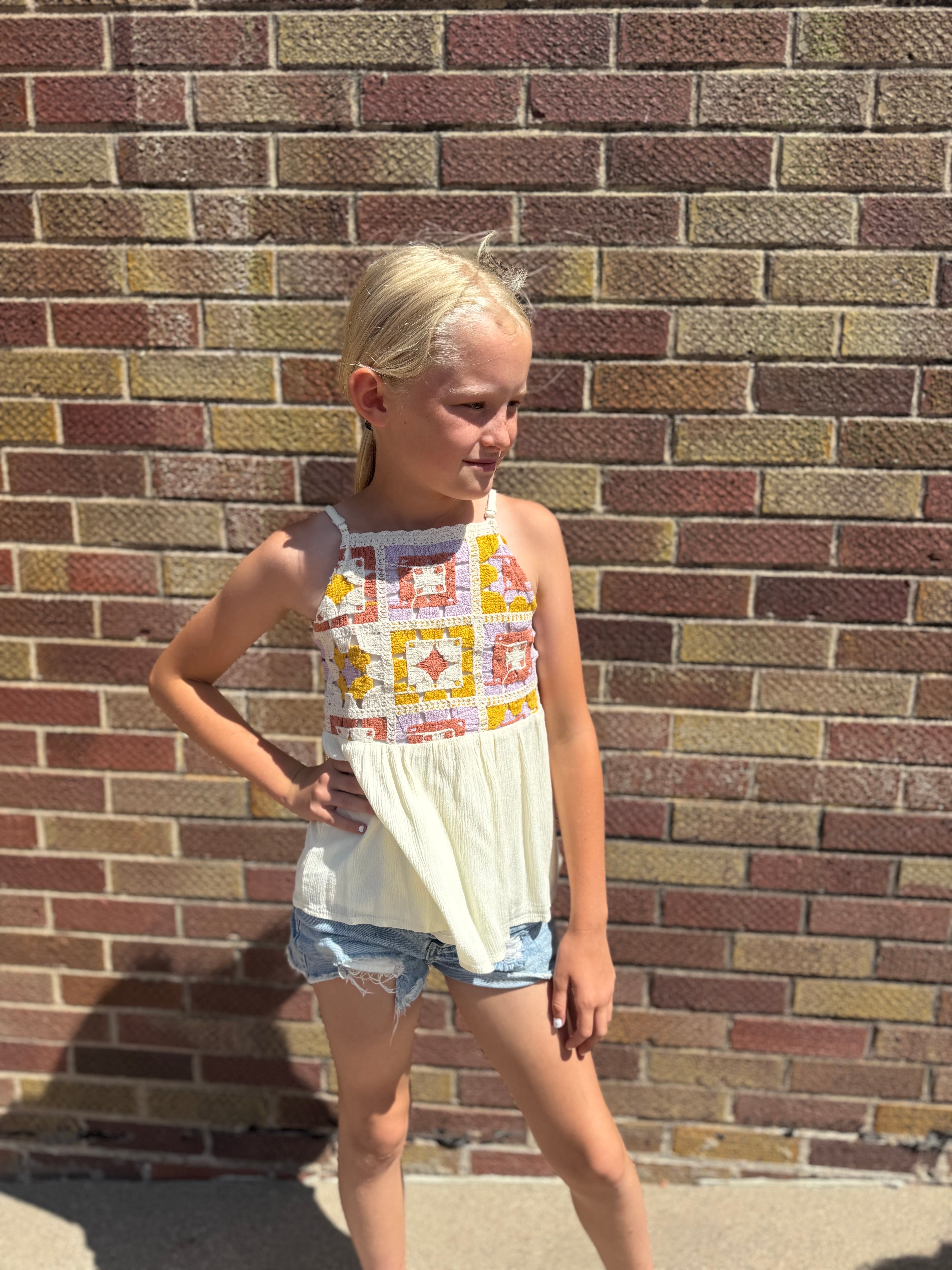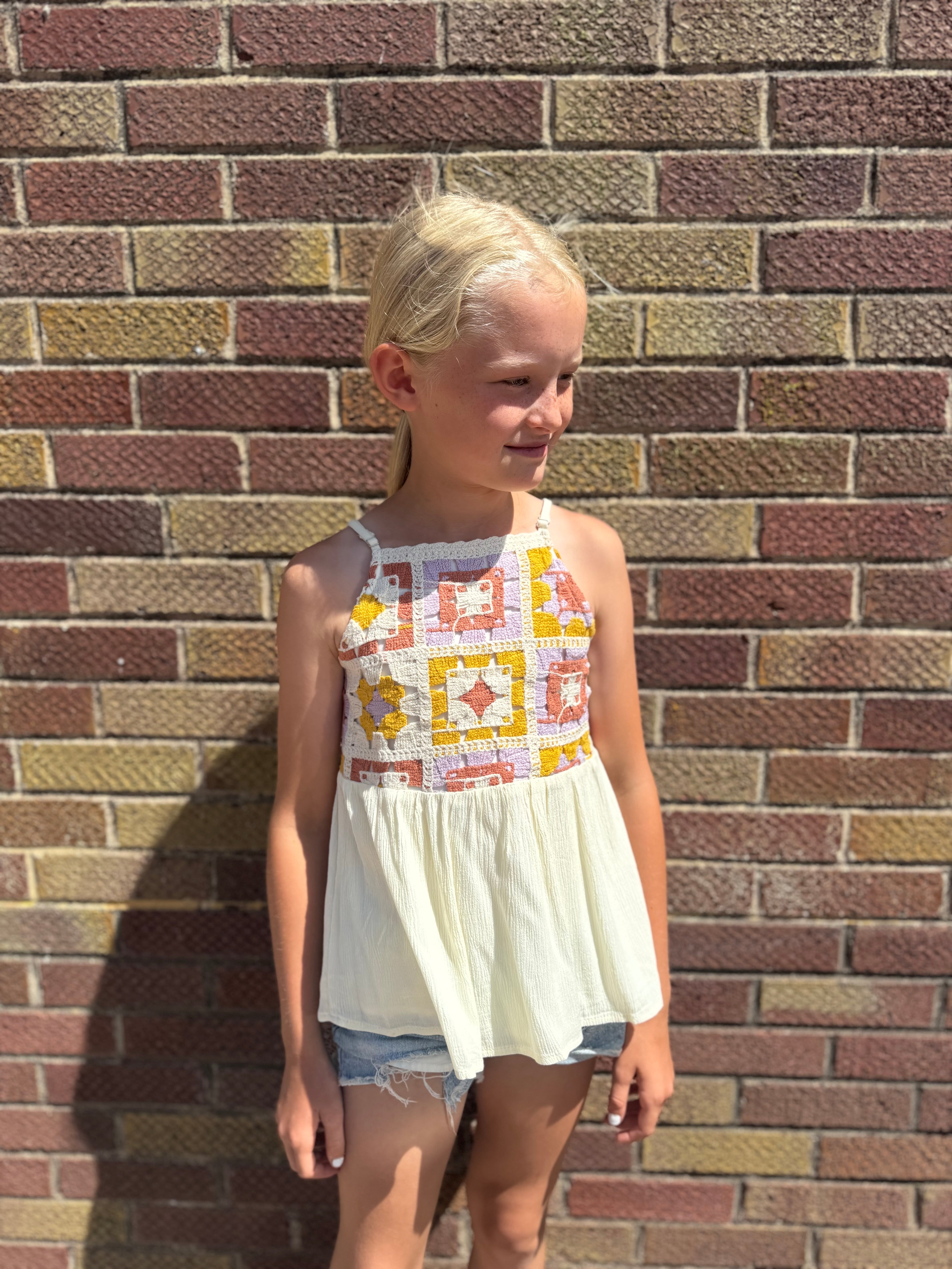 Experience ultimate comfort and style with our Girls Crochet Paneled Babydoll Tank. Featuring adjustable straps and a lined crochet bodice, this tank is perfect for any occasion, you'll love the versatile and trendy design of this must-have summer essential.