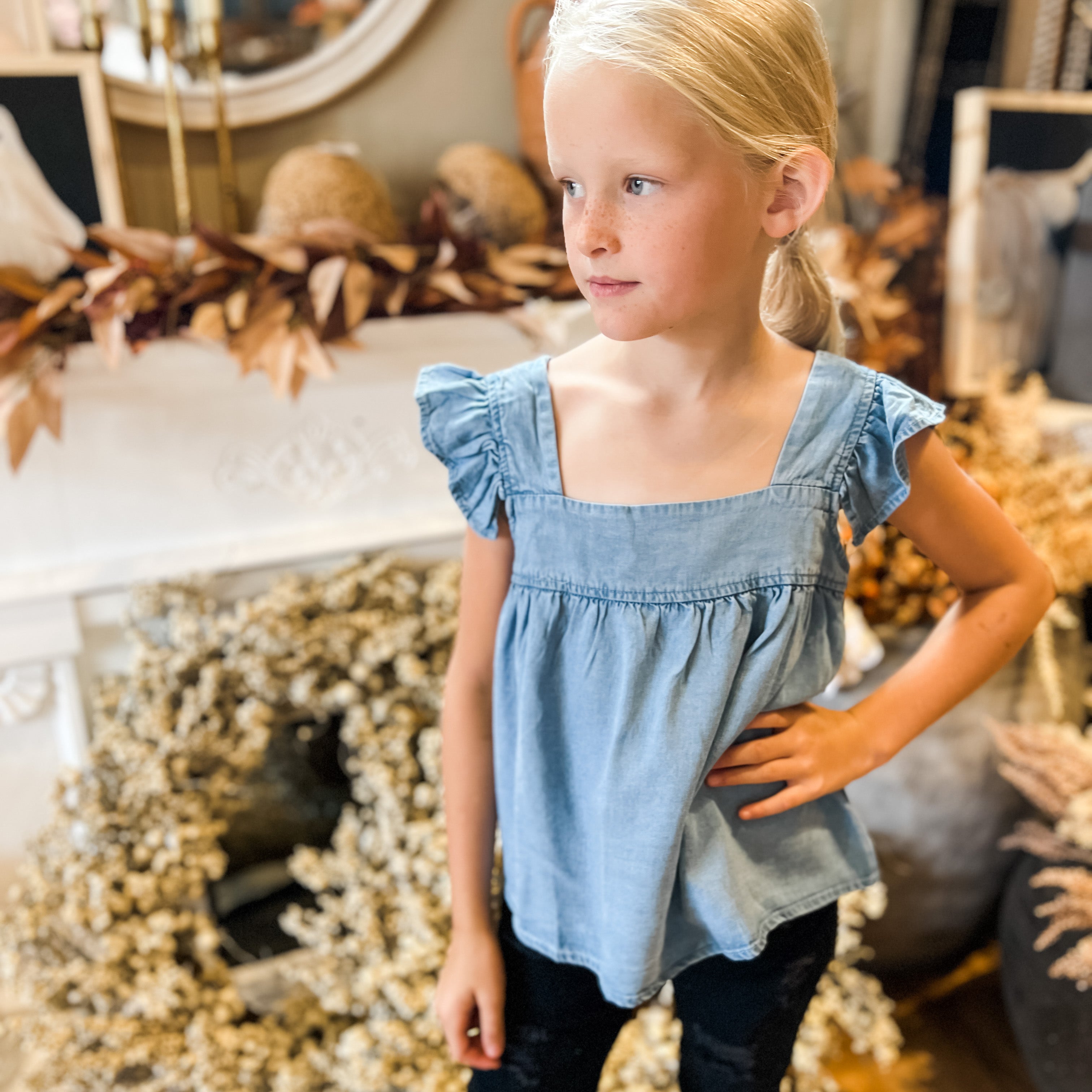 Description: This Girls Tencel Square Neck Ruffle Sleeve Top is perfect for your little fashionista. Crafted with 100% Tencel fabric, this light denim top is lightweight, breathable, and stylish. A square neck and ruffle sleeves add an extra touch of flair, making this top perfect for any occasion.