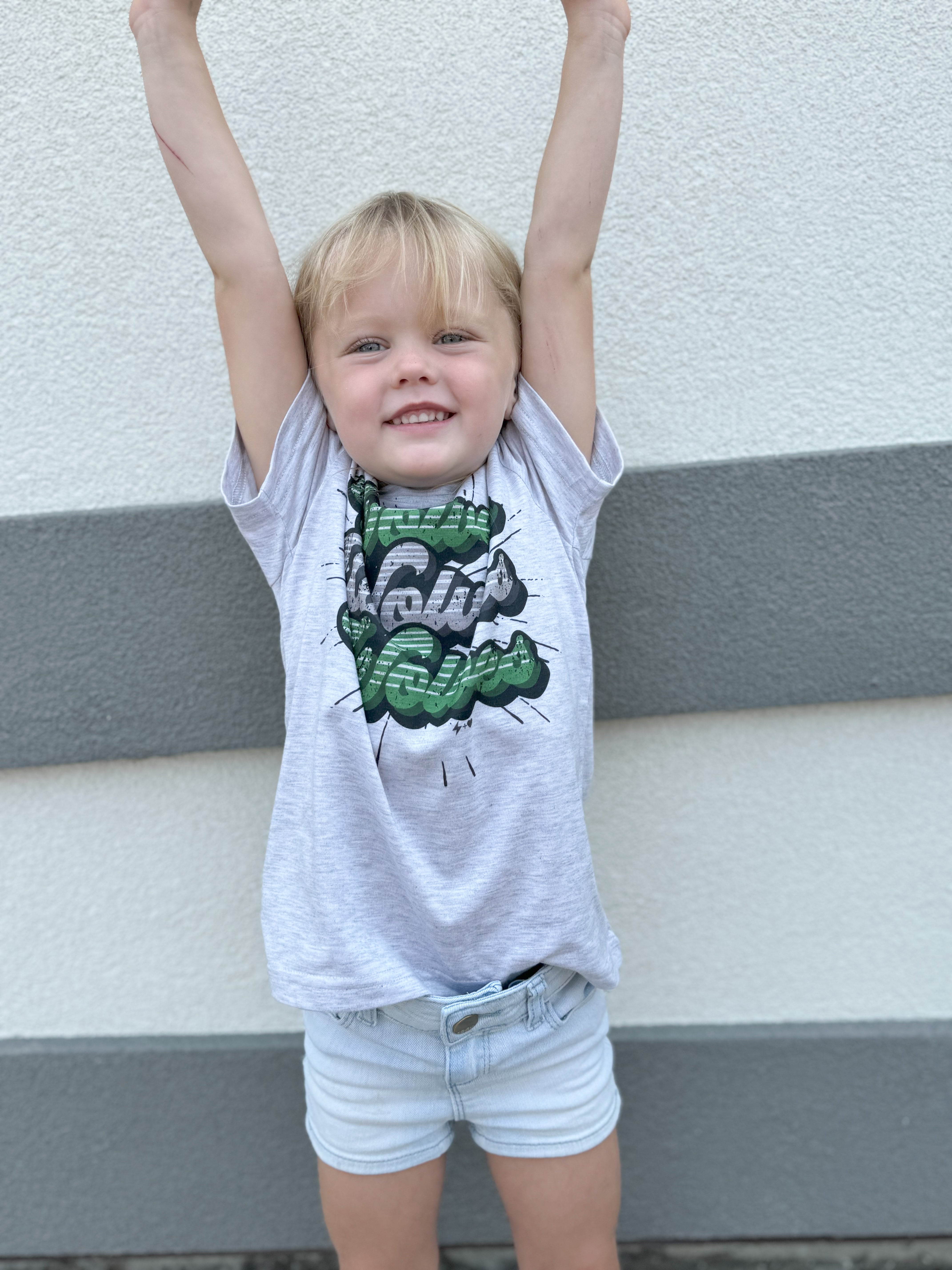 This spirit tee is perfect for all the little wolves! The Grey and Green repeating 'Wolves' logo is the shirts' highlight and makes it perfect for your little Wolves!