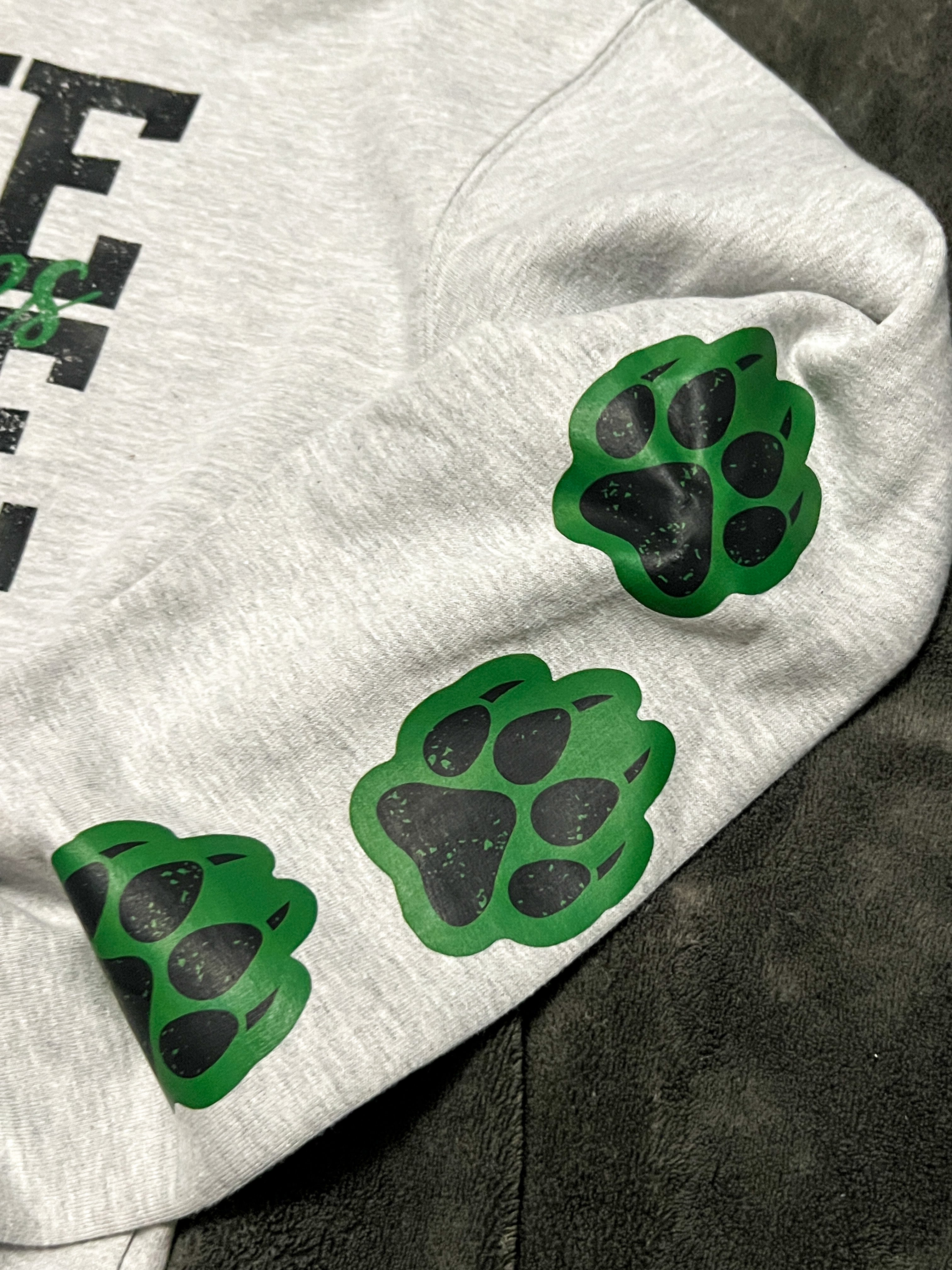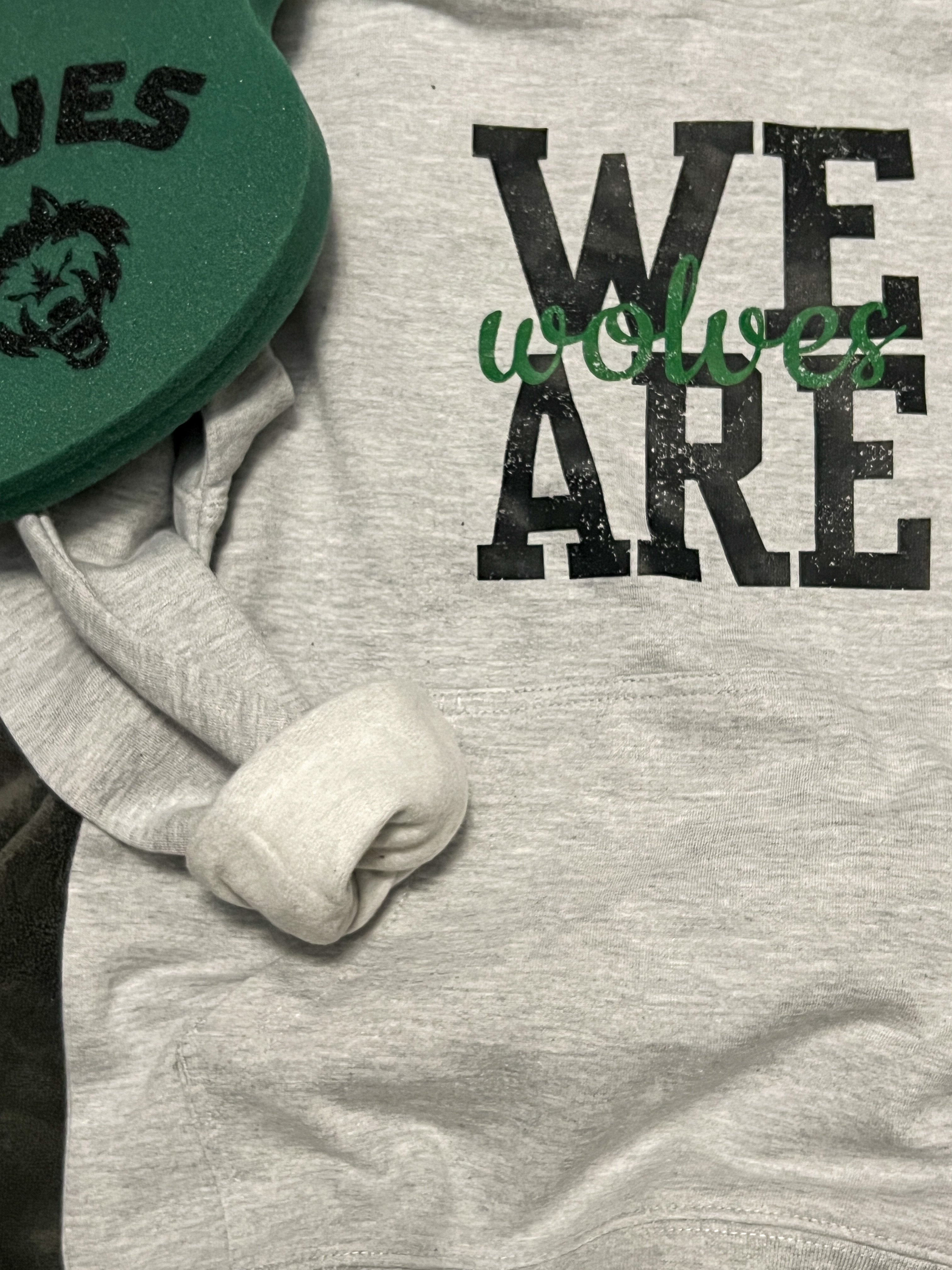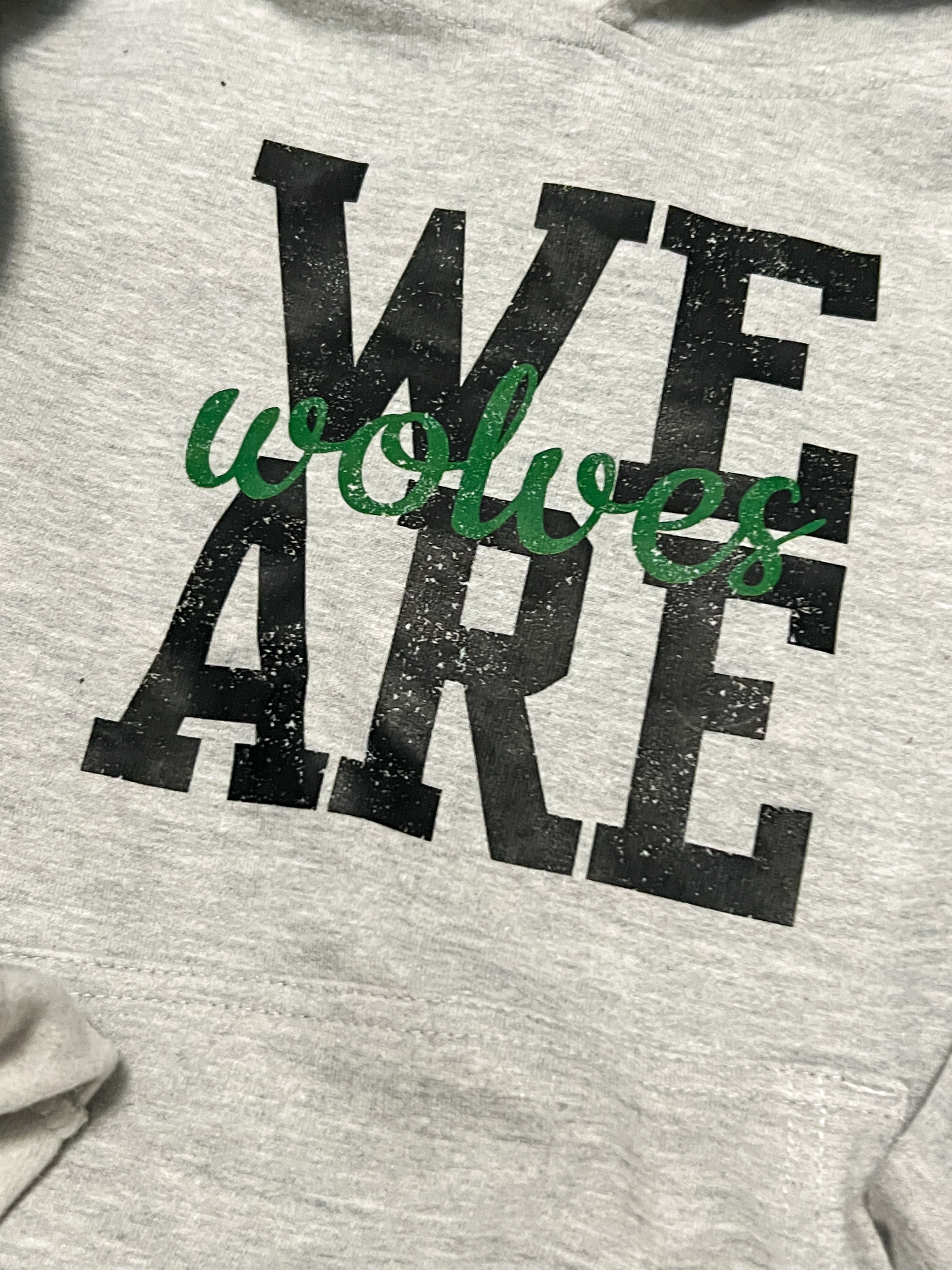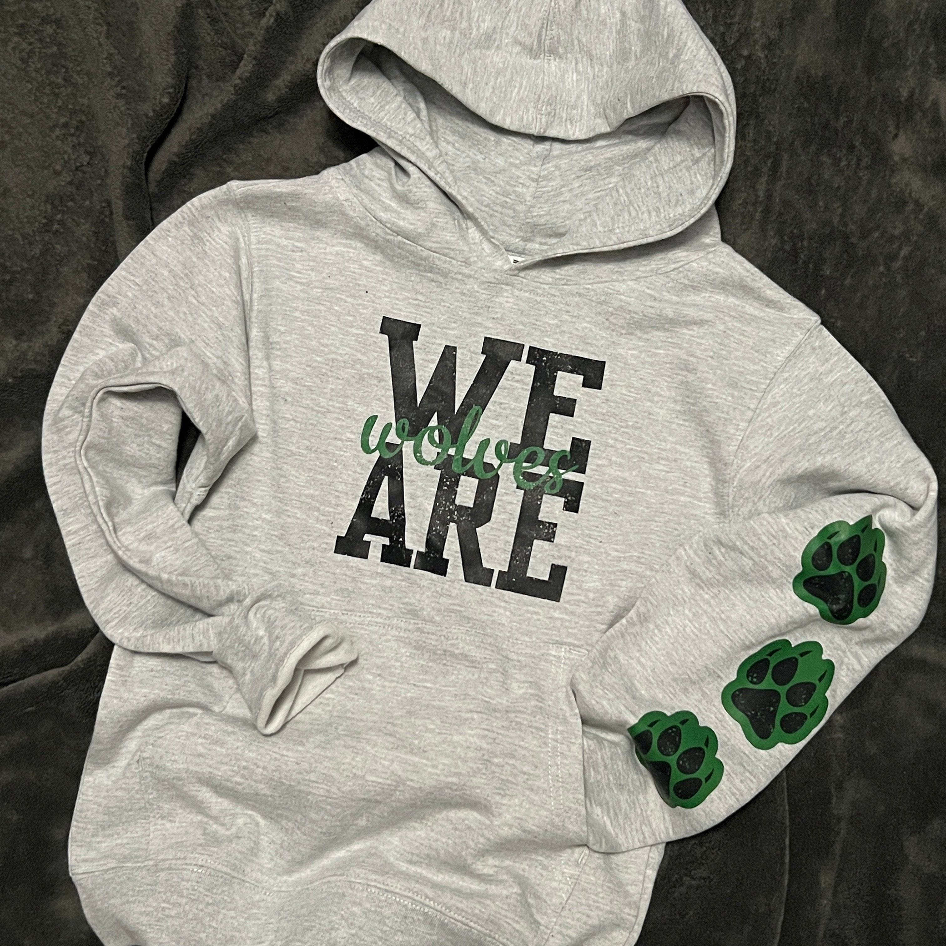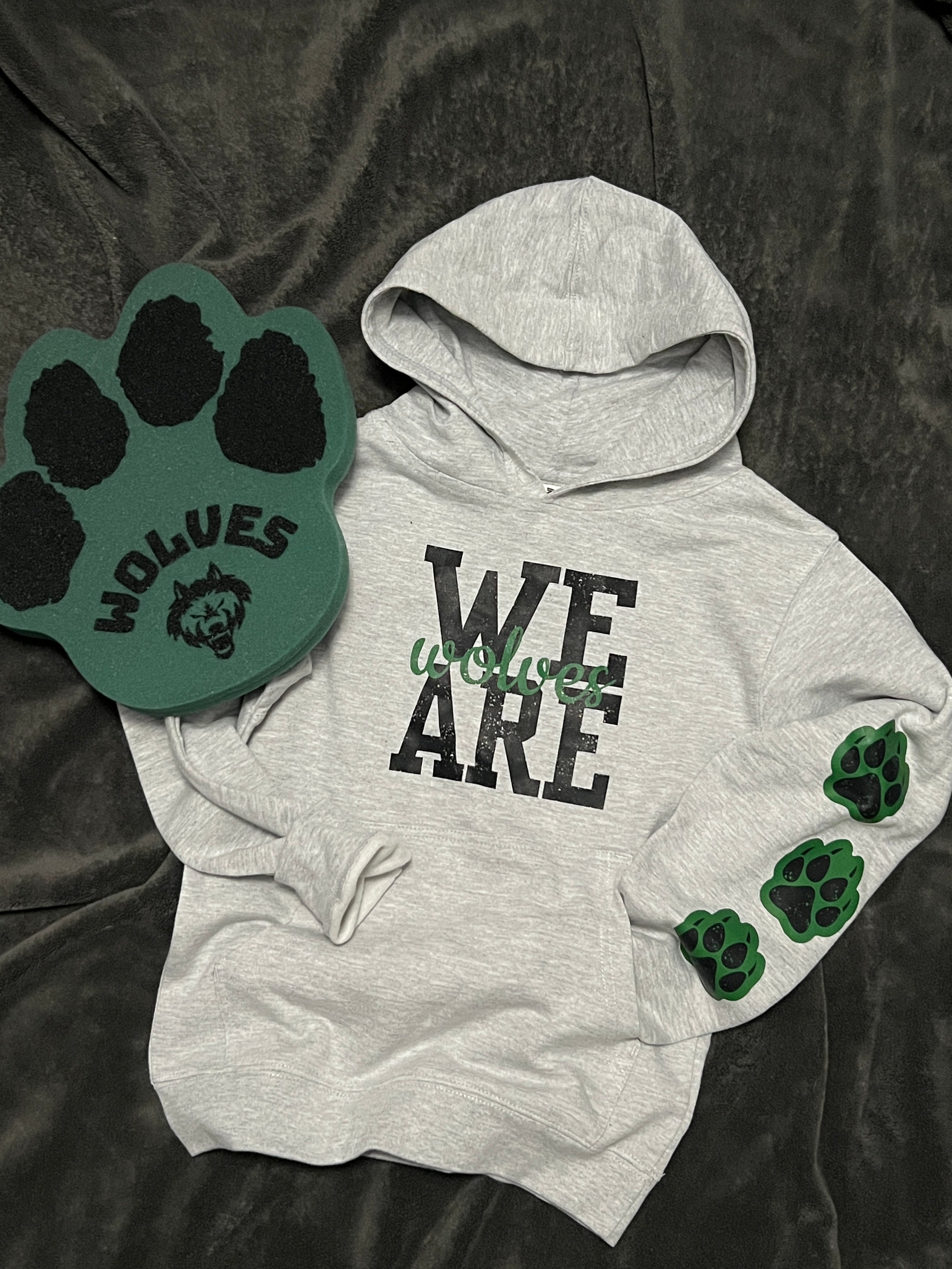 Independent trading company brand heathered athletic grey hoodie in youth sizes. Super soft and lightly fleece lined. “We are wolves” graphic on front with three black paw prints with green background on left lower sleeve.