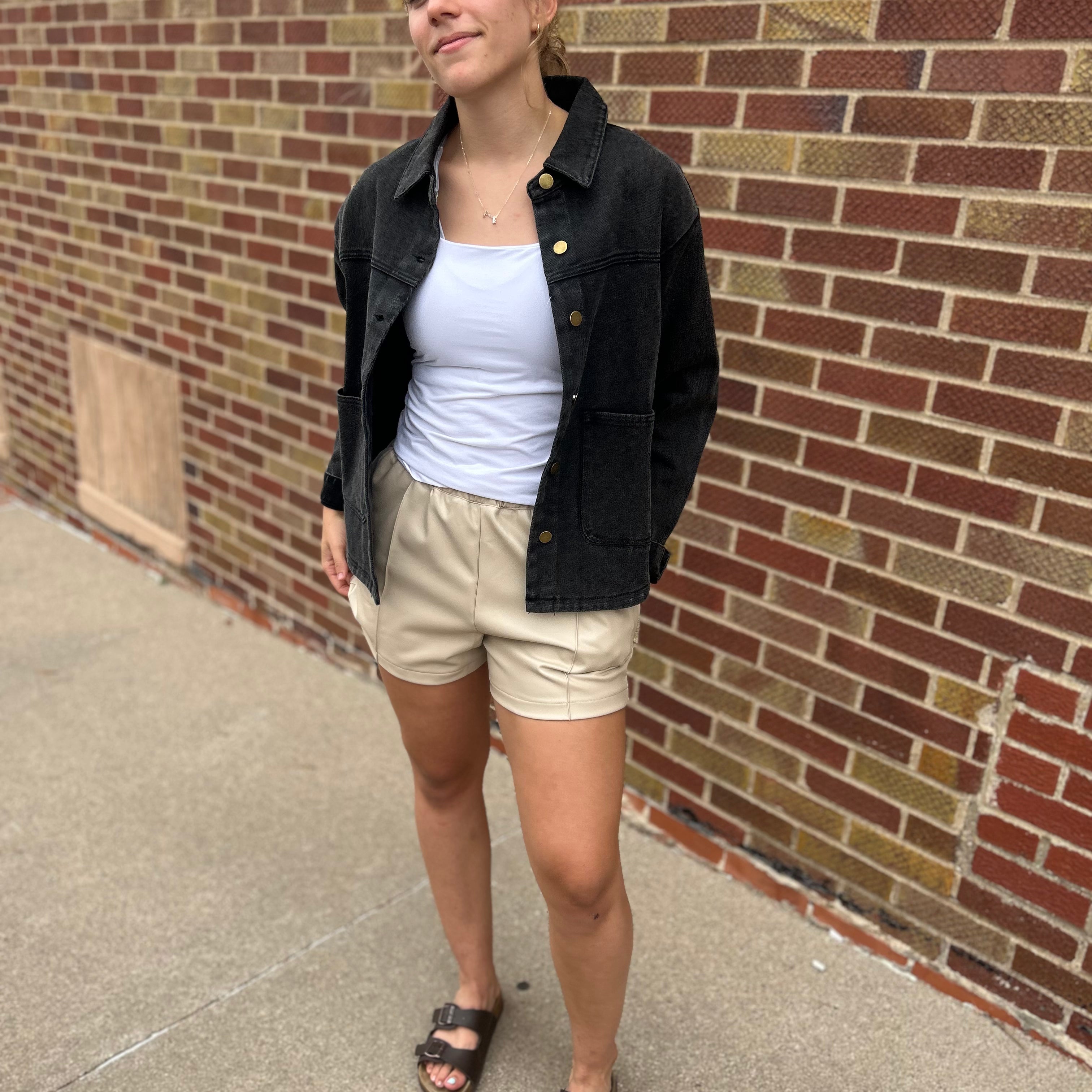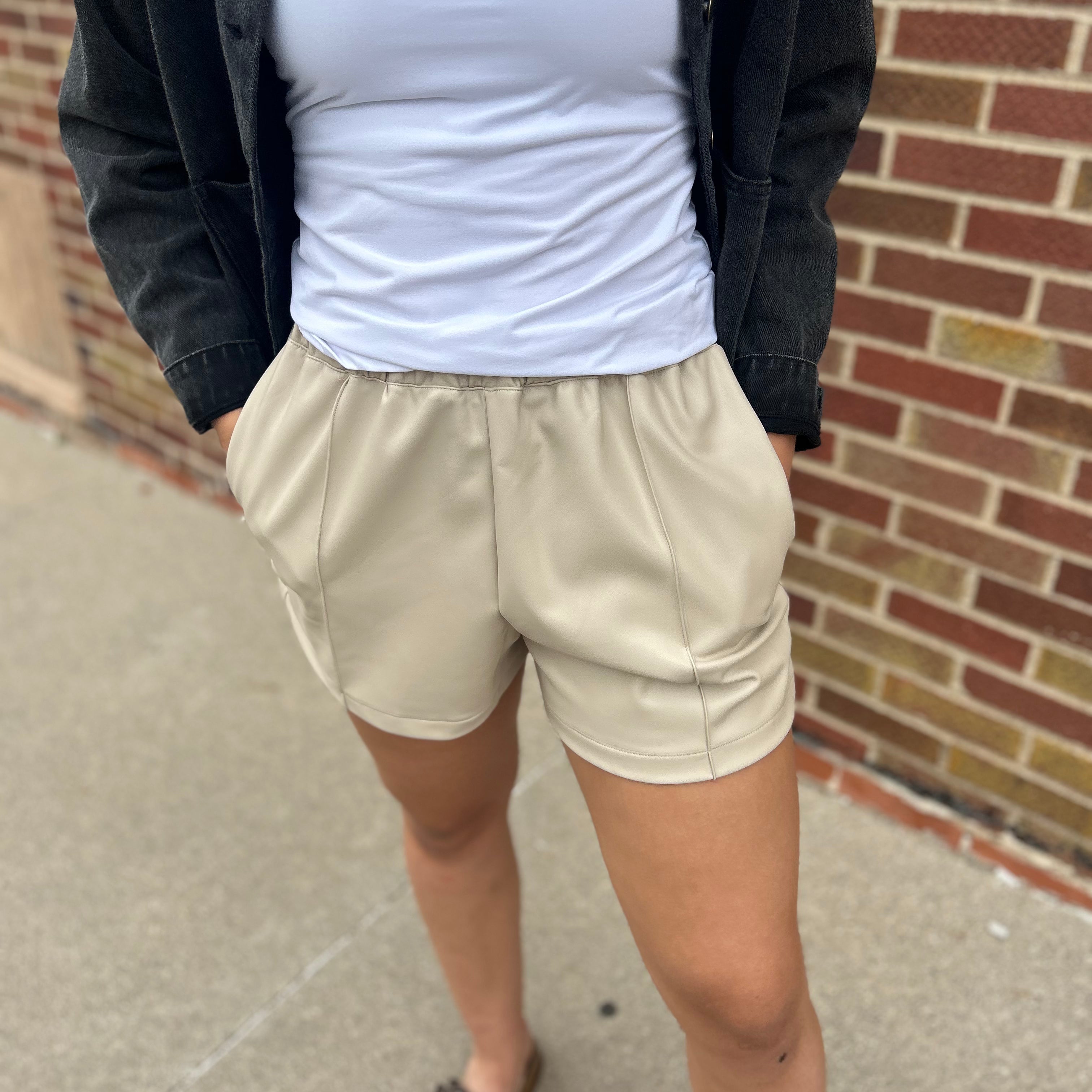 These taupe colored, vegan leather shorts offer both style and functionality. With pockets for added convenience, they are the perfect addition to any wardrobe.