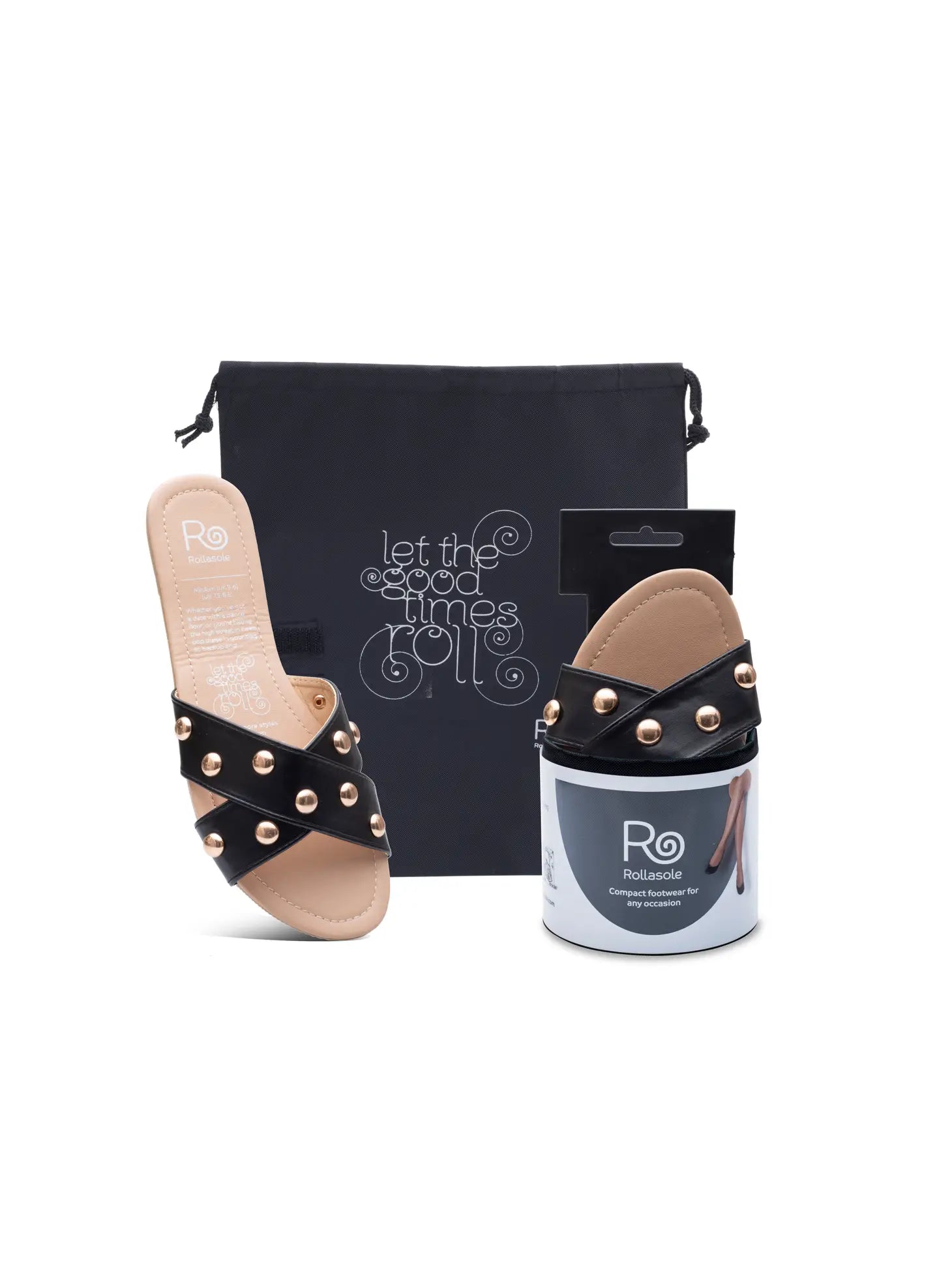 You kept asking and we listened…we’ve spent a year designing your perfect handbag accessory. Welcome to our exclusive Rollasole folded sandal. So comfortable, so compact and so cute. These gorgeous black studded sandals will be your saviour for your best nights out
