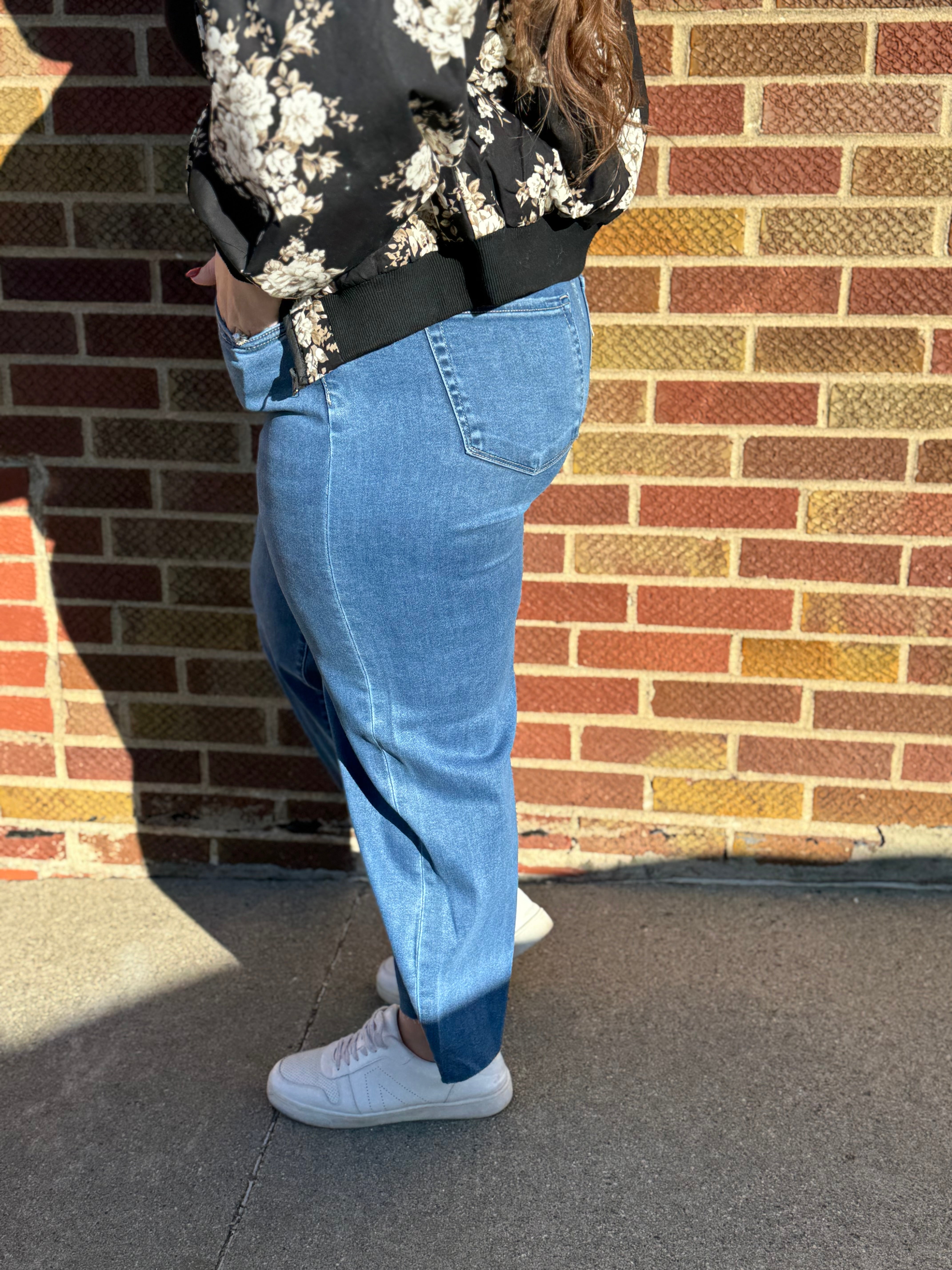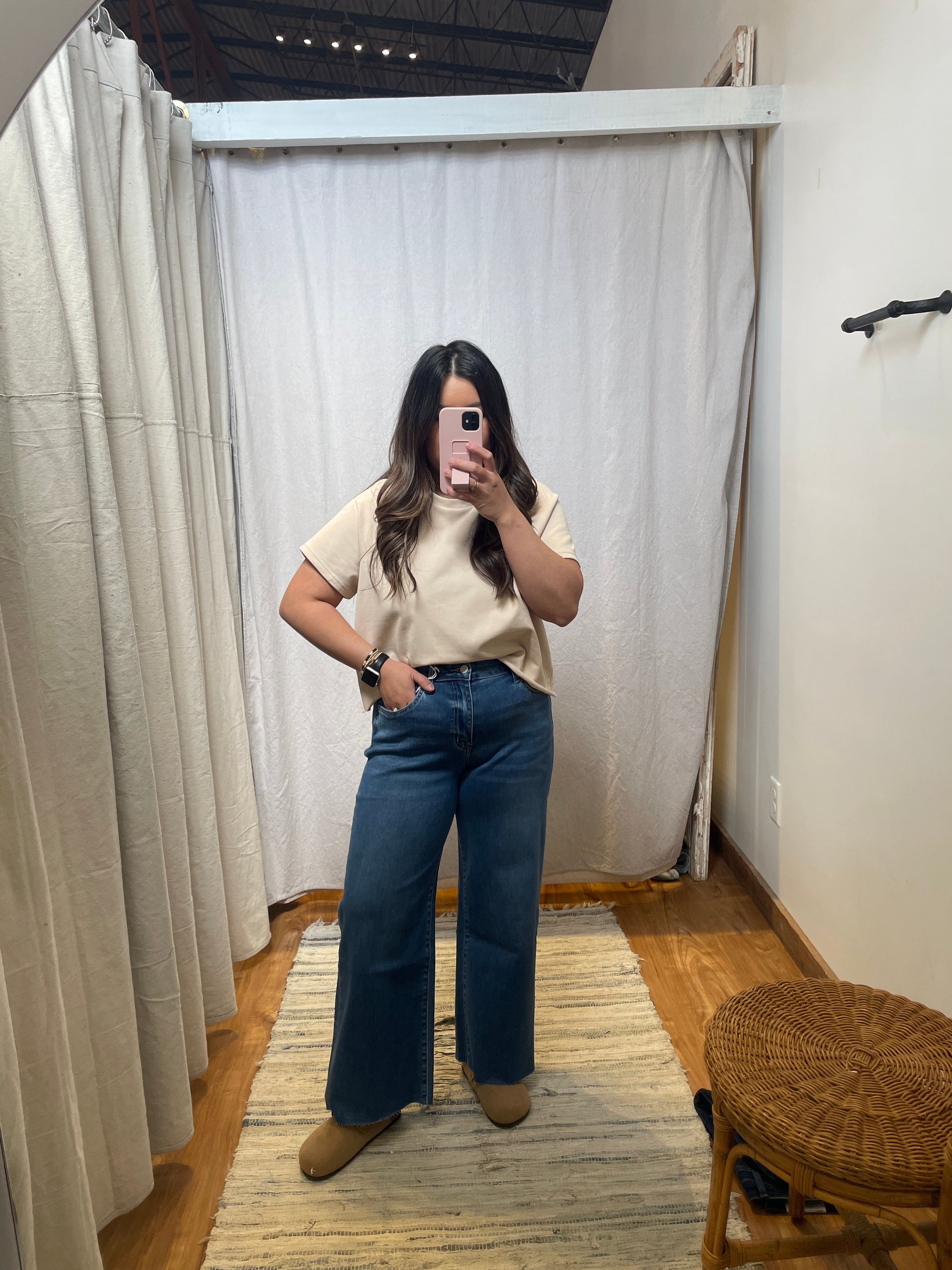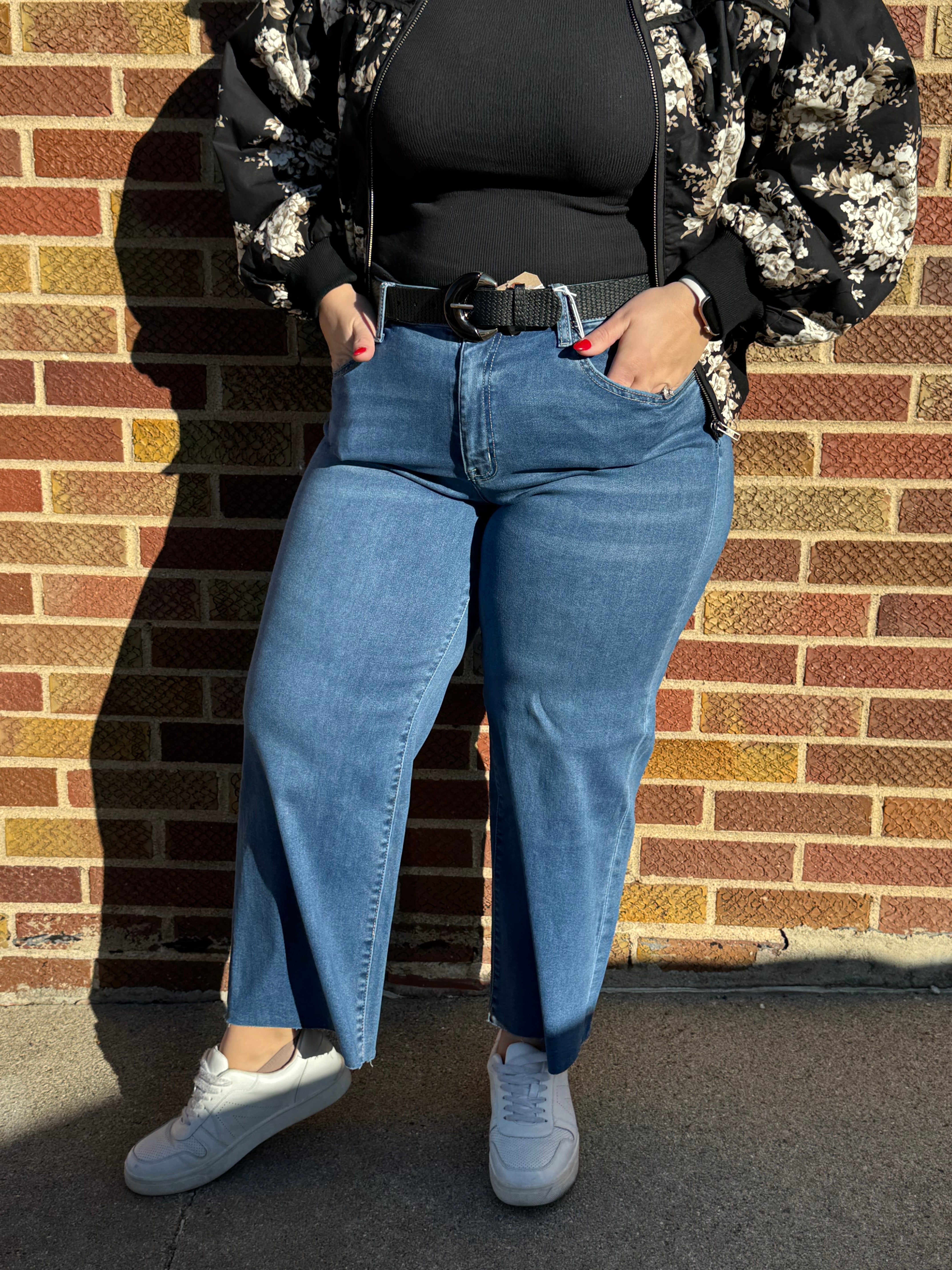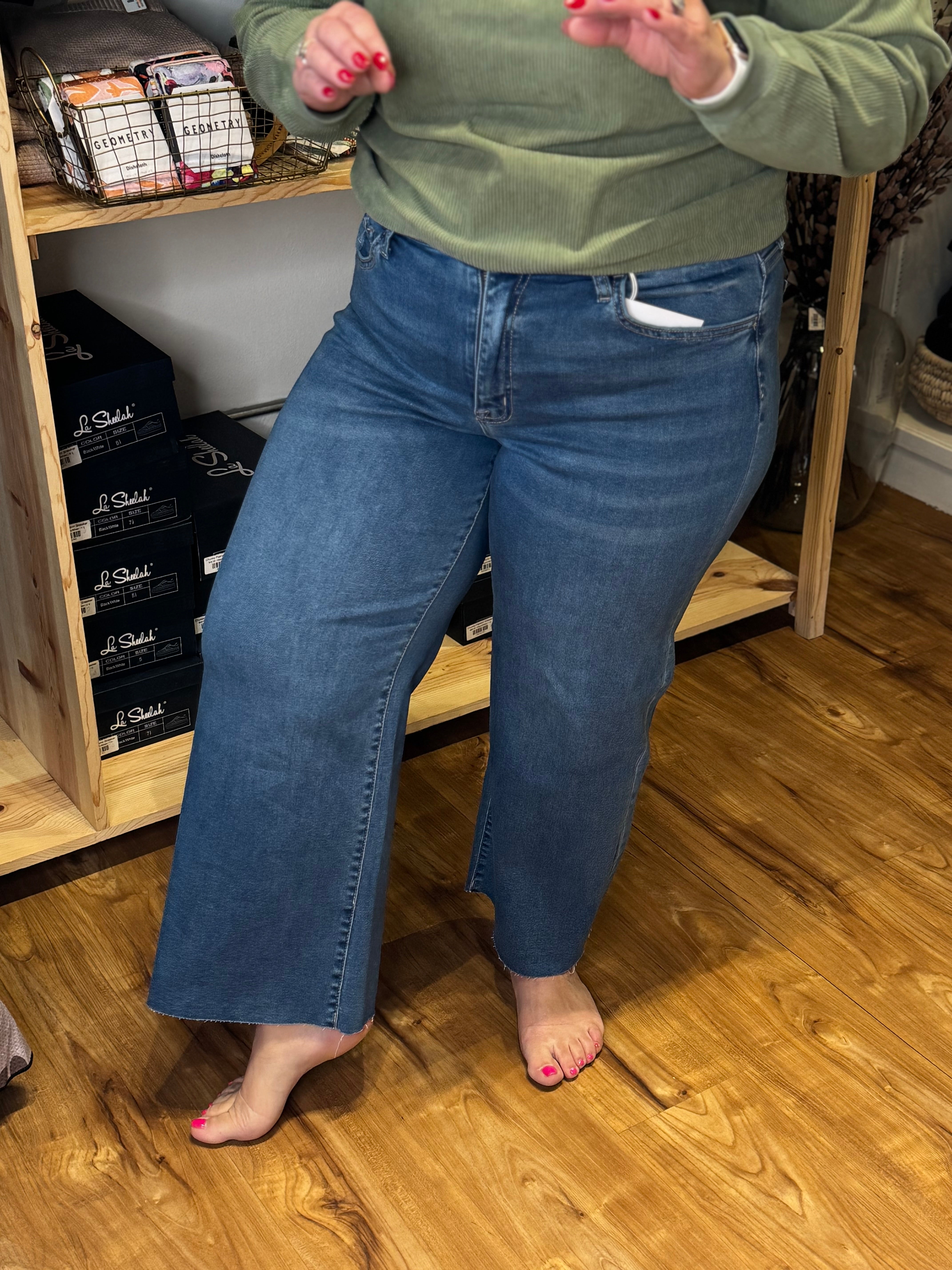 High rise clean cut raw hem crop slim wide jeans Comfort stretch denim, high rise waist, clean cut raw hem, cropped length, slim wide jeans F. Rise: 10" / inseam: 27" / leg opening: 21"
