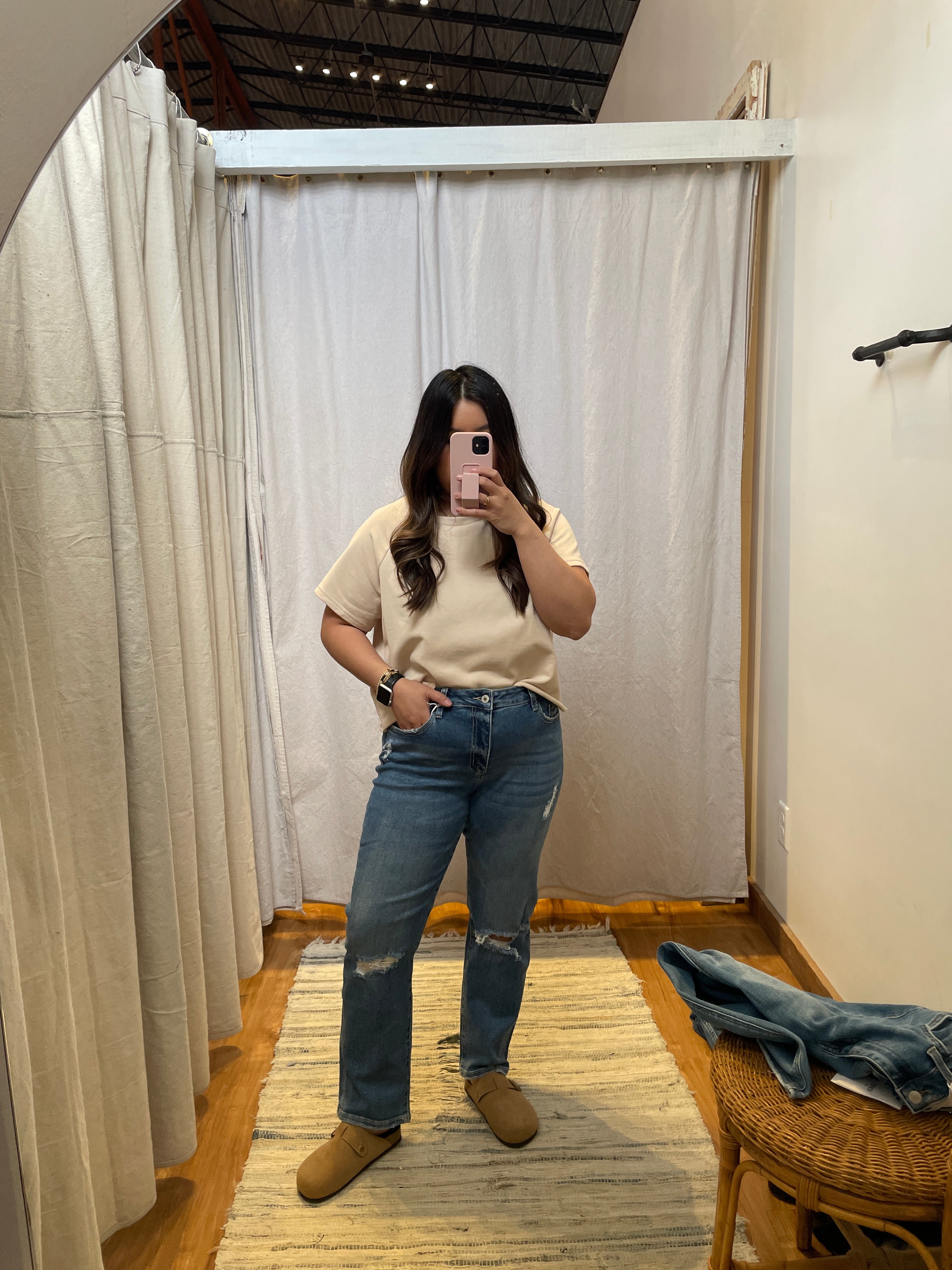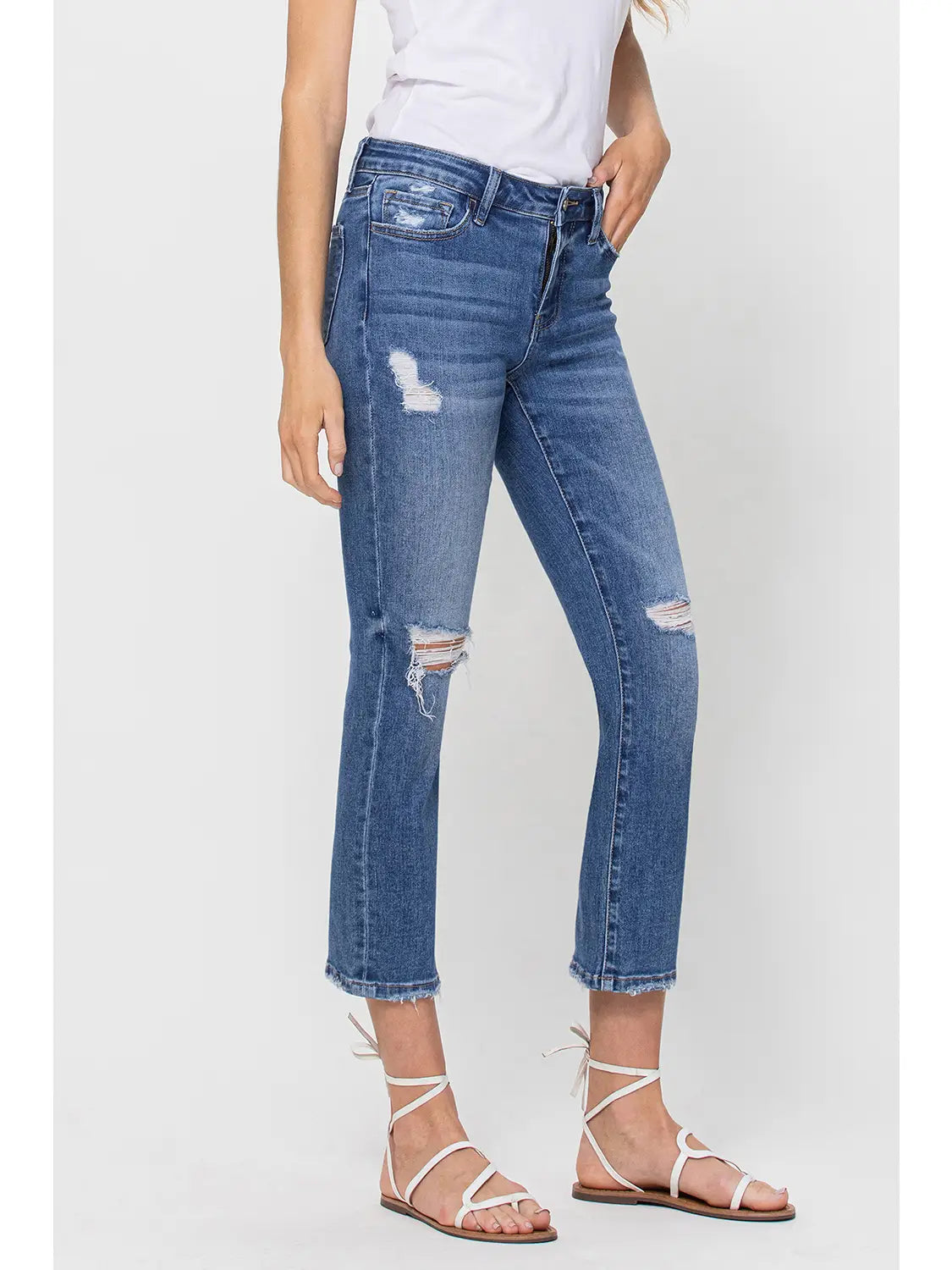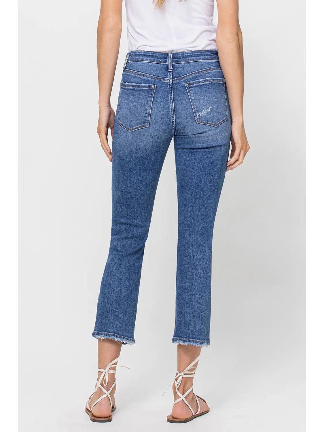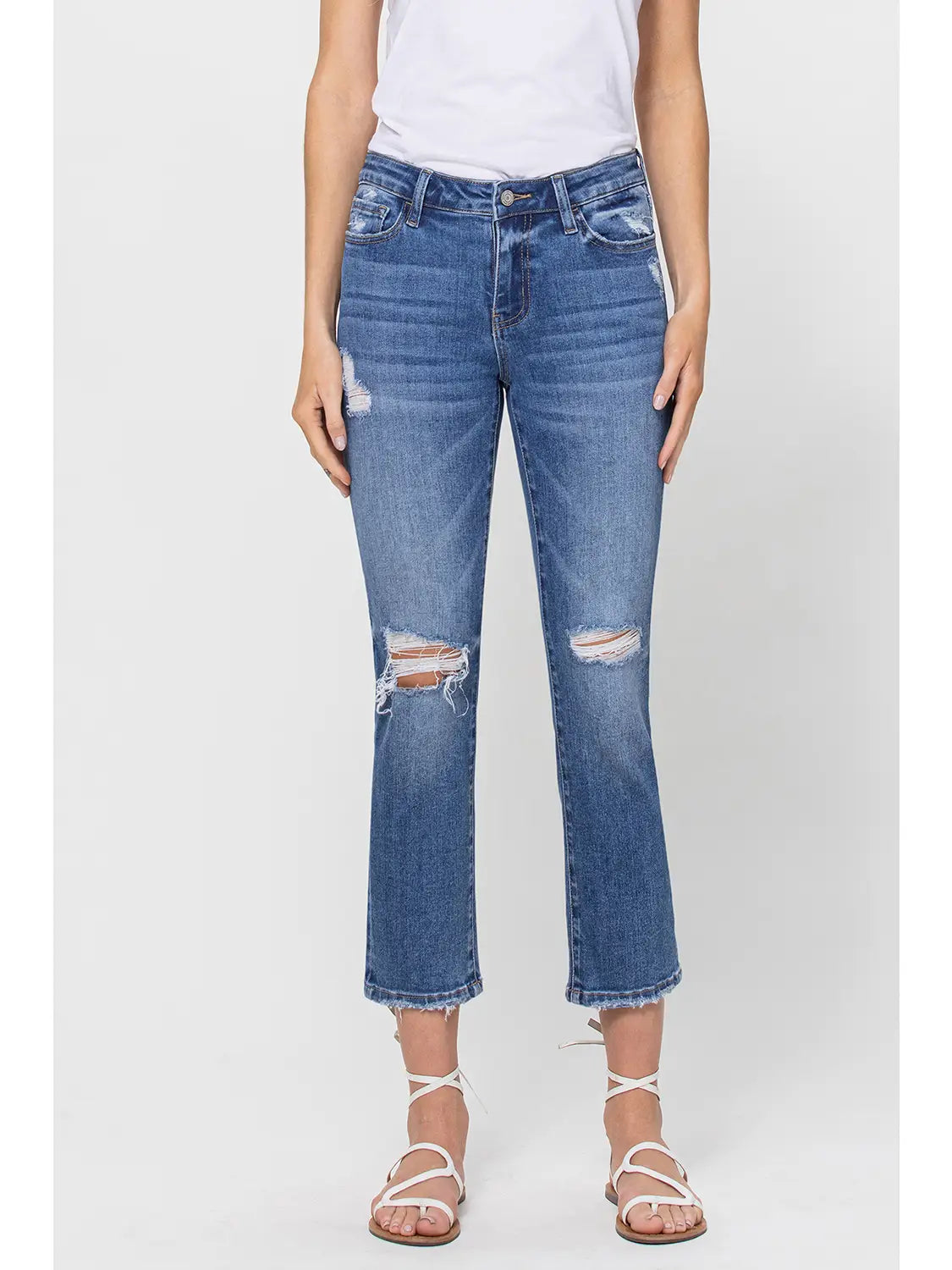 MID RISE ANKLE REGULAR STRAIGHT JEANS COMFORT STRETCH DENIM, MID RISE WAIST, SLIGHT DISTRESSED DETAIL, RAW HEM, ANKLE LENGTH, STRAIGHT JEANS F. RISE: 9 1/4" / INSEAM: 28" / LEG OPENING: 15''