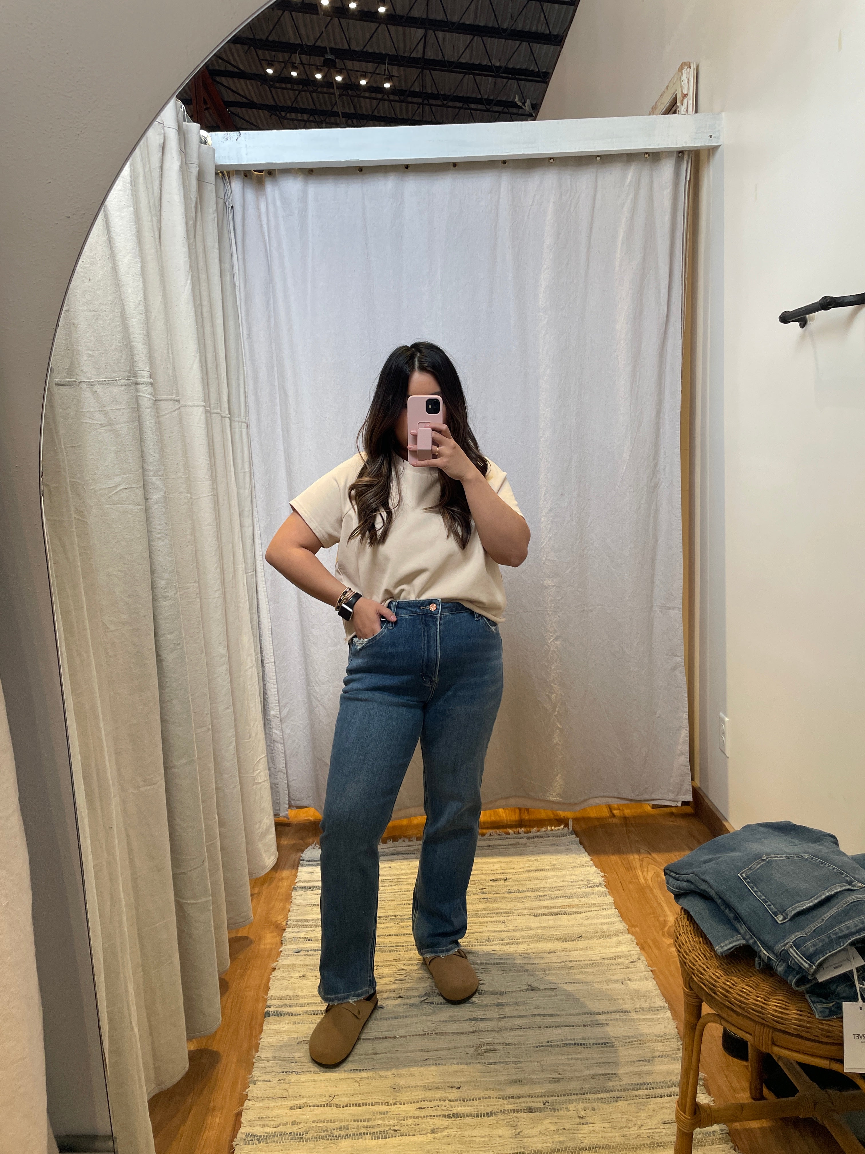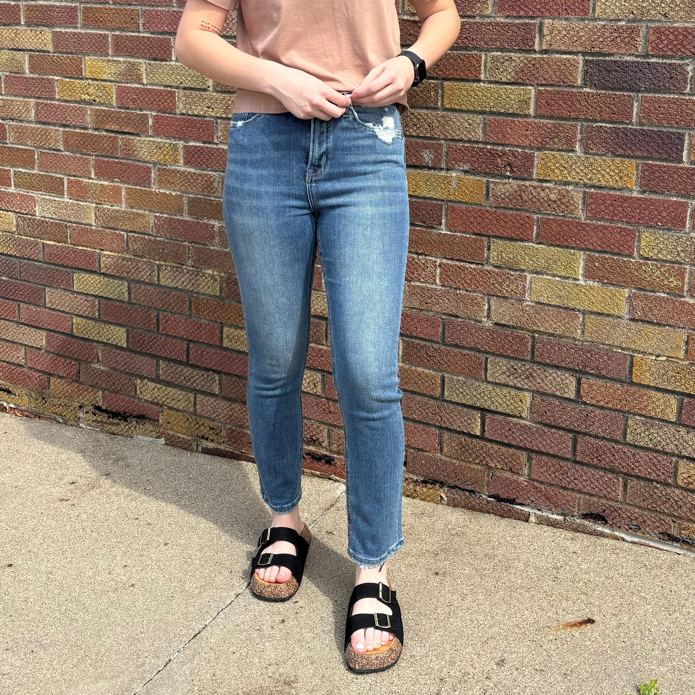 SUPER HIGH RISE ANKLE SLIM STRAIGHT JEANS COMFORT STRETCH DENIM, SUPER HIGH RISE WAIST, SLIGHT DISTRESSED DETAIL, ANKLE LENGTH, SLIM STRAIGHT JEANS F. RISE: 11" / INSEAM: 28" / LEG OPENING: 13 1/2"