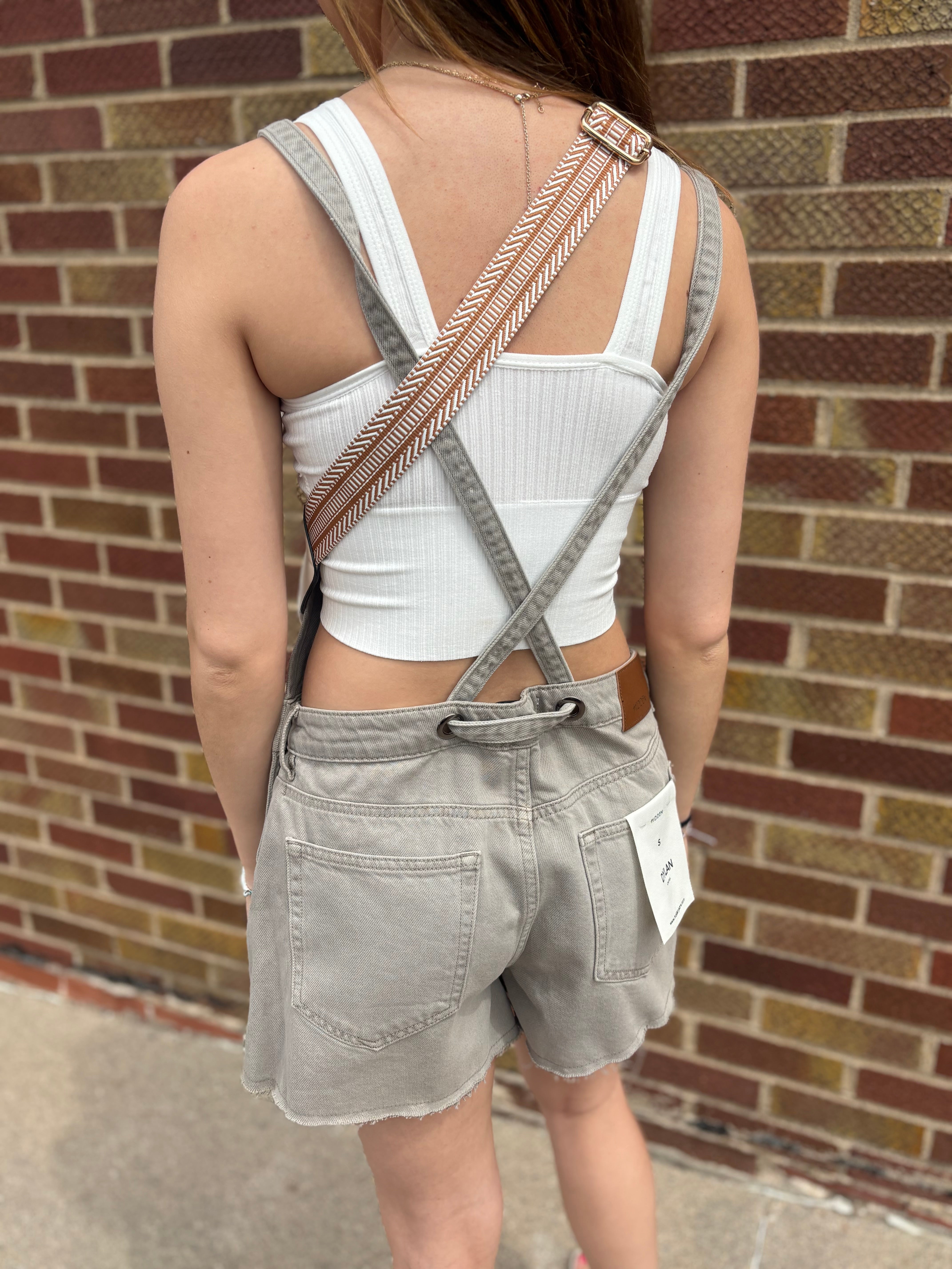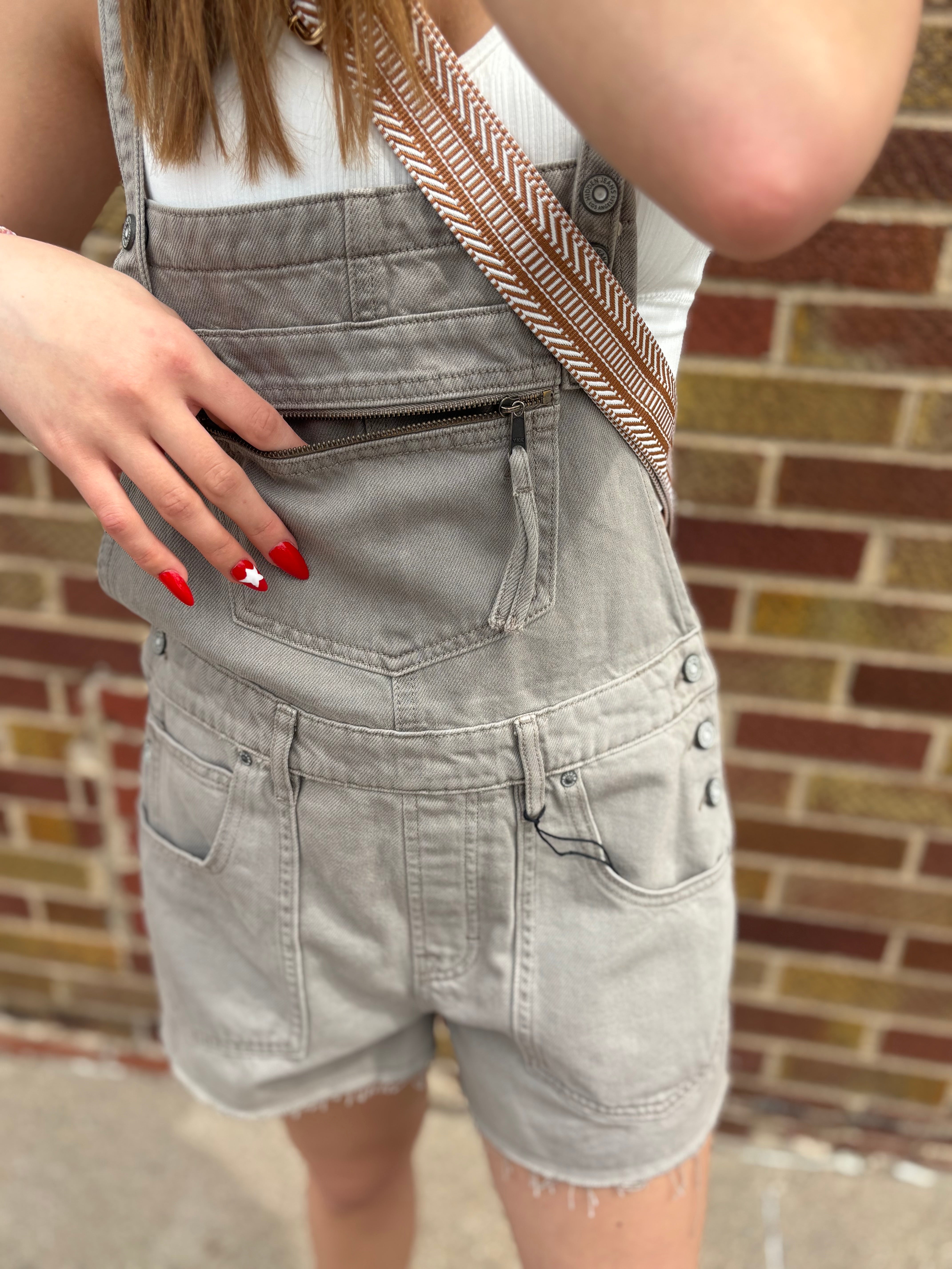 The Dylan Denim Shortalls combine functional design with modern style. Featuring a 3" inseam in washed gray denim, these shortalls offer a comfortable fit with cross-back straps for added support. Practicality meets convenience with multiple pockets, including a secure front zipper pocket, making them ideal for everyday wear.