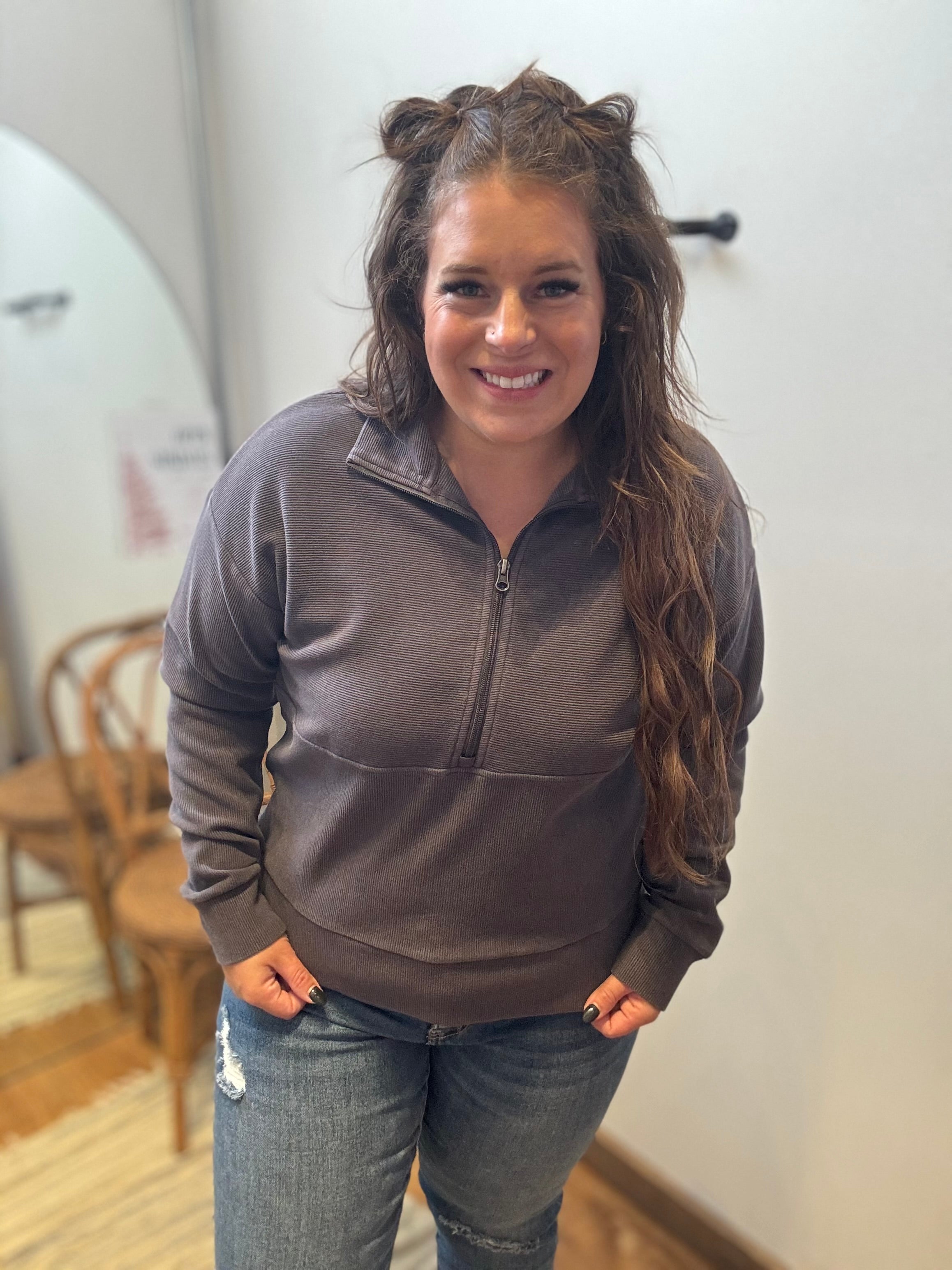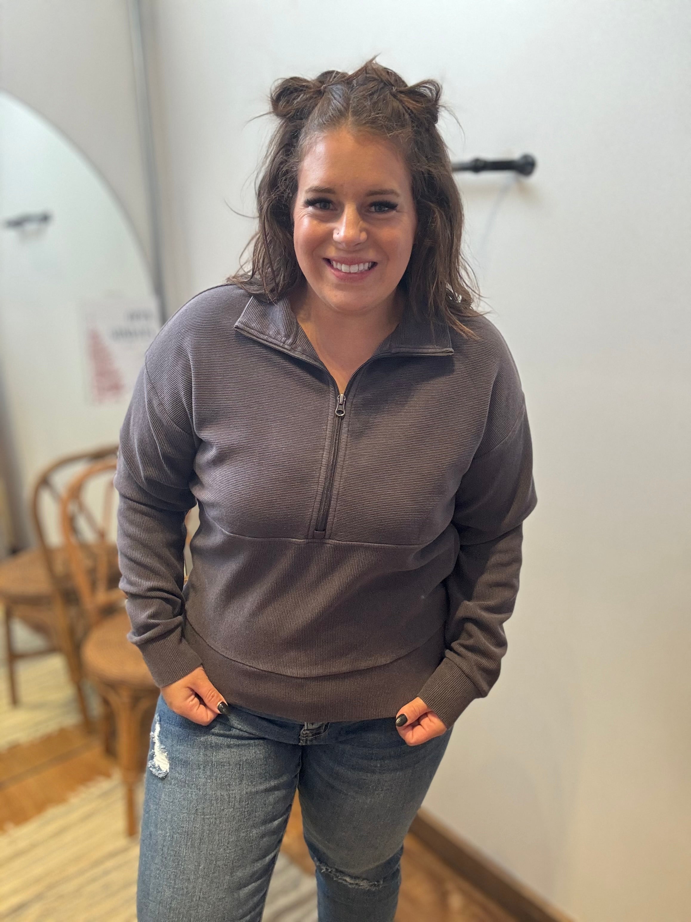 The Hazel Pullover is a corded garment with a 1/4 zip, long sleeves, and a mock turtleneck. Its unique design provides both style and functionality, making it a versatile addition to any wardrobe. The corded material adds texture while the 1/4 zip allows for easy temperature control.