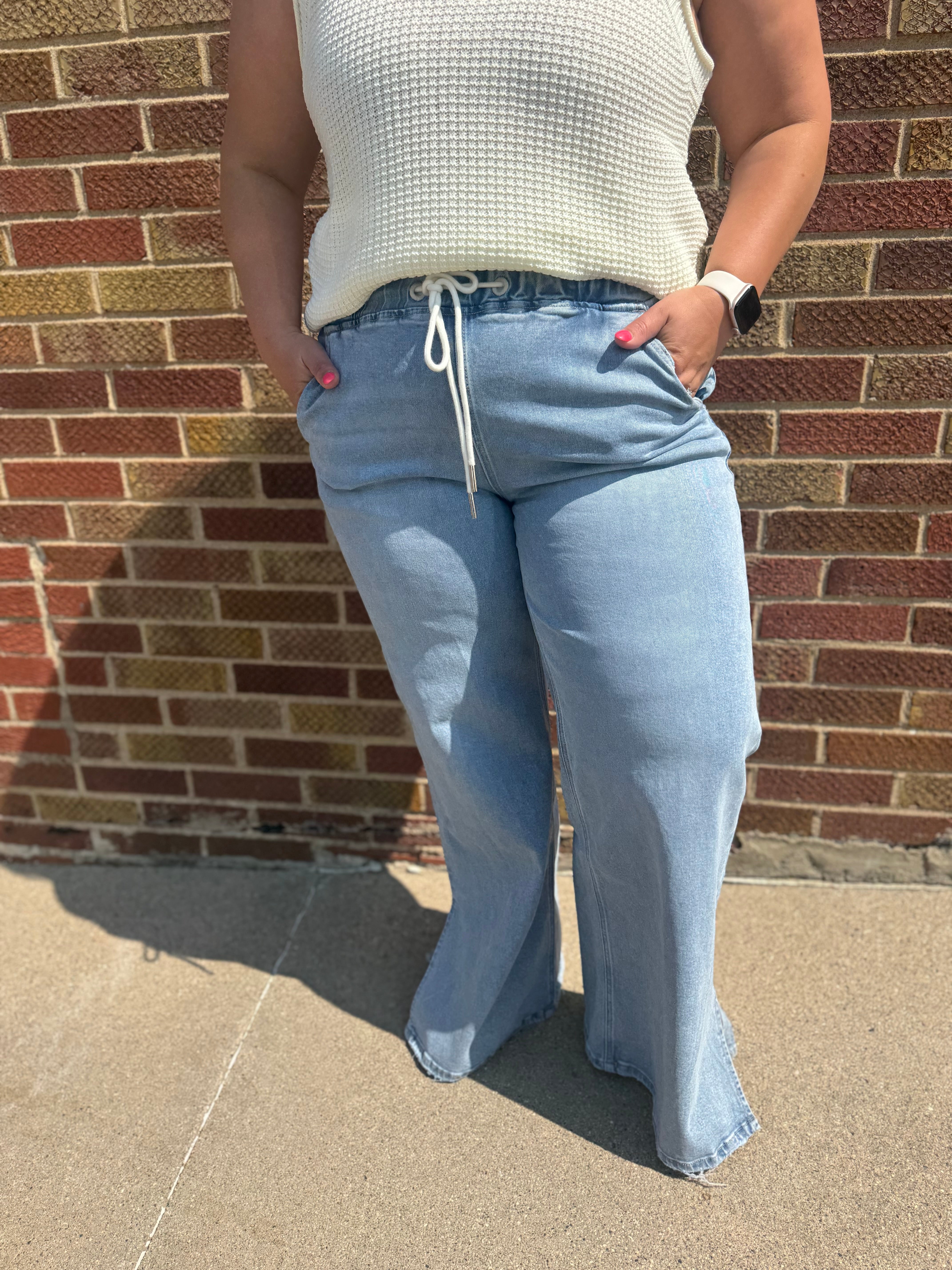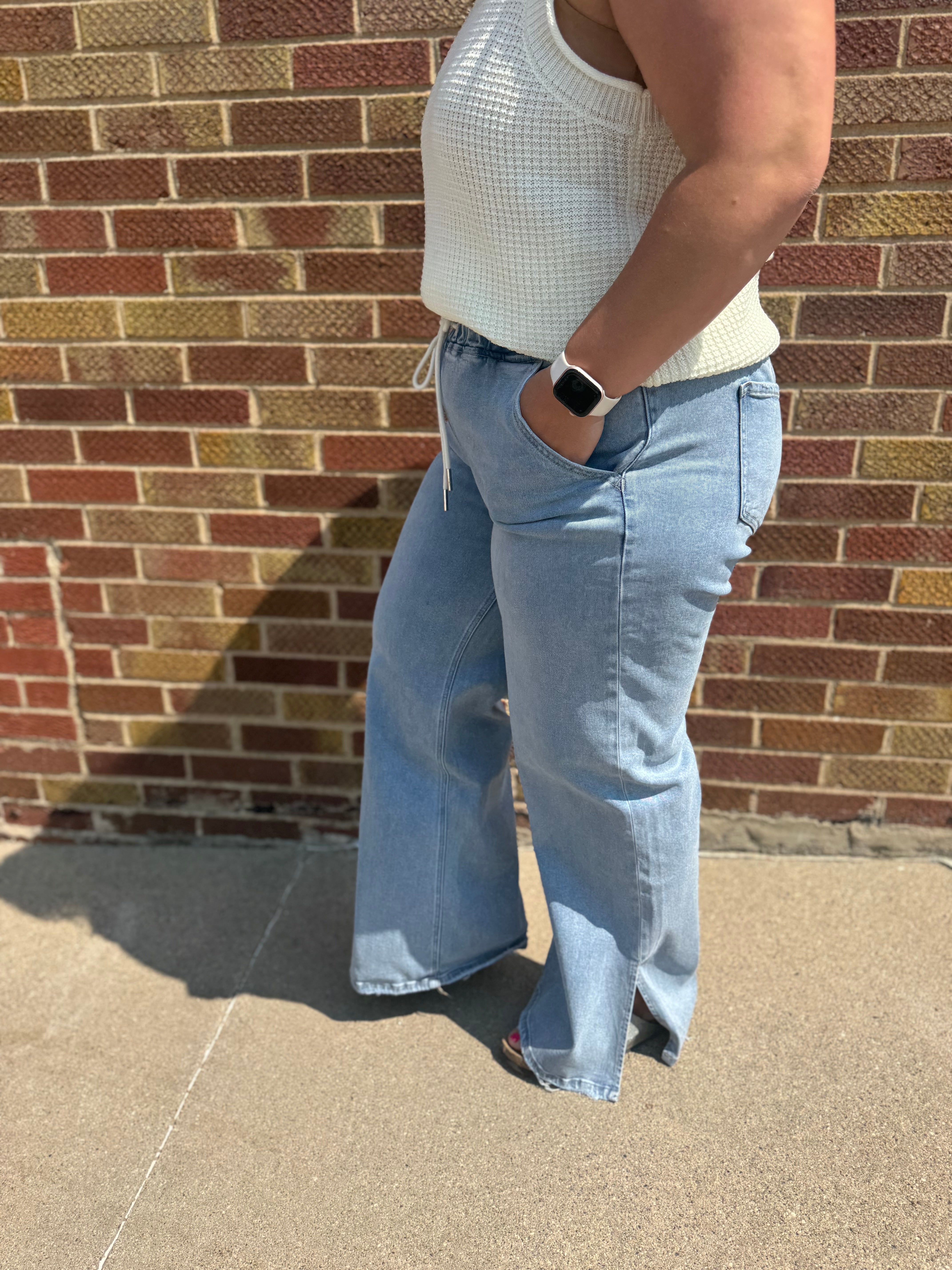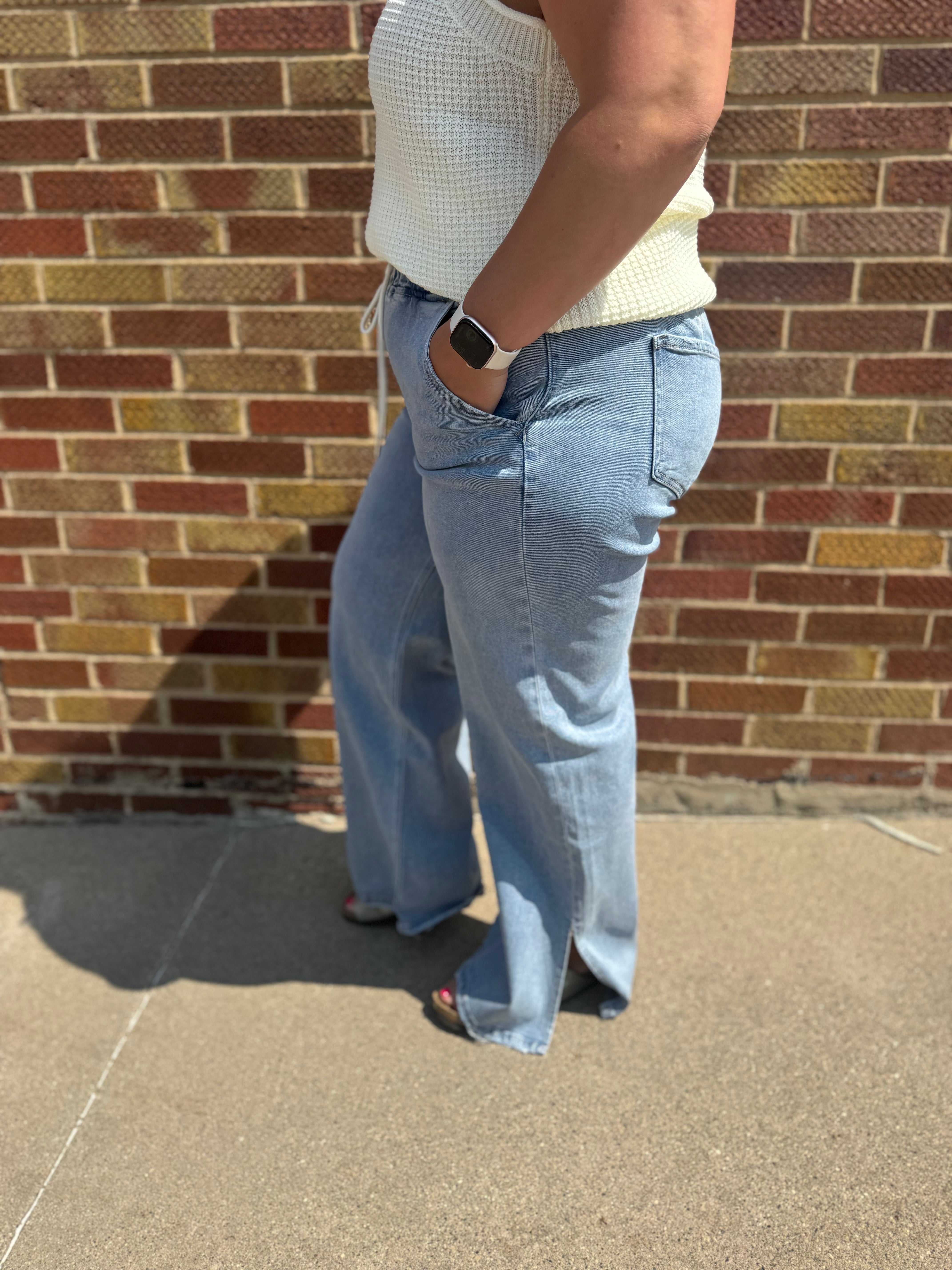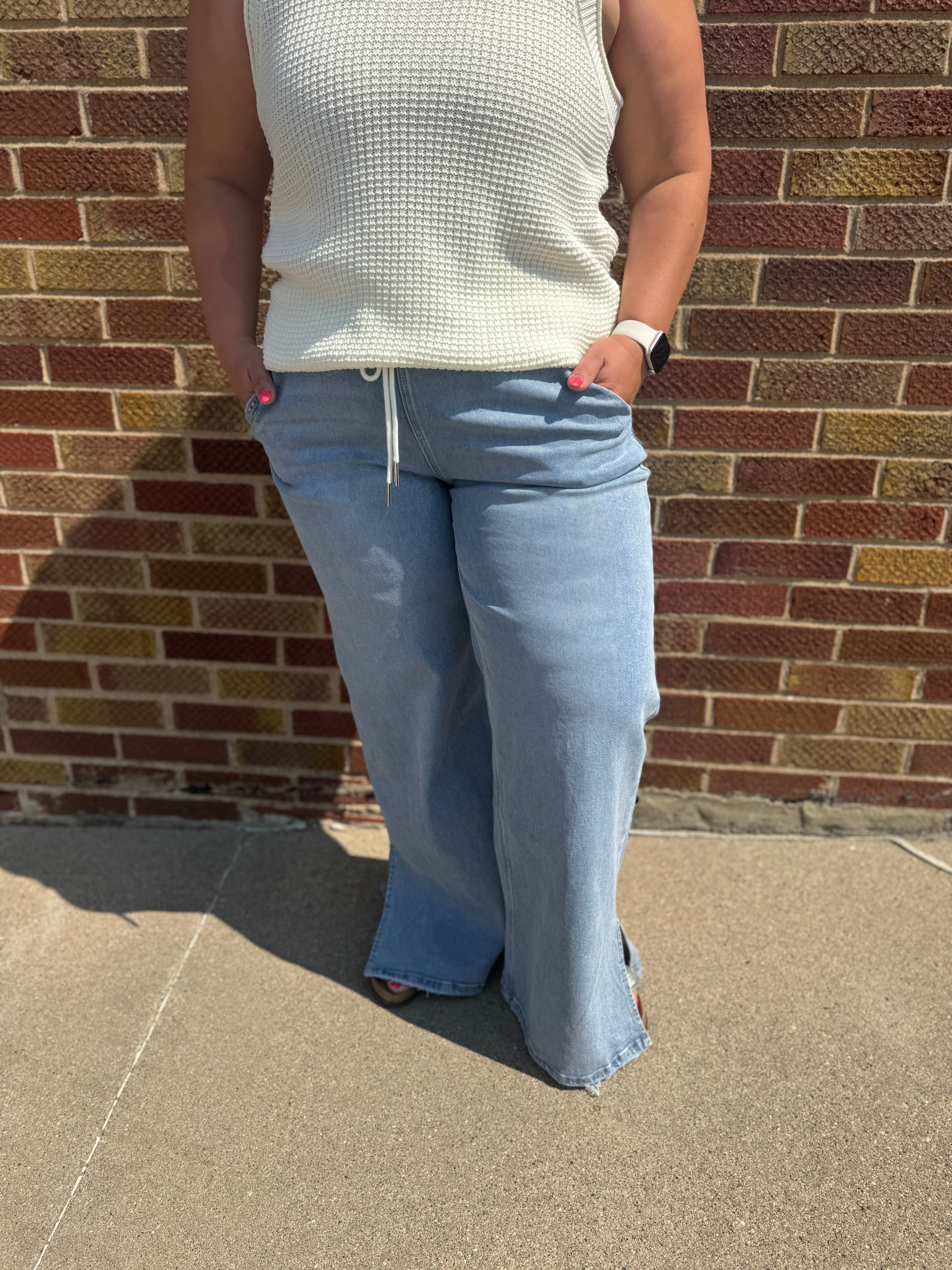 High rise drawstring waistband slit wide leg jeans Comfort stretch denim, high rise waist, drawstring waistband, side slit, full length, wide leg jeans F. Rise: 10 1/2" / inseam: 31" / leg opening: 24"
