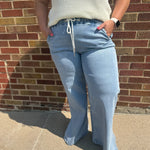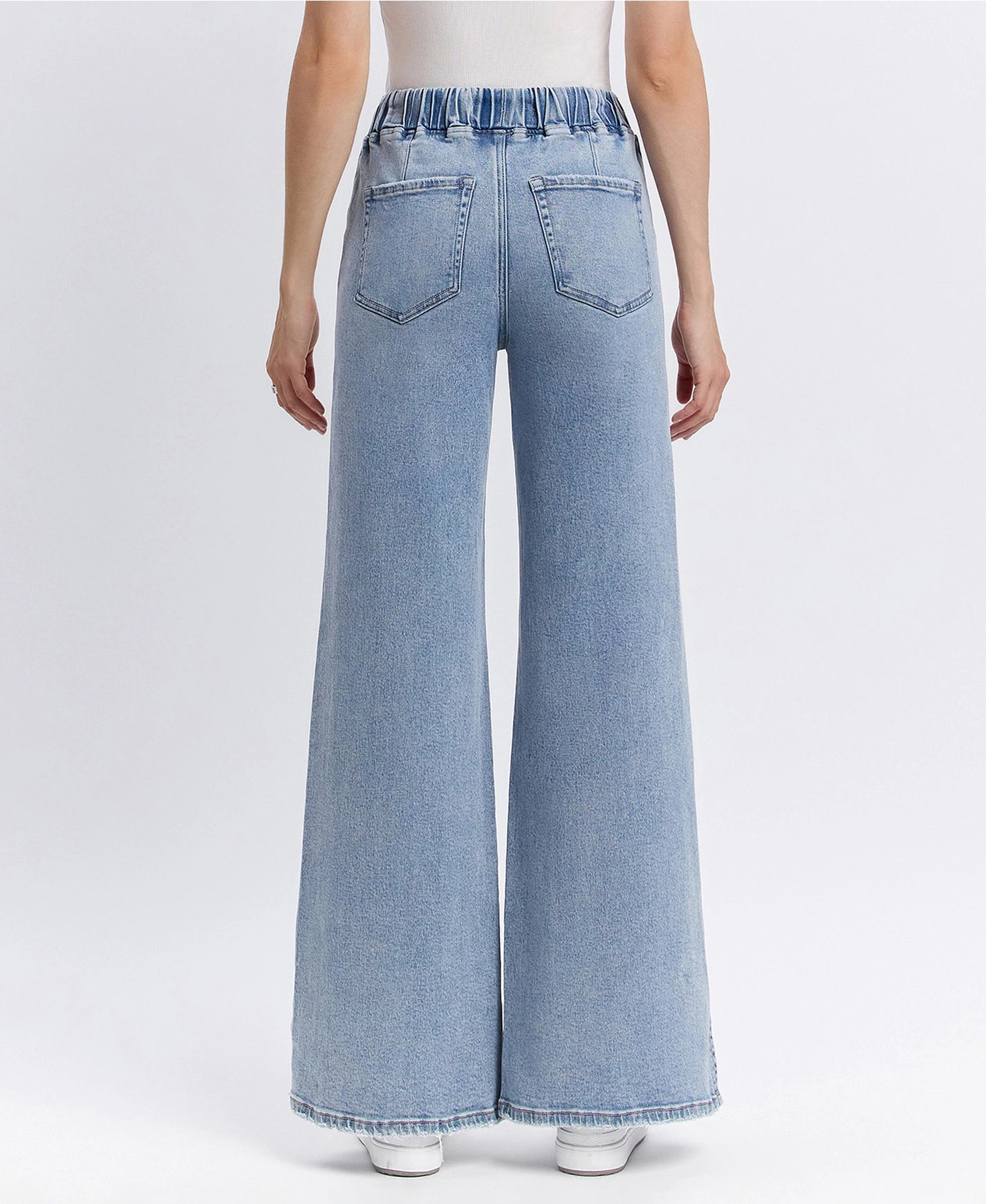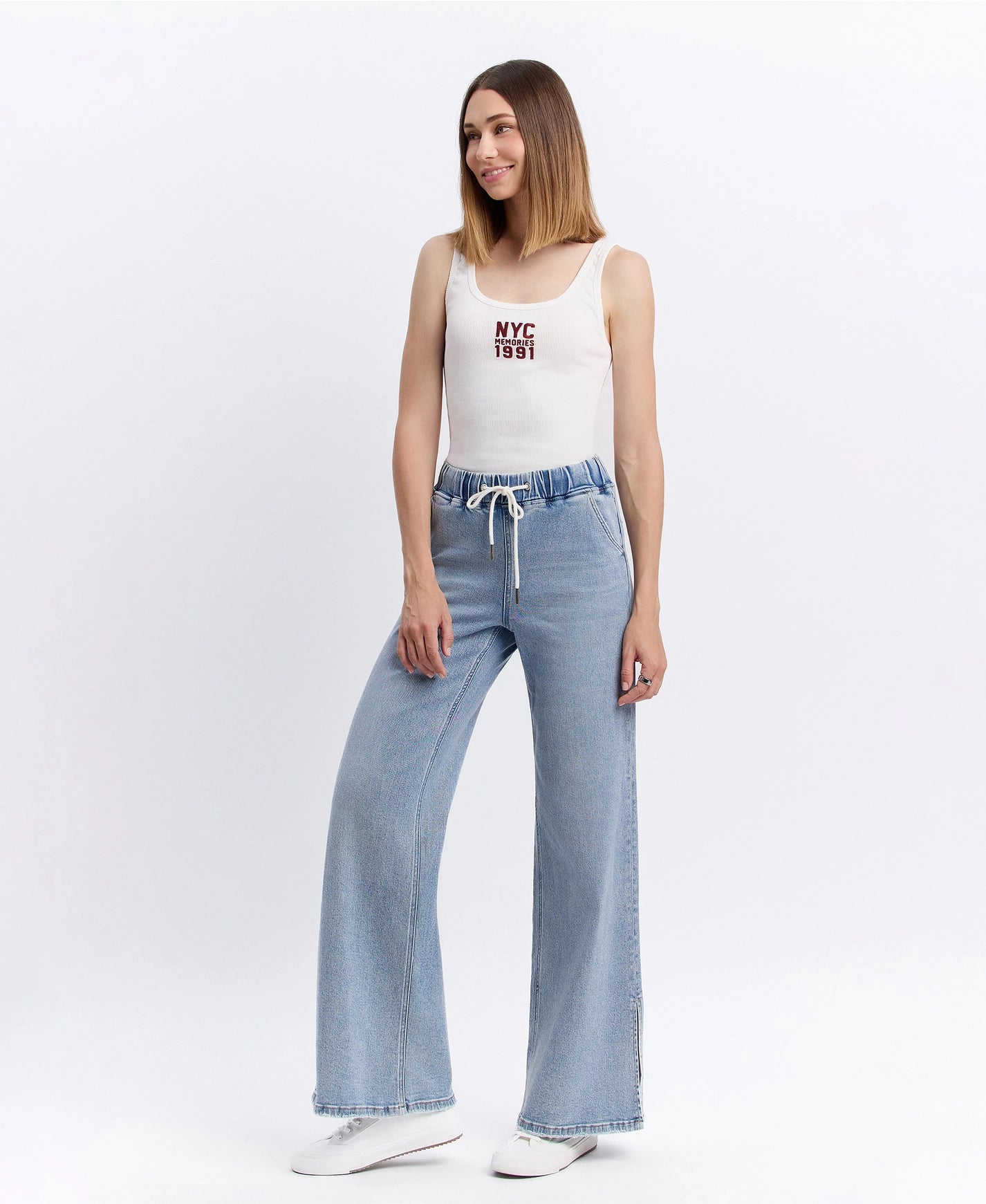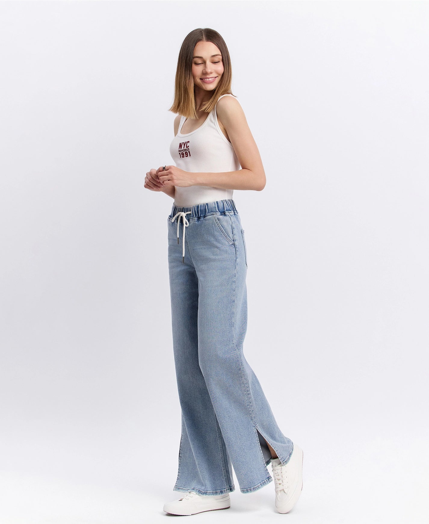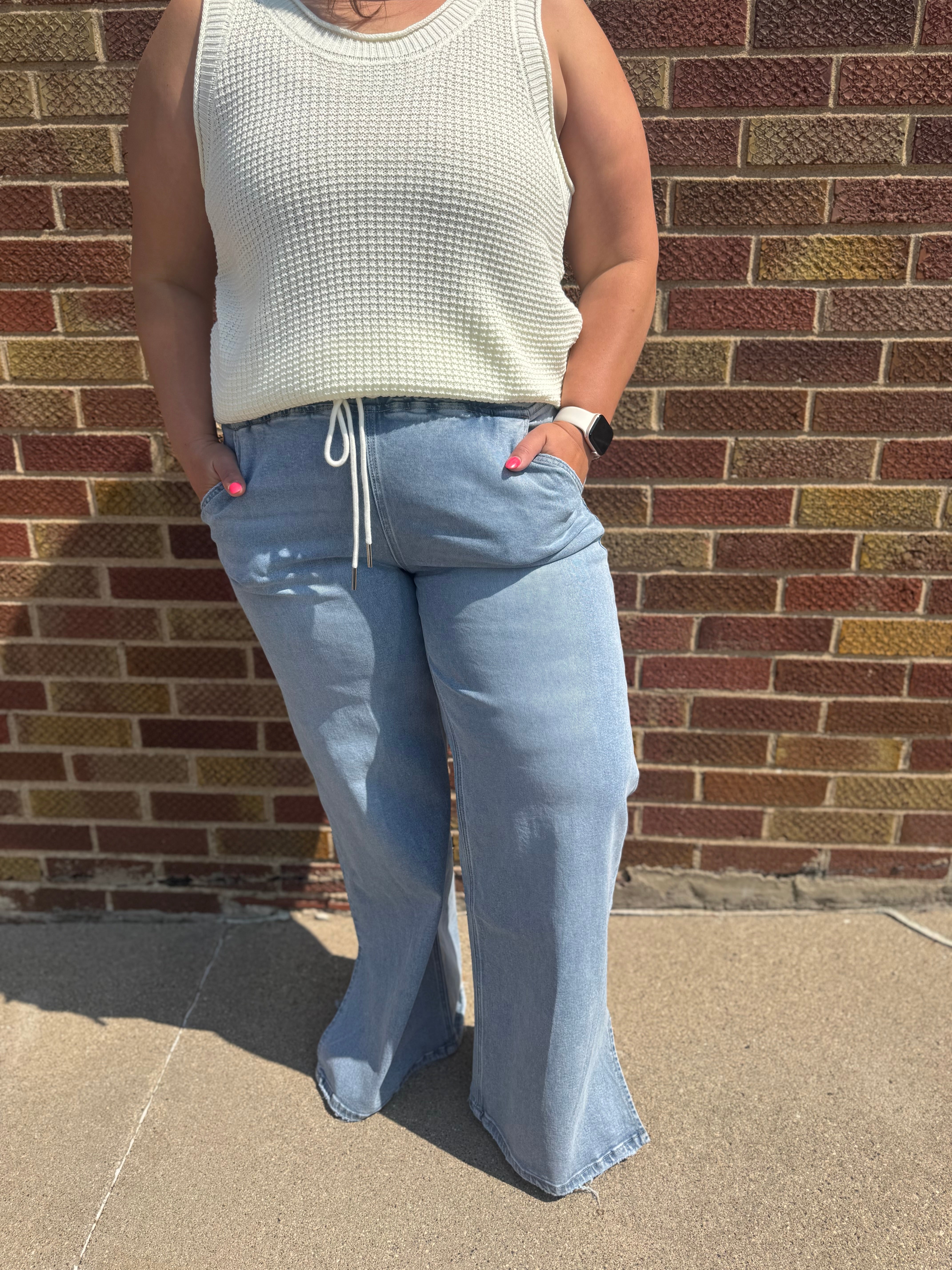 High rise drawstring waistband slit wide leg jeans Comfort stretch denim, high rise waist, drawstring waistband, side slit, full length, wide leg jeans F. Rise: 10 1/2" / inseam: 31" / leg opening: 24"