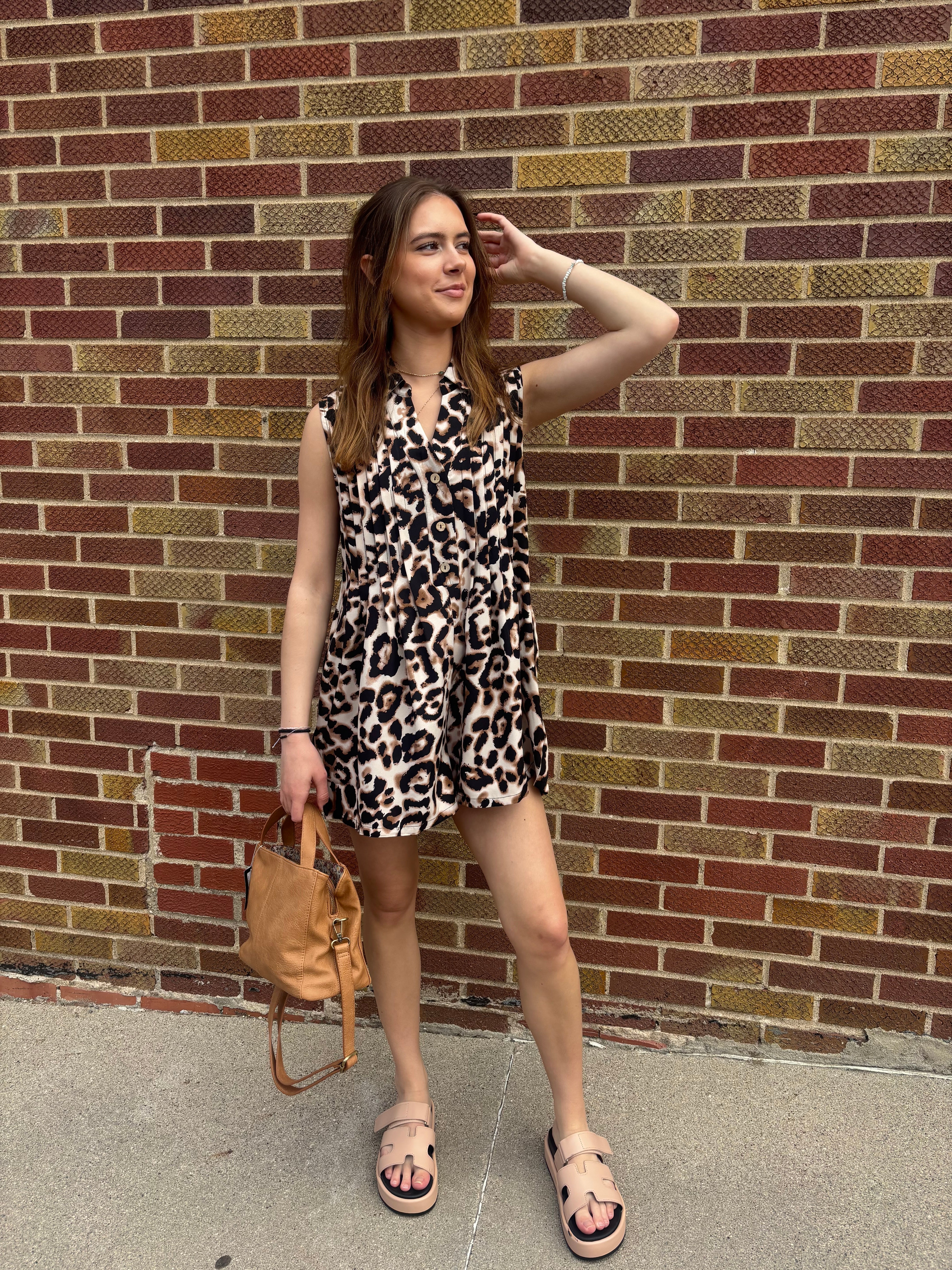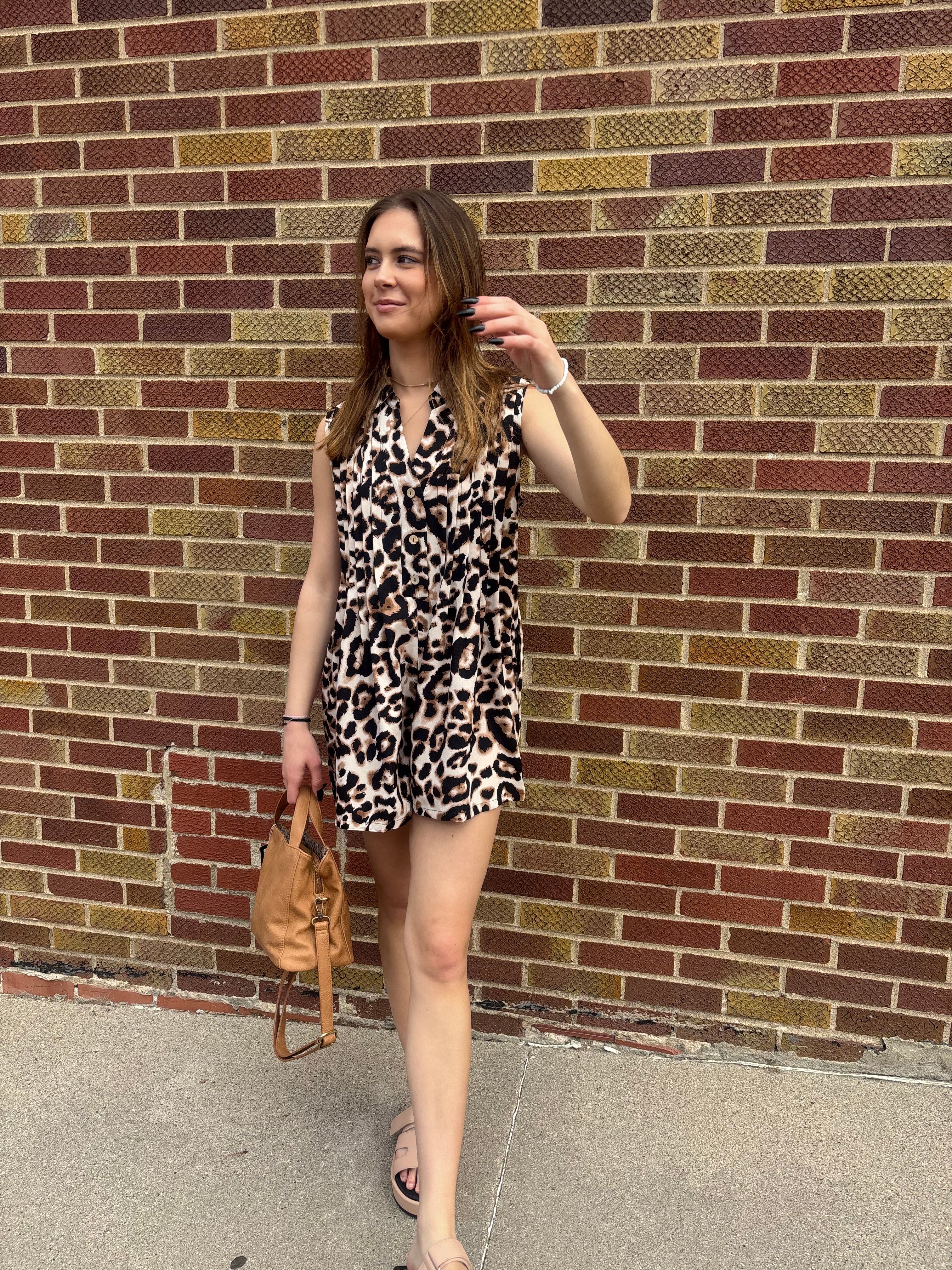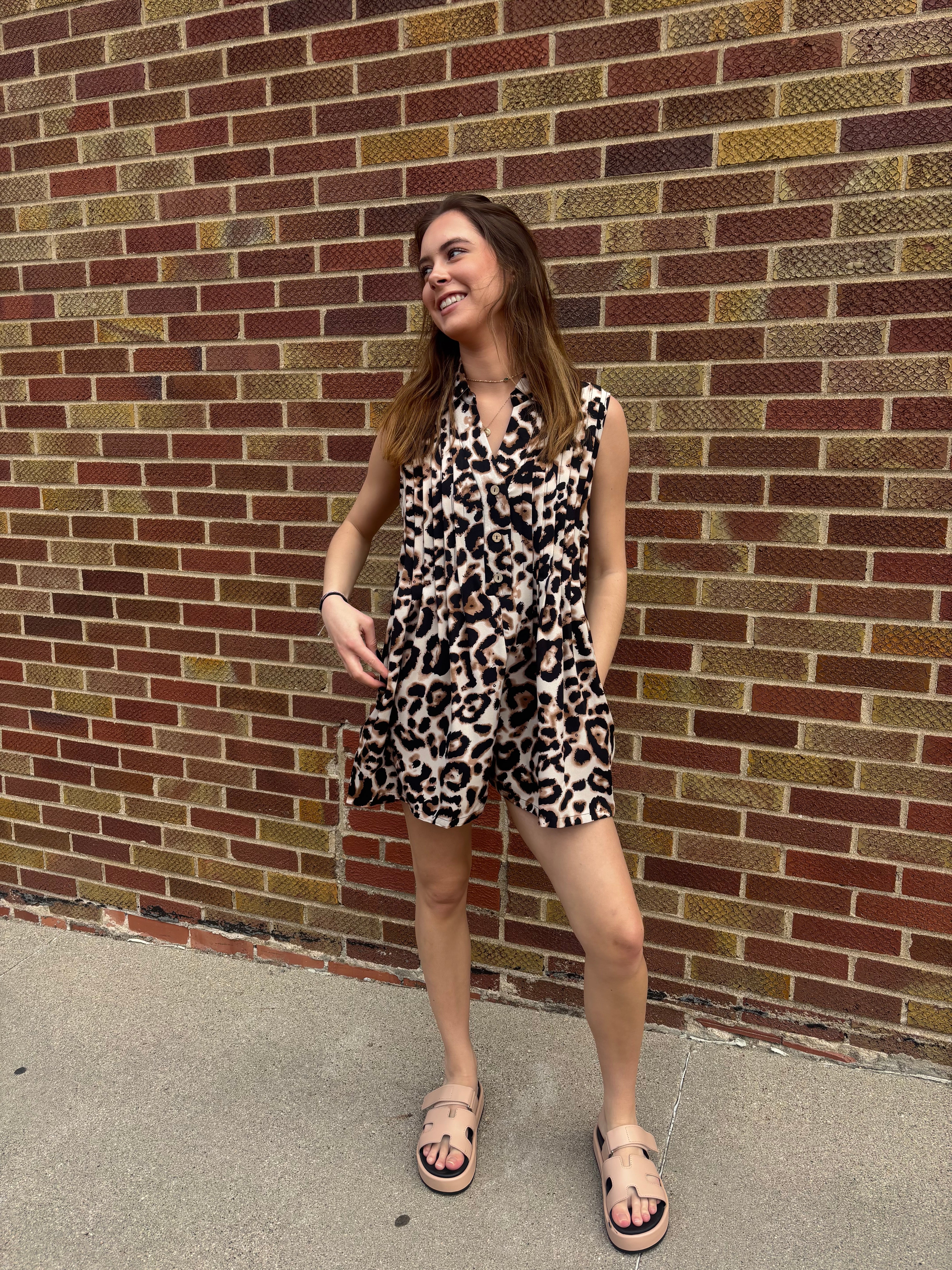 This leopard print romper combines bold style with comfortable wear, perfect for making a confident statement. Its lightweight fabric and relaxed fit ensure ease of movement, while the eye-catching pattern adds a fun, fashionable touch to your wardrobe. Ideal for casual outings or relaxed weekends, this romper supports your desire to feel both stylish and comfortable throughout the day.