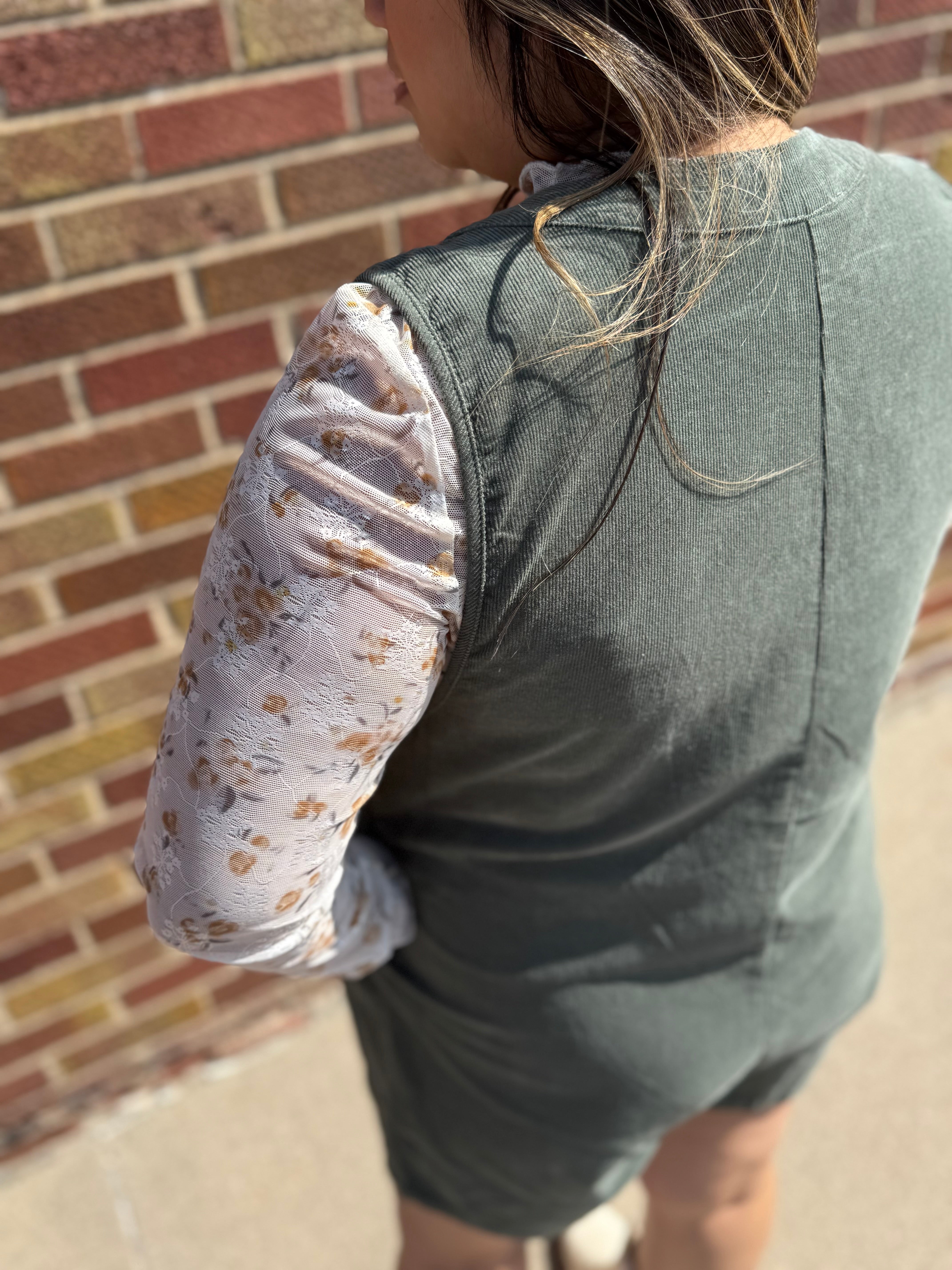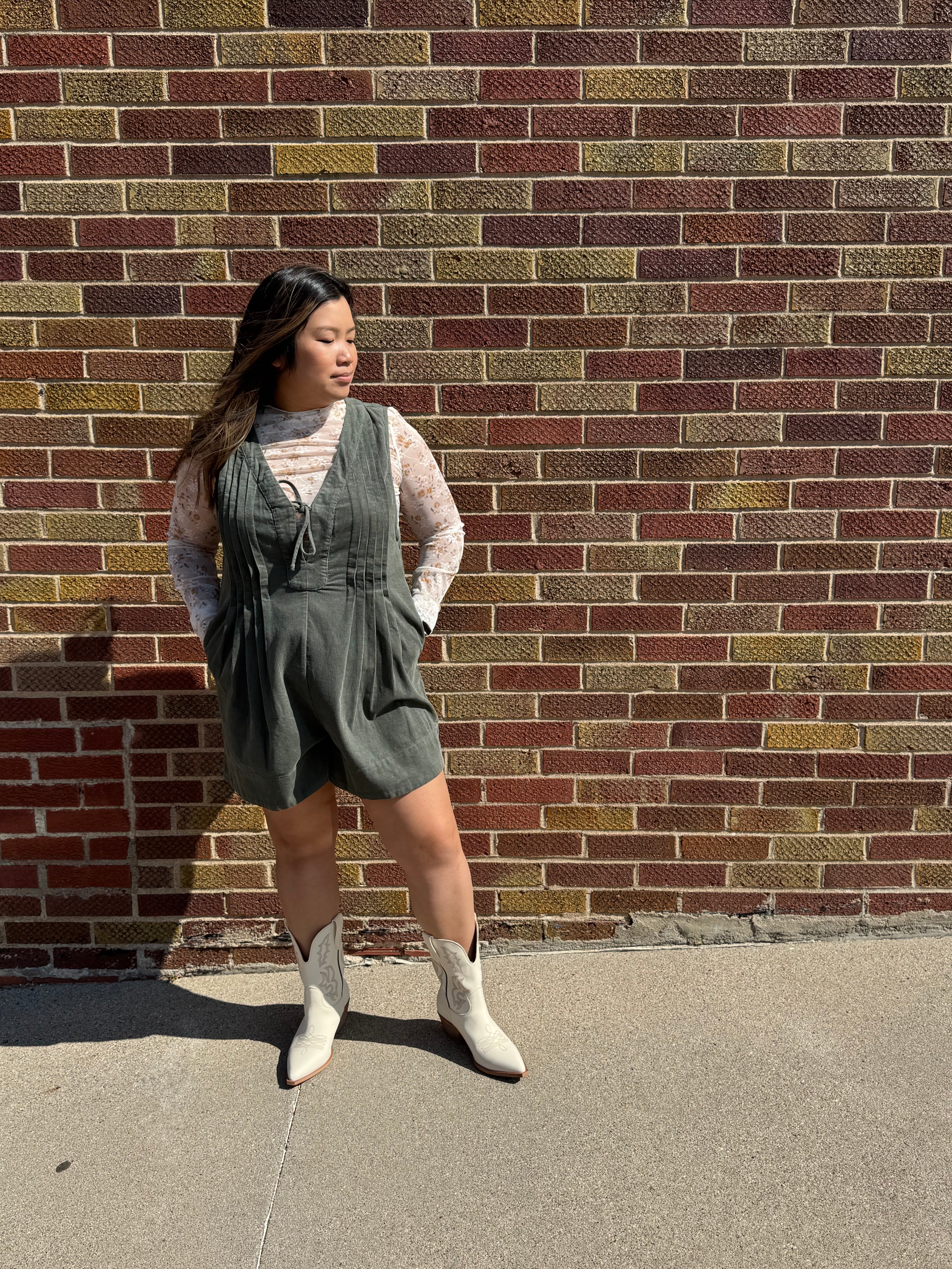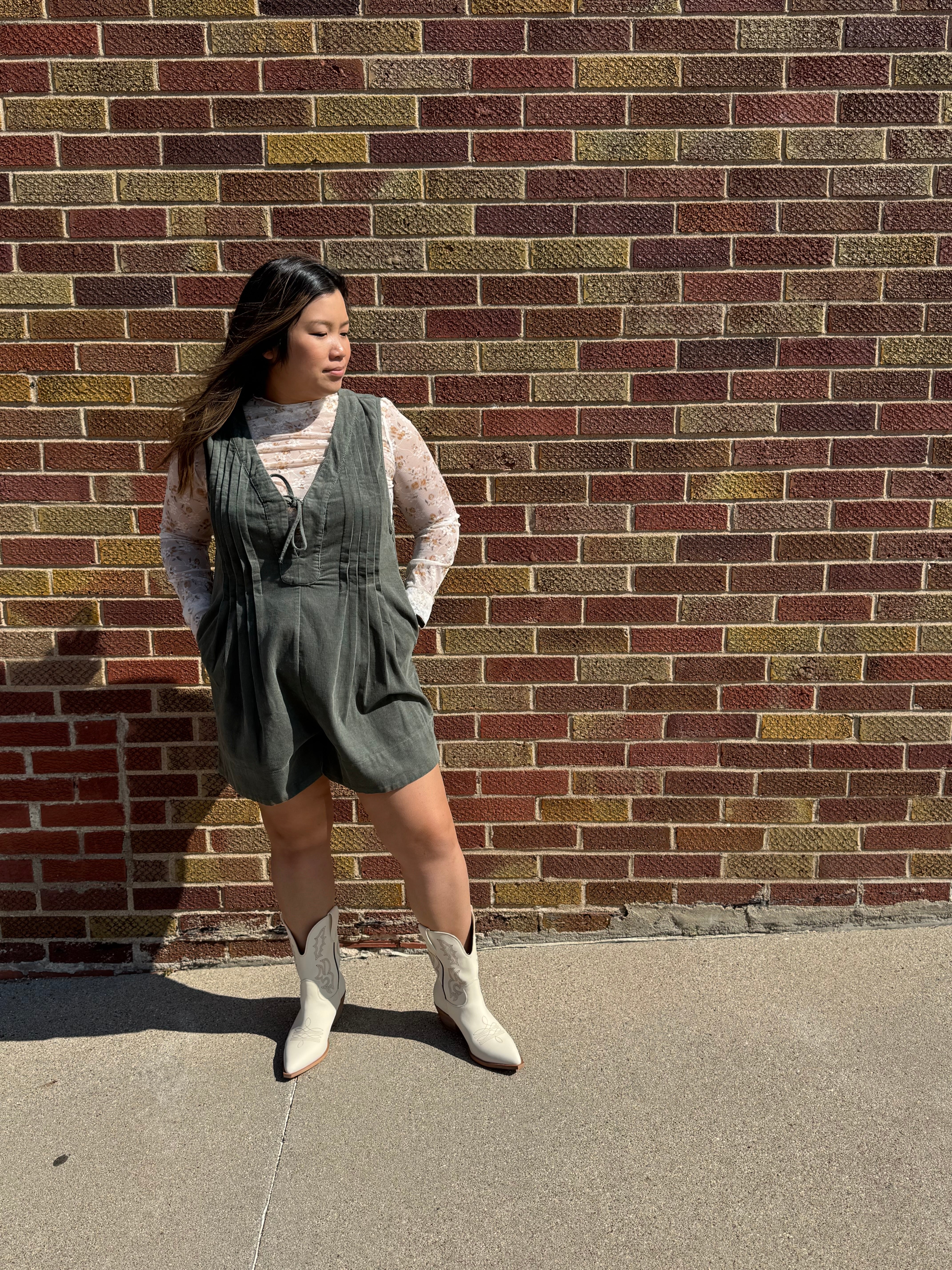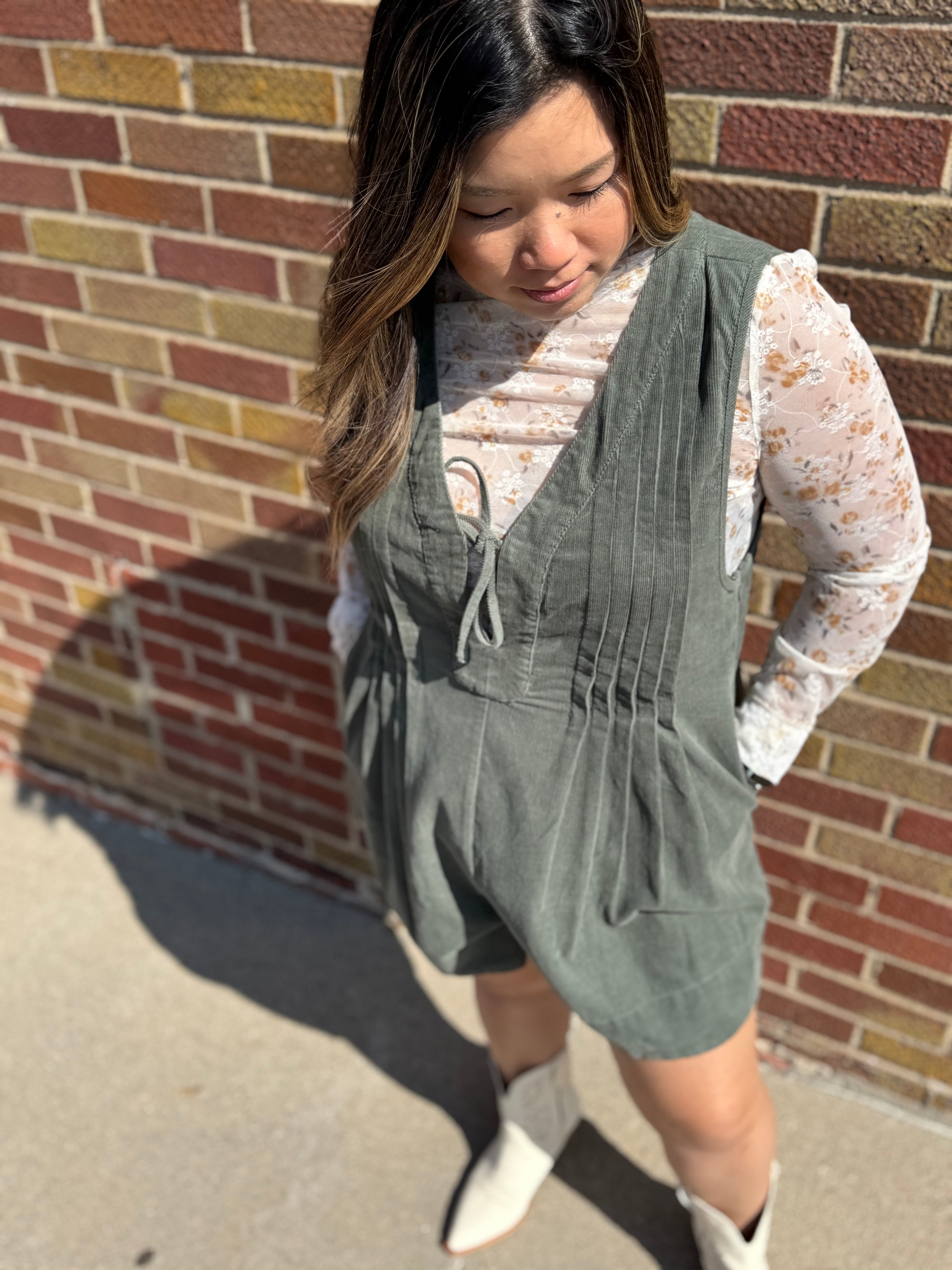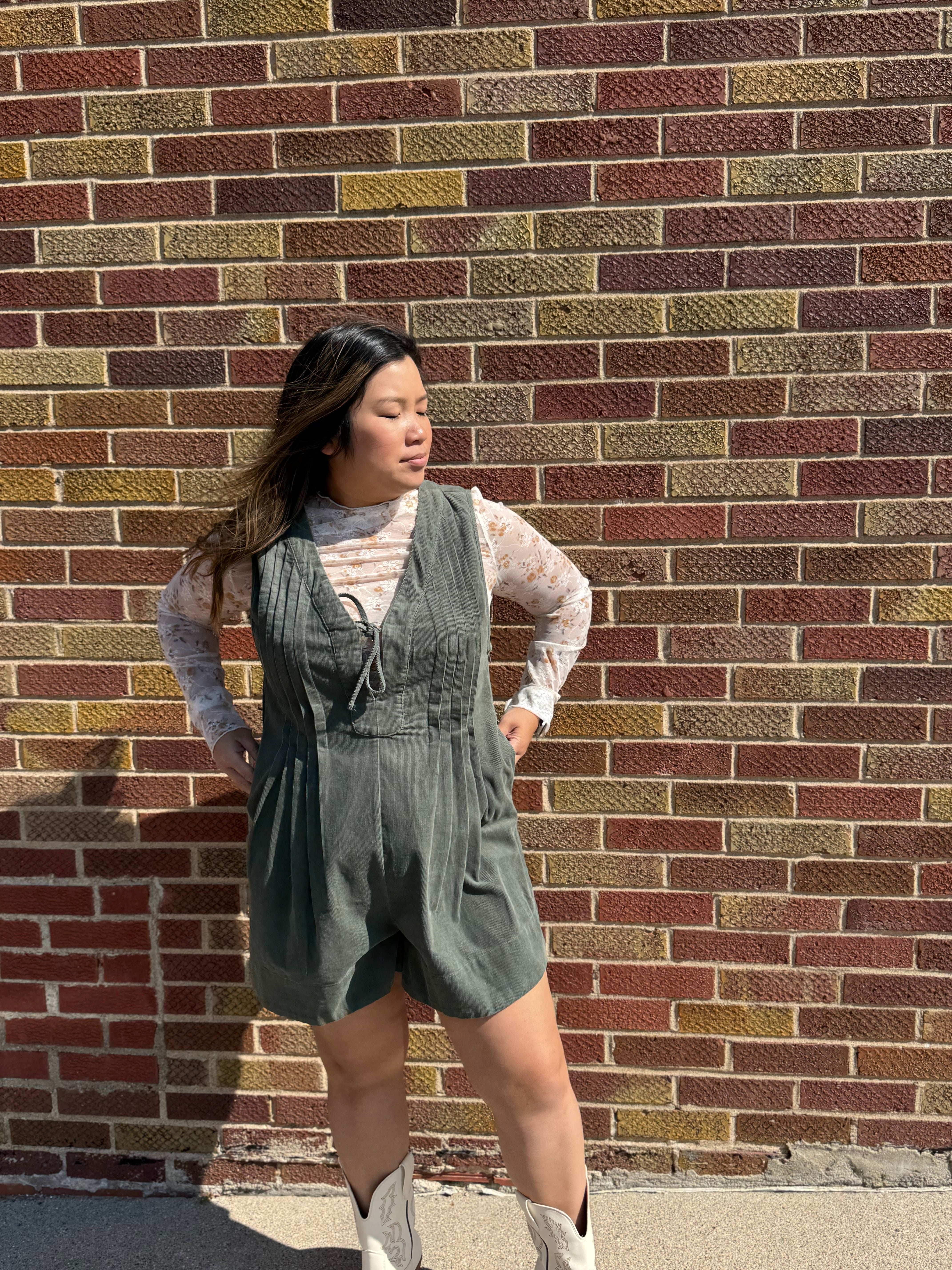 This Olive Corduroy Pleated Romper features a stylish pleated front and a convenient tie closure at the front and side zipper for a customizable fit. Designed with practical side pockets and a comfortable 3-inch inseam, it offers both functionality and ease of movement. Crafted from durable corduroy, this romper combines classic texture with modern design, making it a versatile addition to your wardrobe.