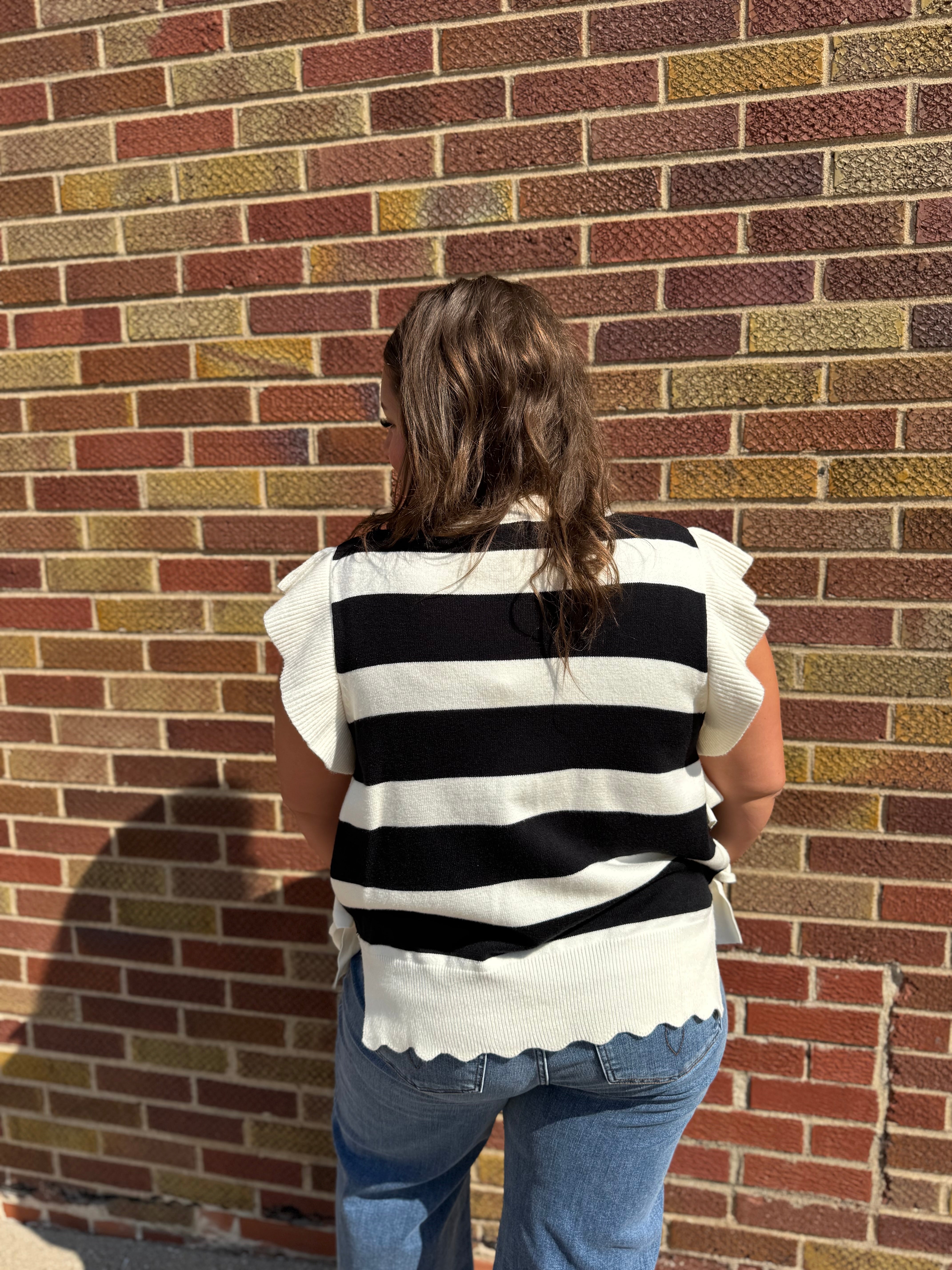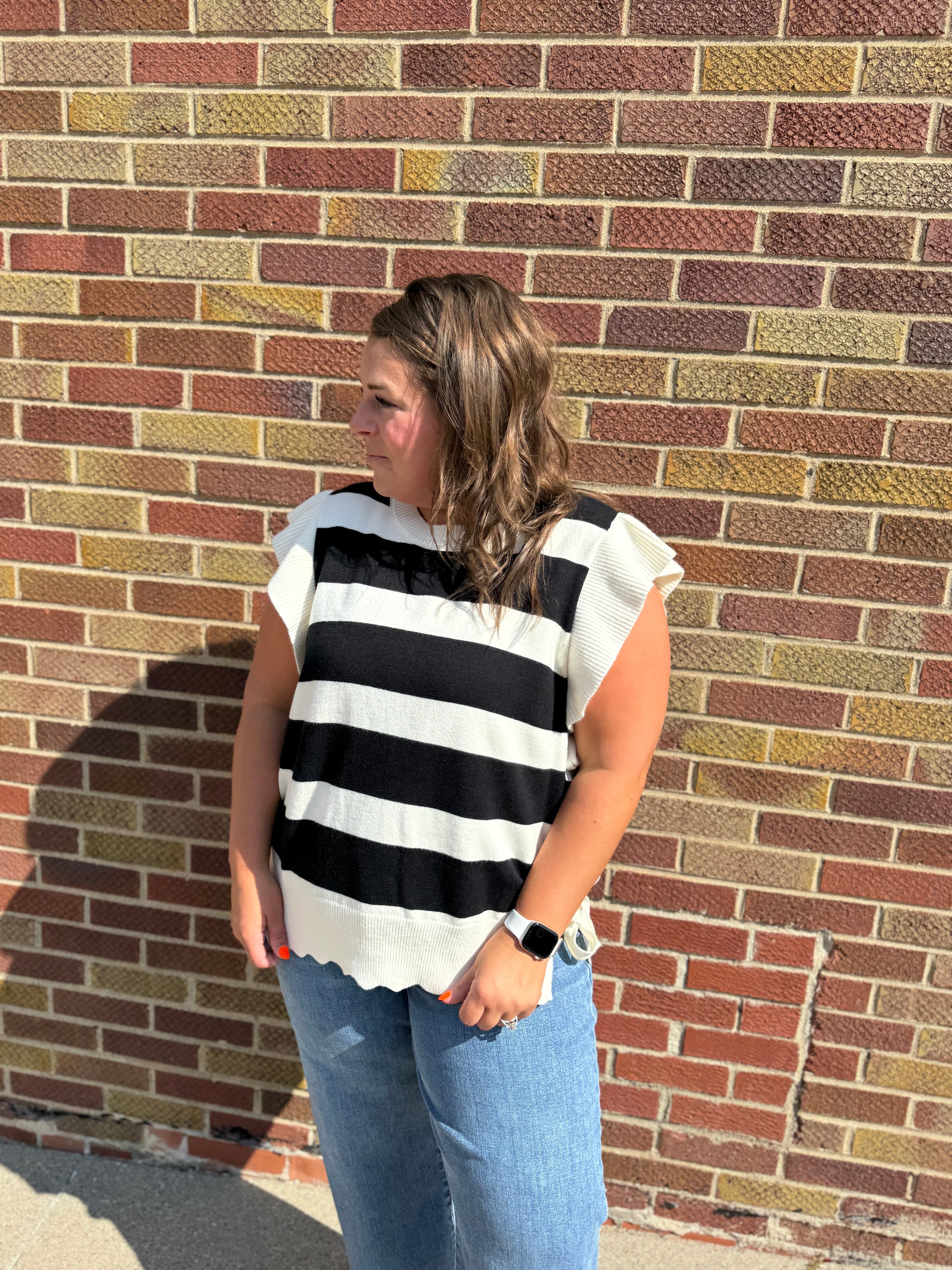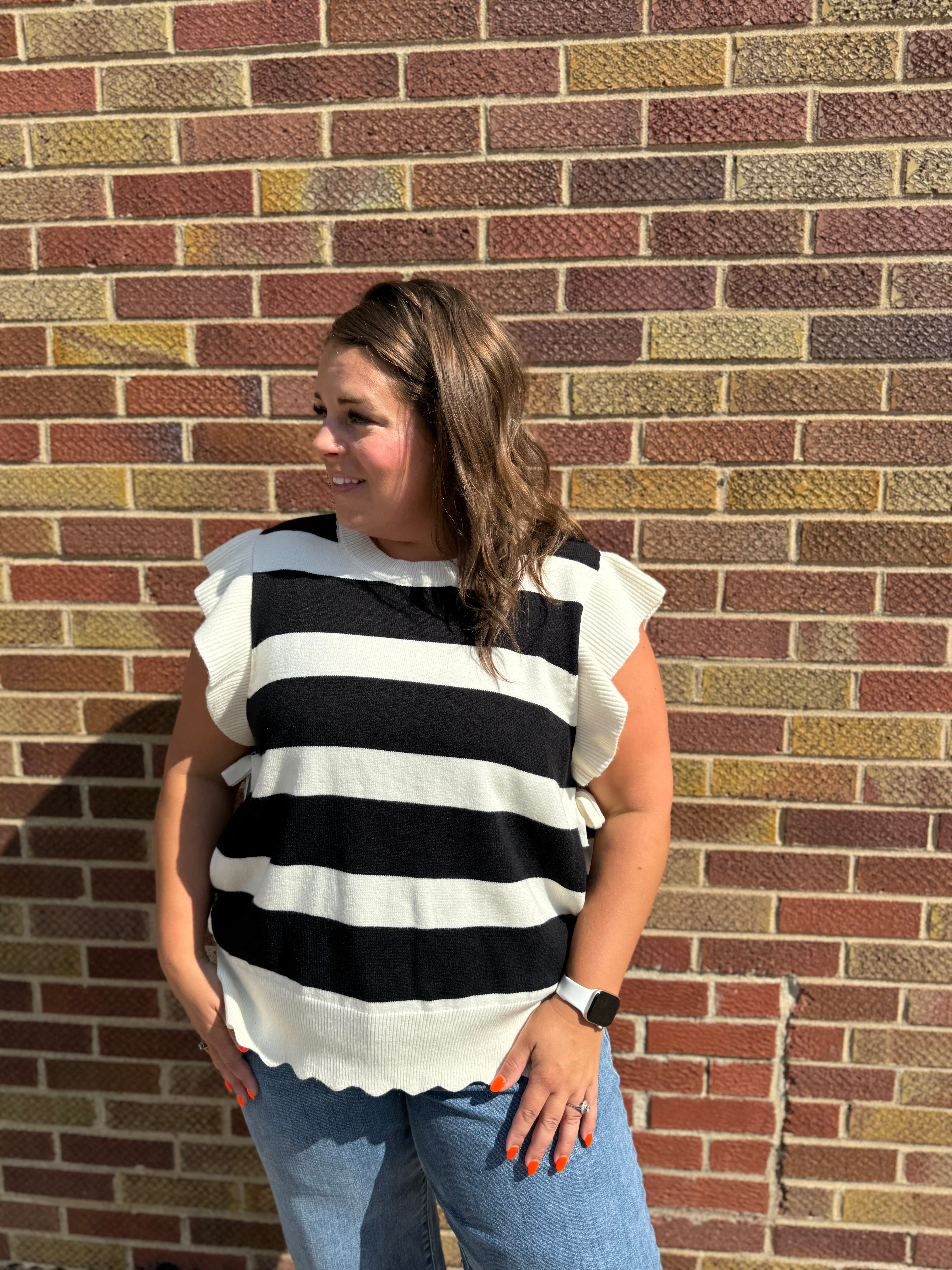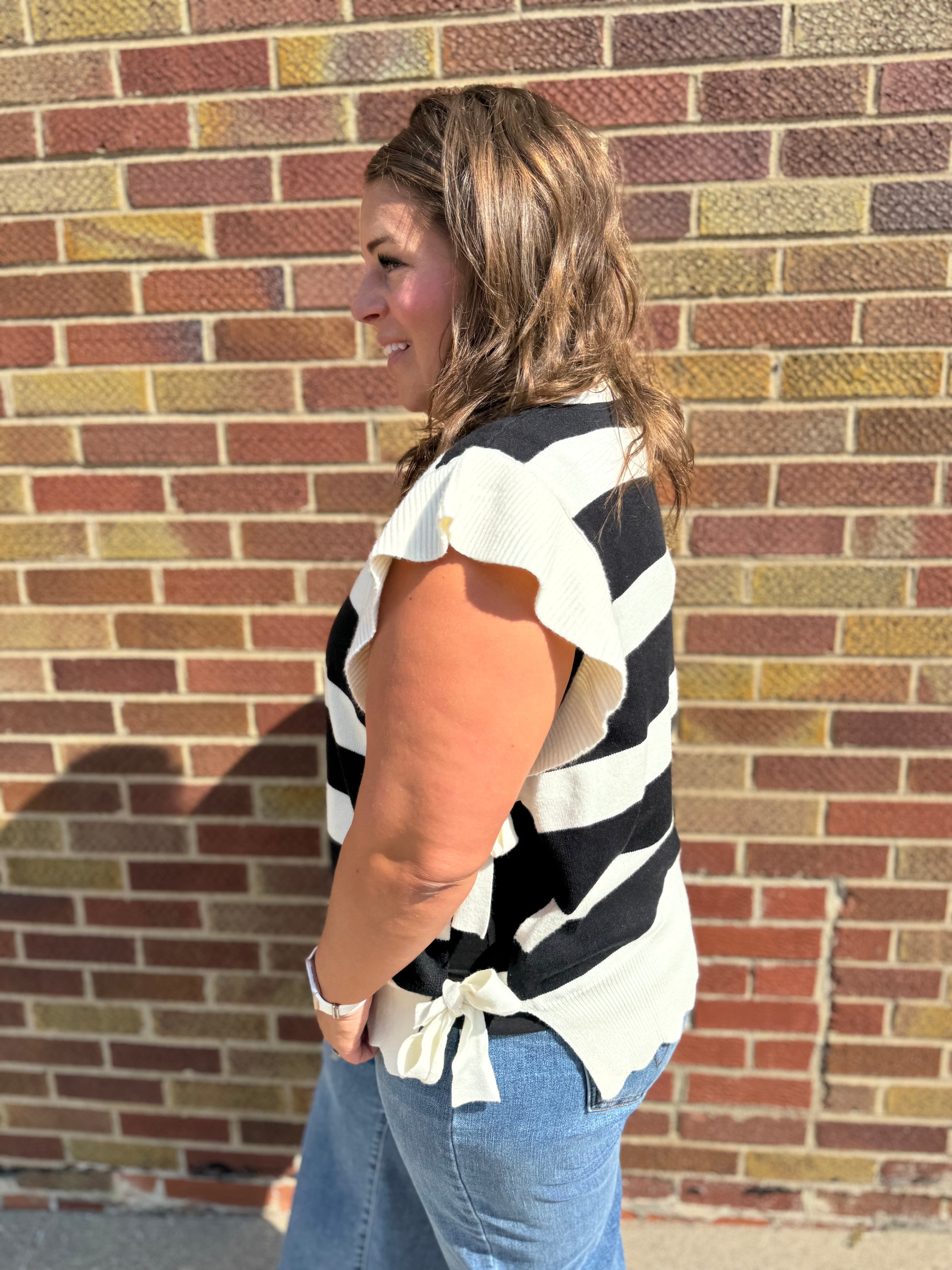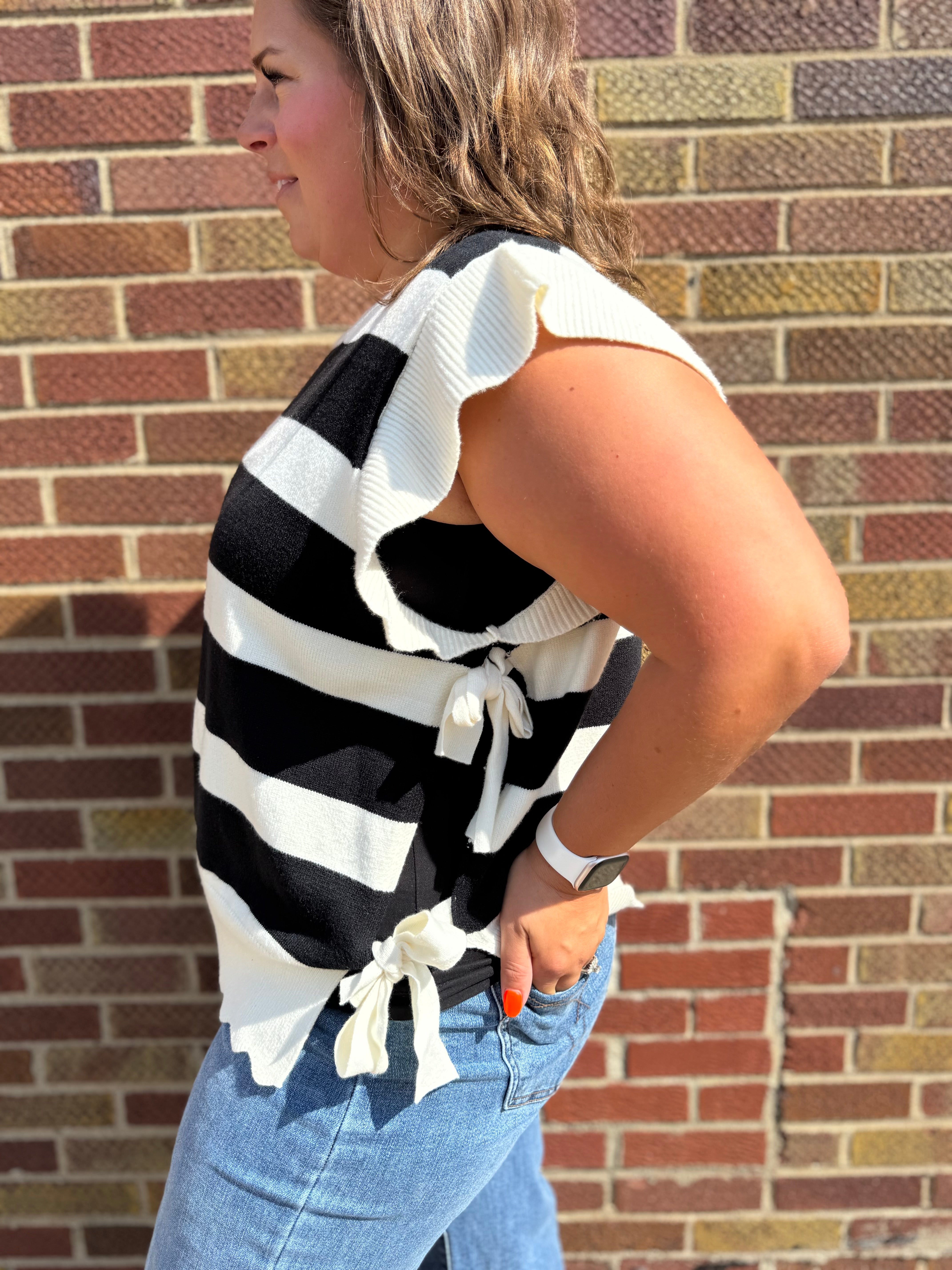 Plus Bold Stripe Sweater Top featuring thick black and cream stripes. The ruffled short sleeves with open sides tied with bows add a charming and unexpected detail. Perfect for mixing comfort with style, this top is sure to brighten up any outfit with its fun and bold design.