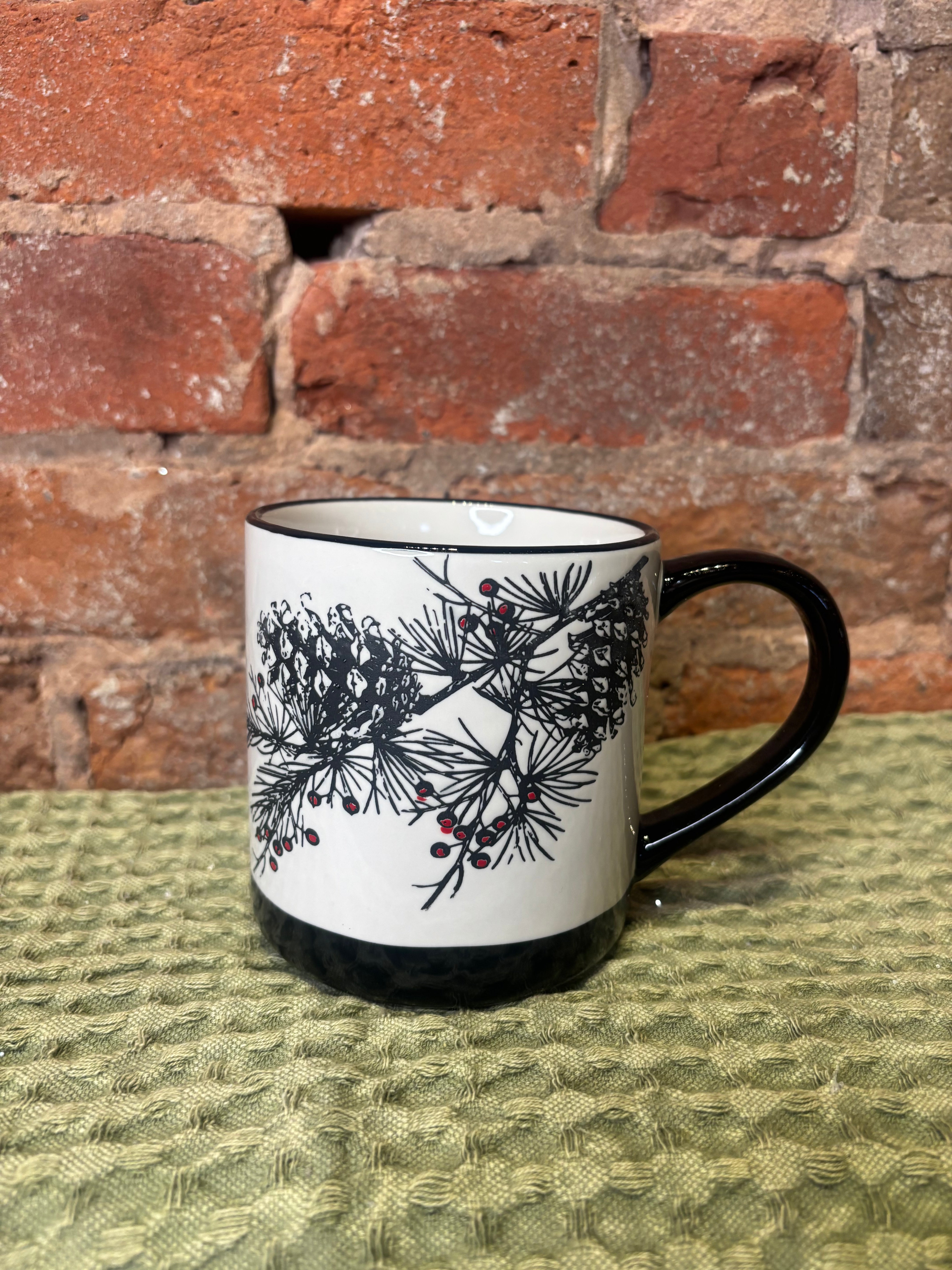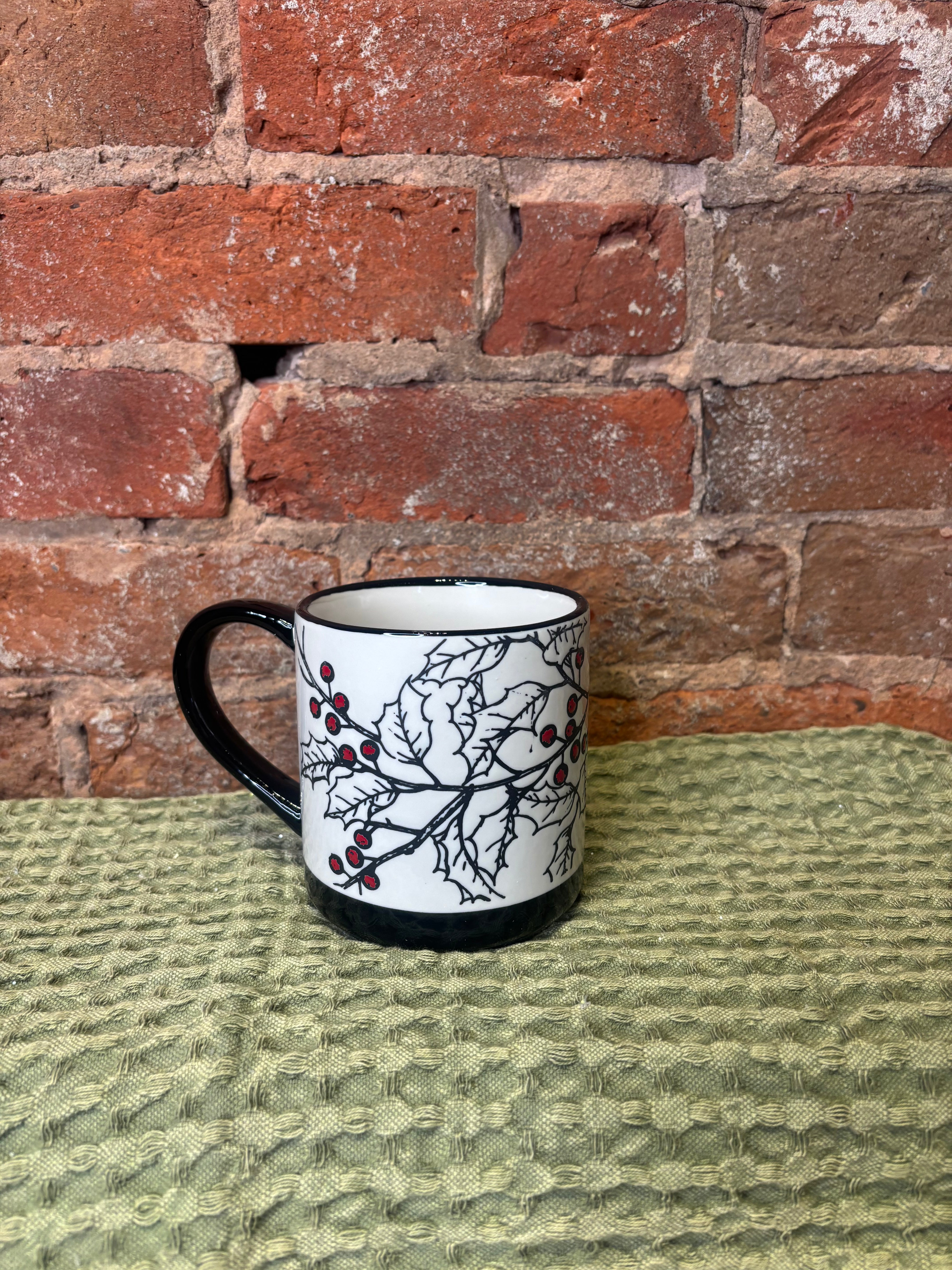 Sip your favorite holiday drink in style with this playful black accent mug, decorated with festive holly and pine designs. Its 5-inch size is perfect for cozy moments, adding a cheerful touch to your winter mornings or holiday gatherings.