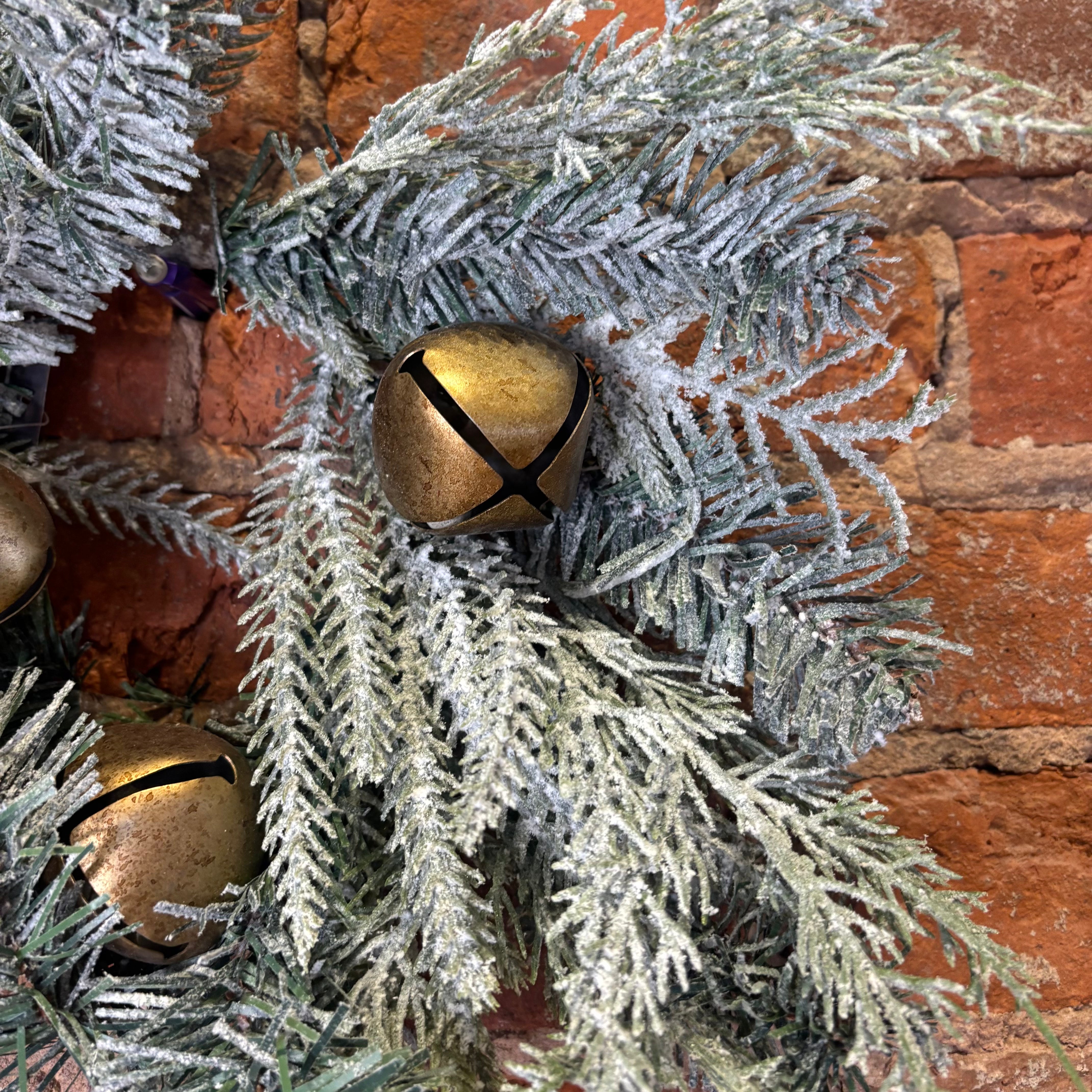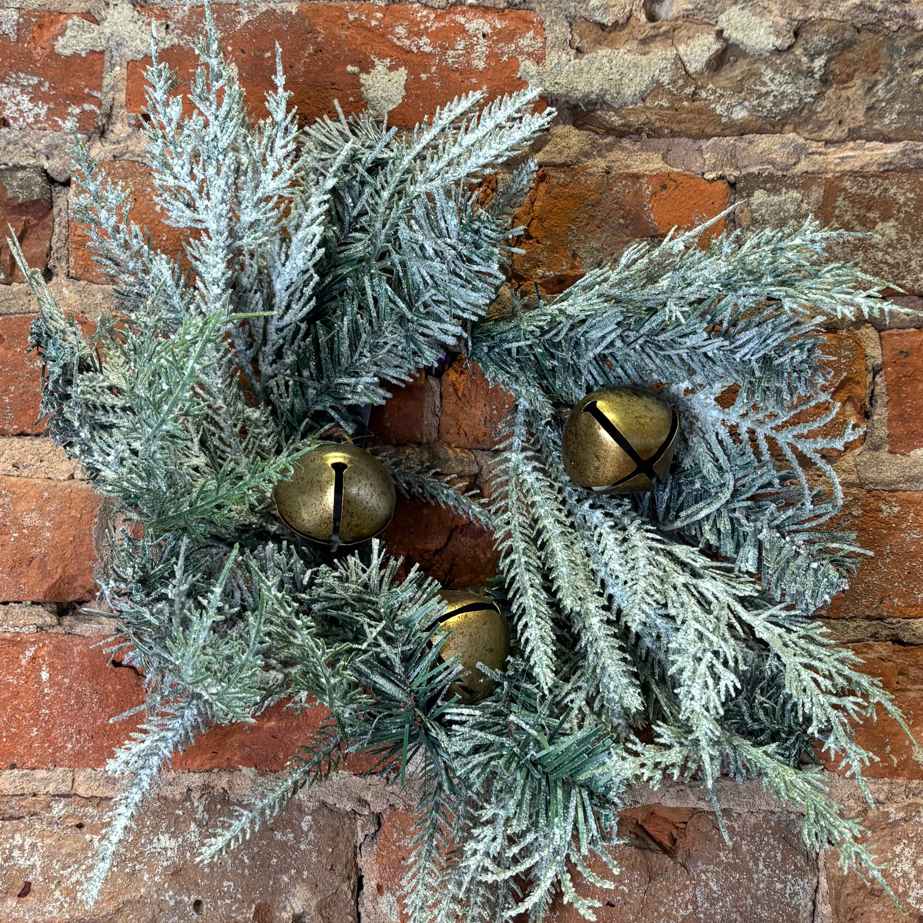 Deck your door with this playful 15.5-inch flocked mixed pine wreath, featuring frosted green foliage and a rustic brown branch. Three shiny gold bells add a joyful jingle, making it a festive and fun holiday welcome.