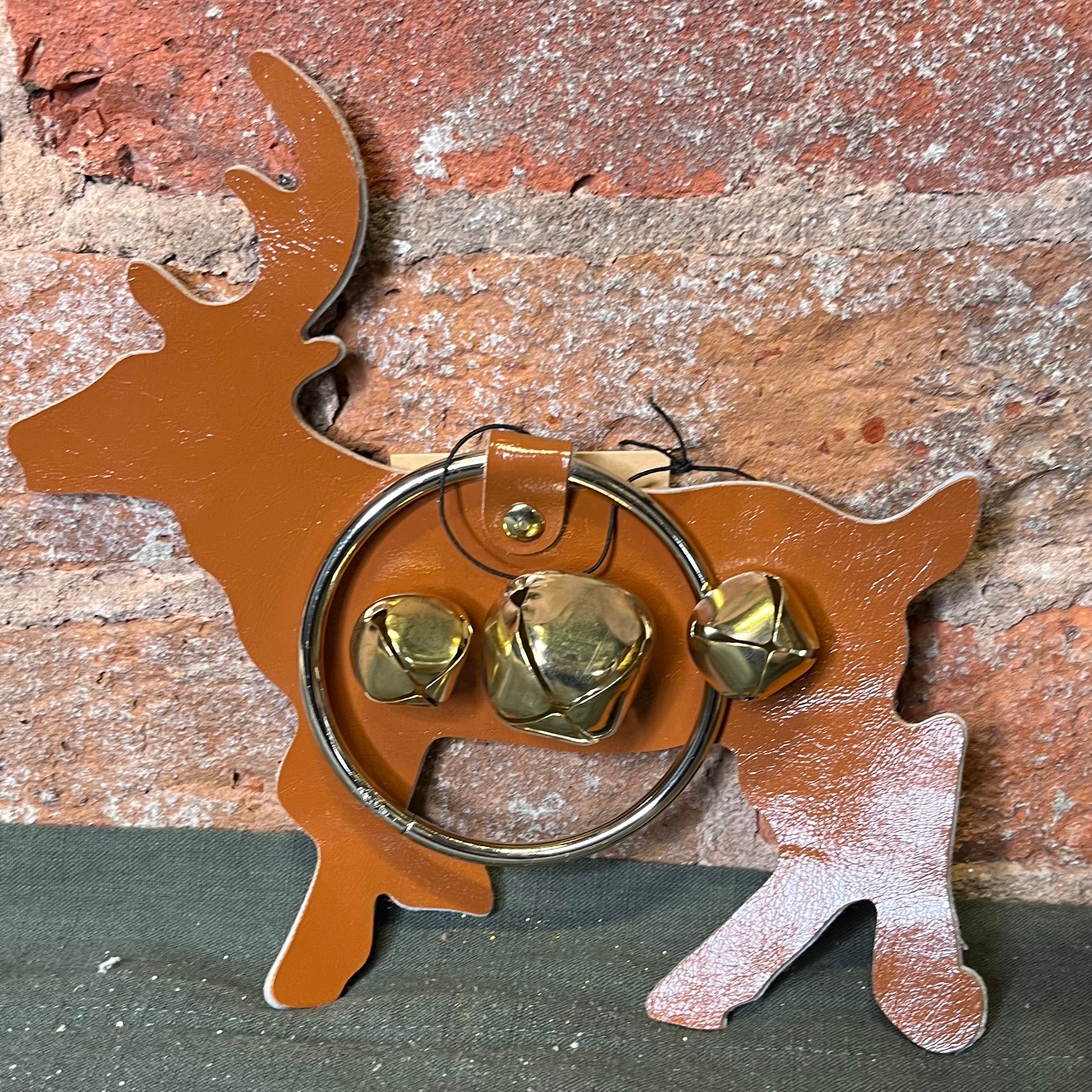 Leather/Metal Ring Deer Door Hanger w/ 3 Jingle Bells 8x7.75”