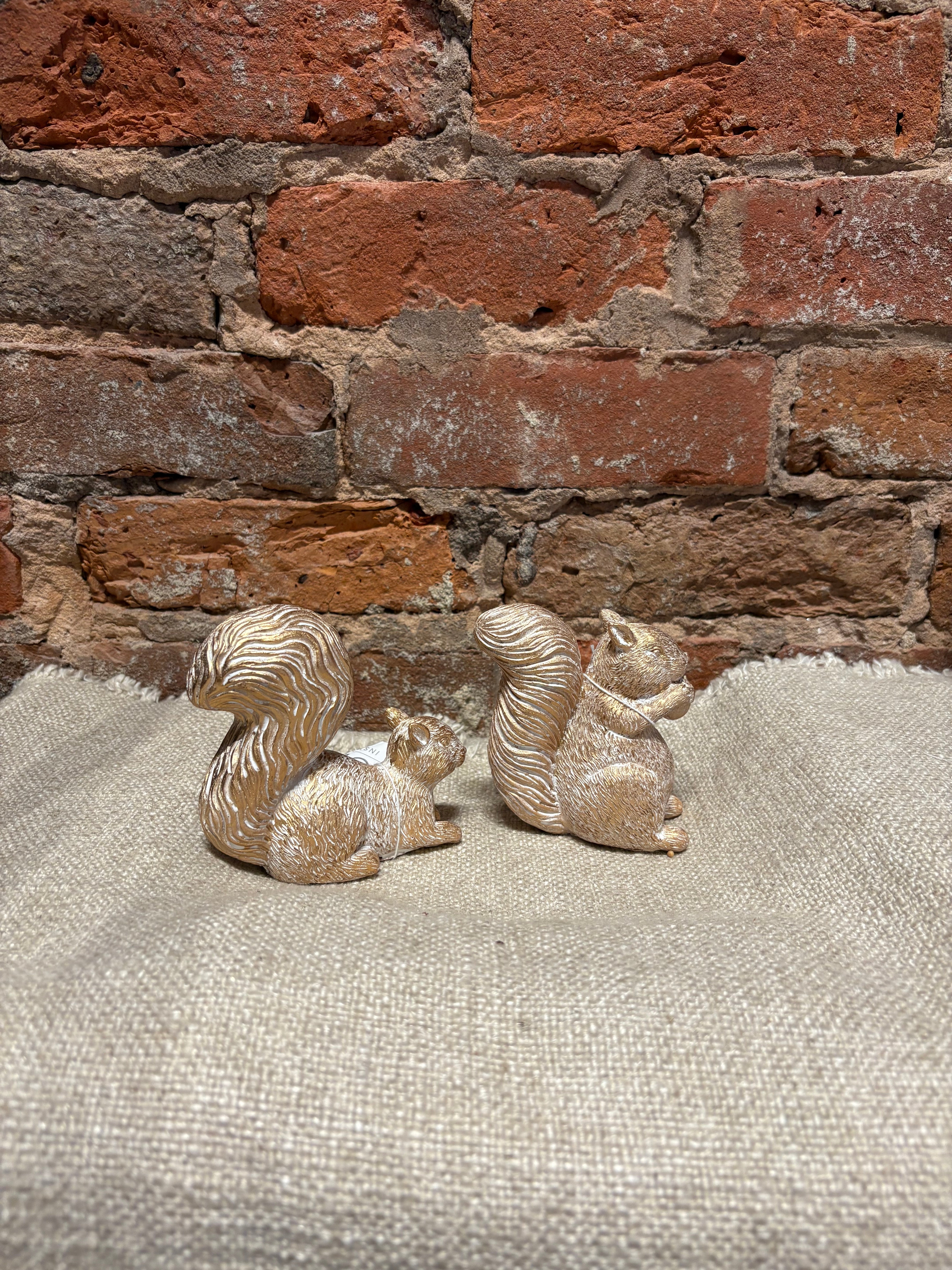 The Metallic Painted Squirrel collection features intricately crafted designs of squirrels in both sitting and laying down poses. Constructed from metal and finished with a metallic paint, these pieces offer durability and a refined, lifelike appearance, perfect for adding texture and charm to any decorative setting.