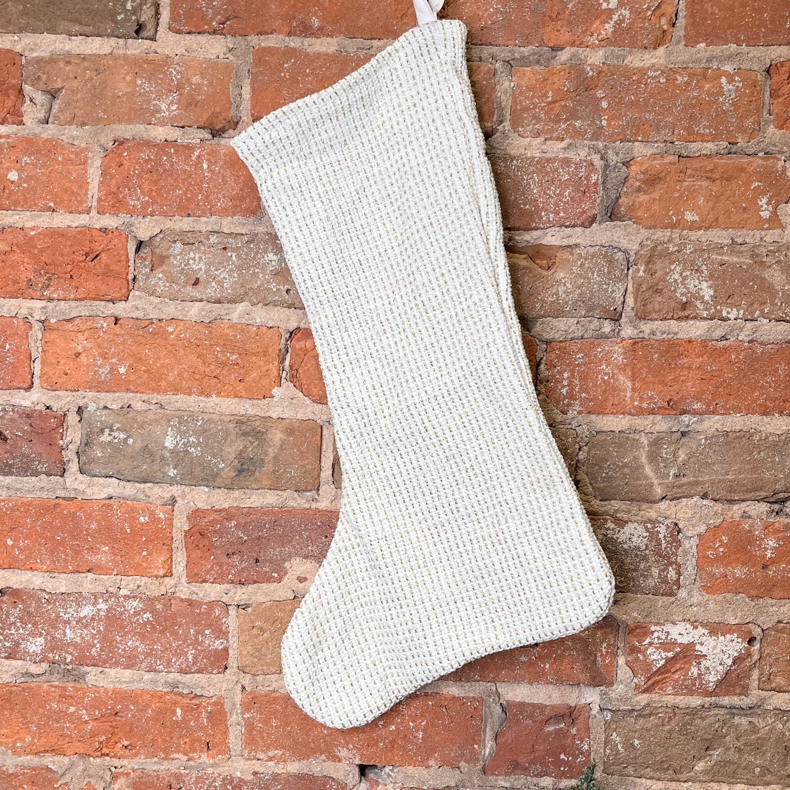 Add a touch of sparkle to your holiday decor with this 20” natural woven stocking, beautifully threaded with metallic gold. Its playful shimmer and rustic texture make it the perfect festive accent to hang by the fireplace or gift to someone special. Celebrate the season with style and a little extra shine!