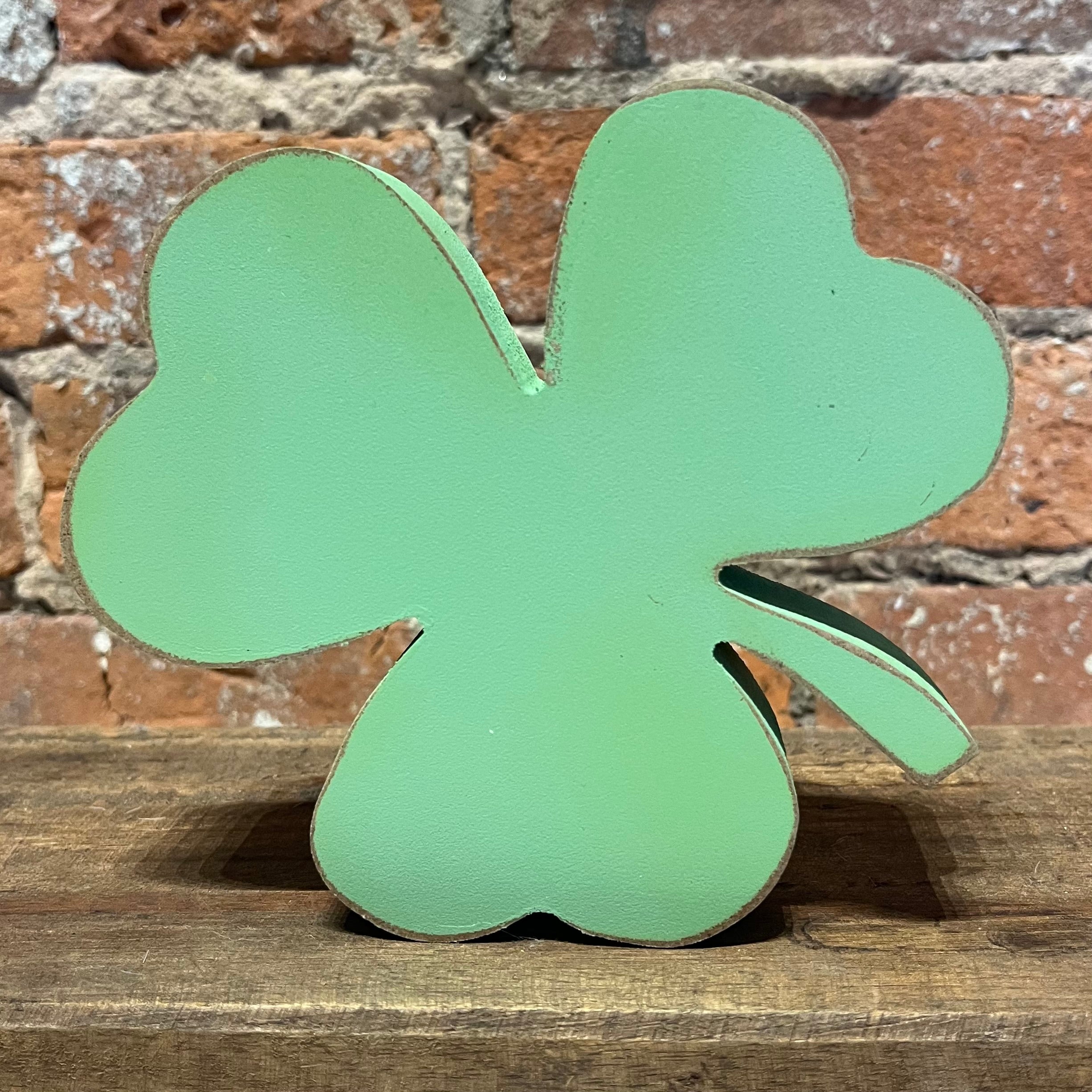 # Wooden Green Shamrock Bring a sprinkle of luck and natural charm to your space with this adorable wooden shamrock. Choose your vibe—go bold with deep forest green or keep it light and airy with a softer sage shade. Available in two sizes, 5” or 2 1/2” it's the perfect accent piece for shelves, desks, or anywhere you need a little four-leaf fortune. Handcrafted vibes meet playful Irish spirit in one delightfully quirky decoration!