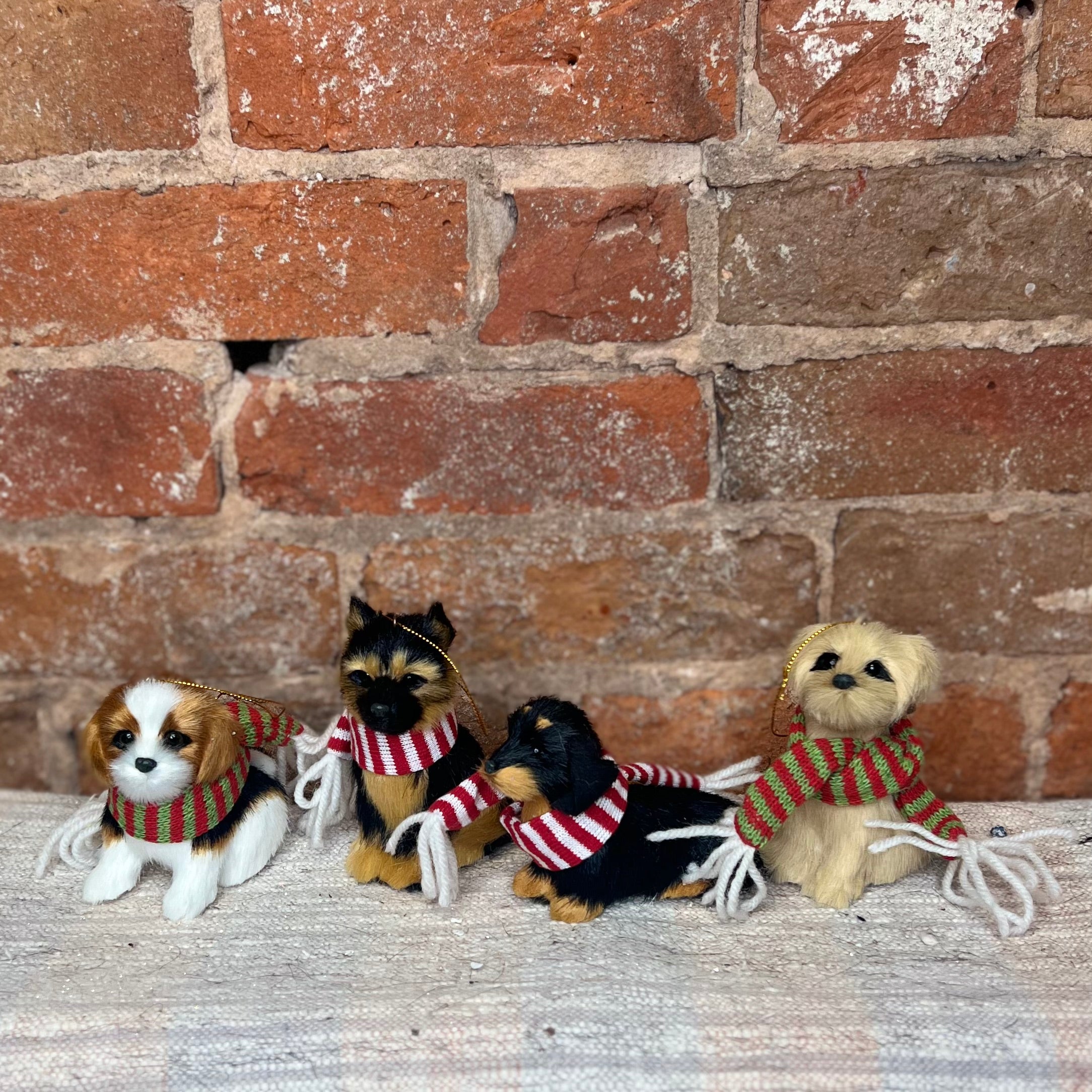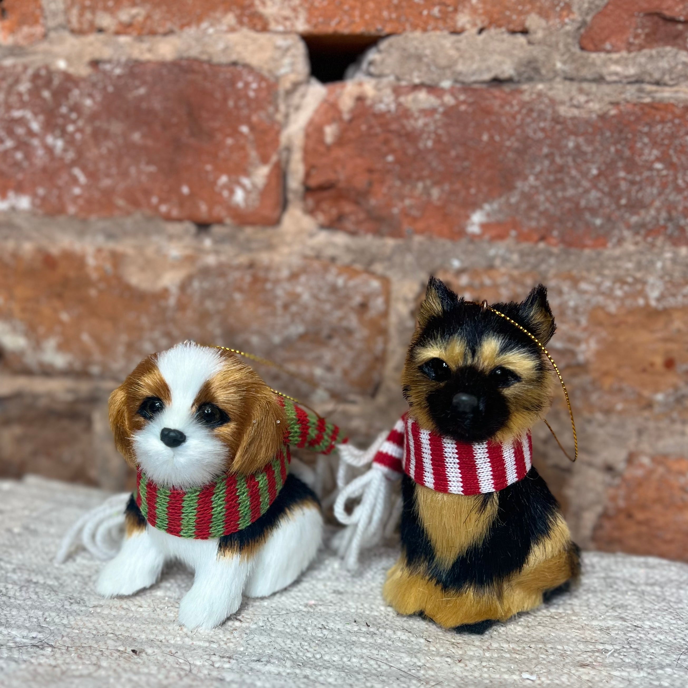 Add charm to your holiday decorations with this 4-inch Dog Ornament, featuring soft fur and 4 designs inspired by St Bernard, Golden Retriever, German Shepherd, and Doxin breeds. Each ornament captures the warmth and personality of these beloved dogs, complete with cozy scarves that enhance their festive appeal. Perfect for dog lovers looking to bring a touch of heartwarming joy to their tree.