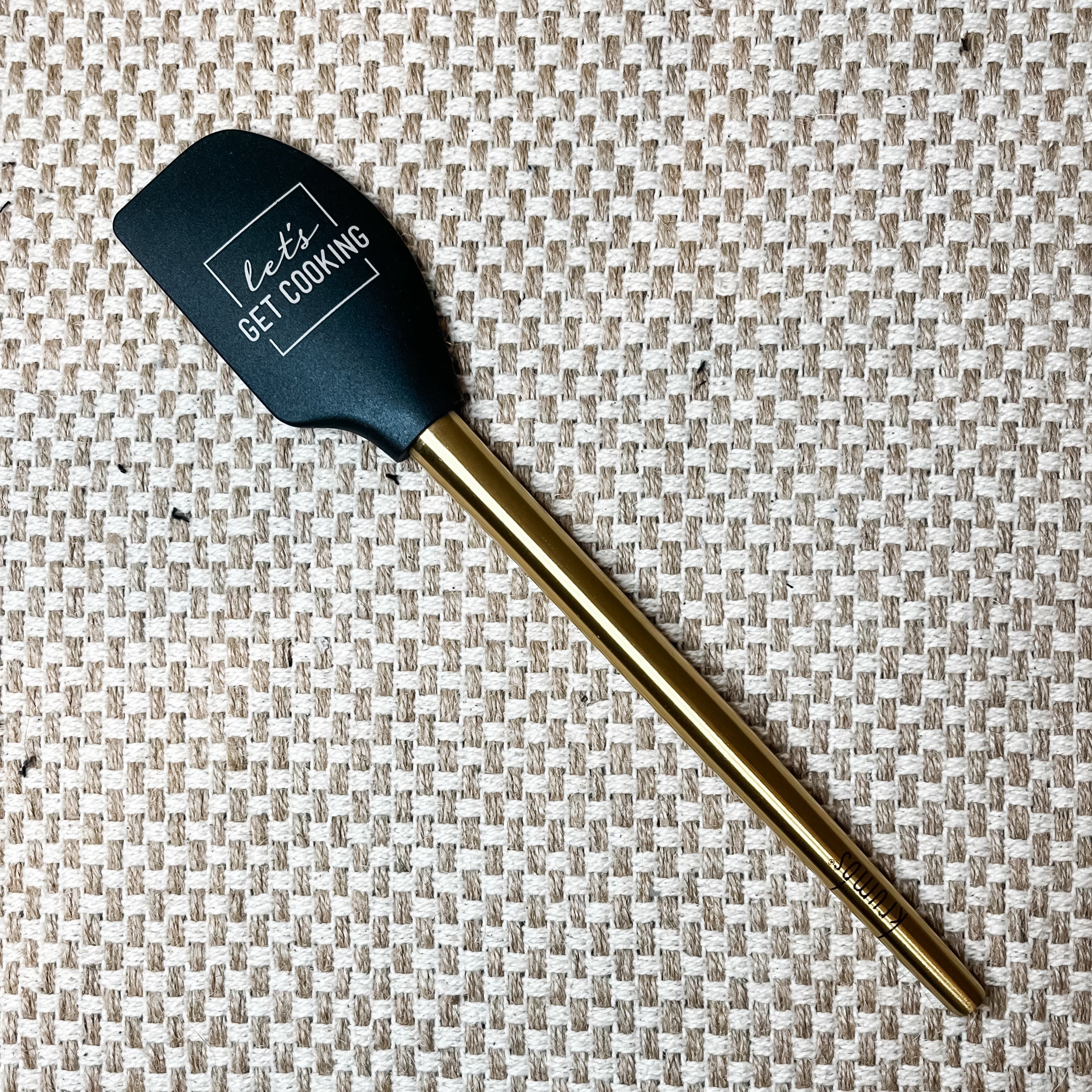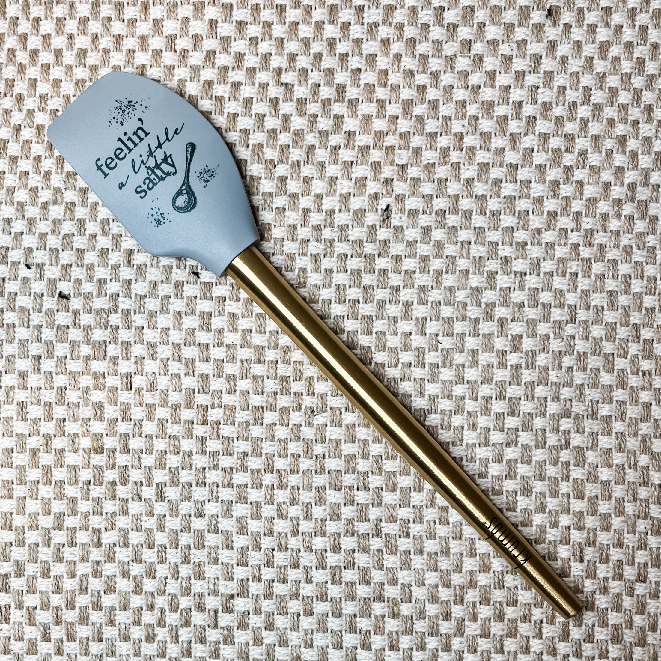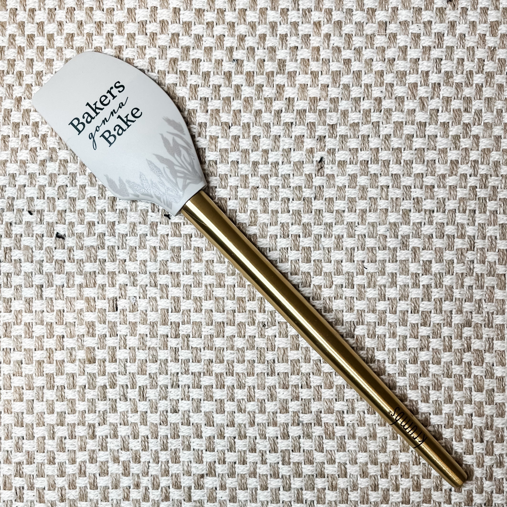 This Kitchen Spatula comes with a shimmering gold-plated handle for a touch of style. The sturdy handle is resistant to heat and wear, ensuring long-term durability. It also features fun graphics on each side to add a decorative touch. Perfect for mixing and stirring!