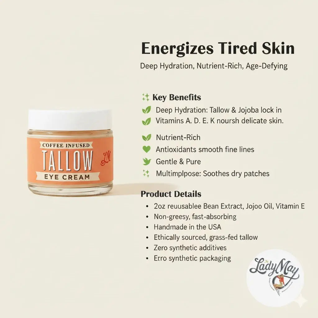 Discover the rejuvenating power of Lady May Coffee-Infused Tallow Eye Cream, a luxurious, all-natural formula crafted to awaken and nourish tired eyes. Made with ethically sourced beef tallow and cold-pressed jojoba oil, this nutrient-dense cream harnesses the potency of coffee bean extract to reduce puffiness, fade dark circles, and smooth fine lines.