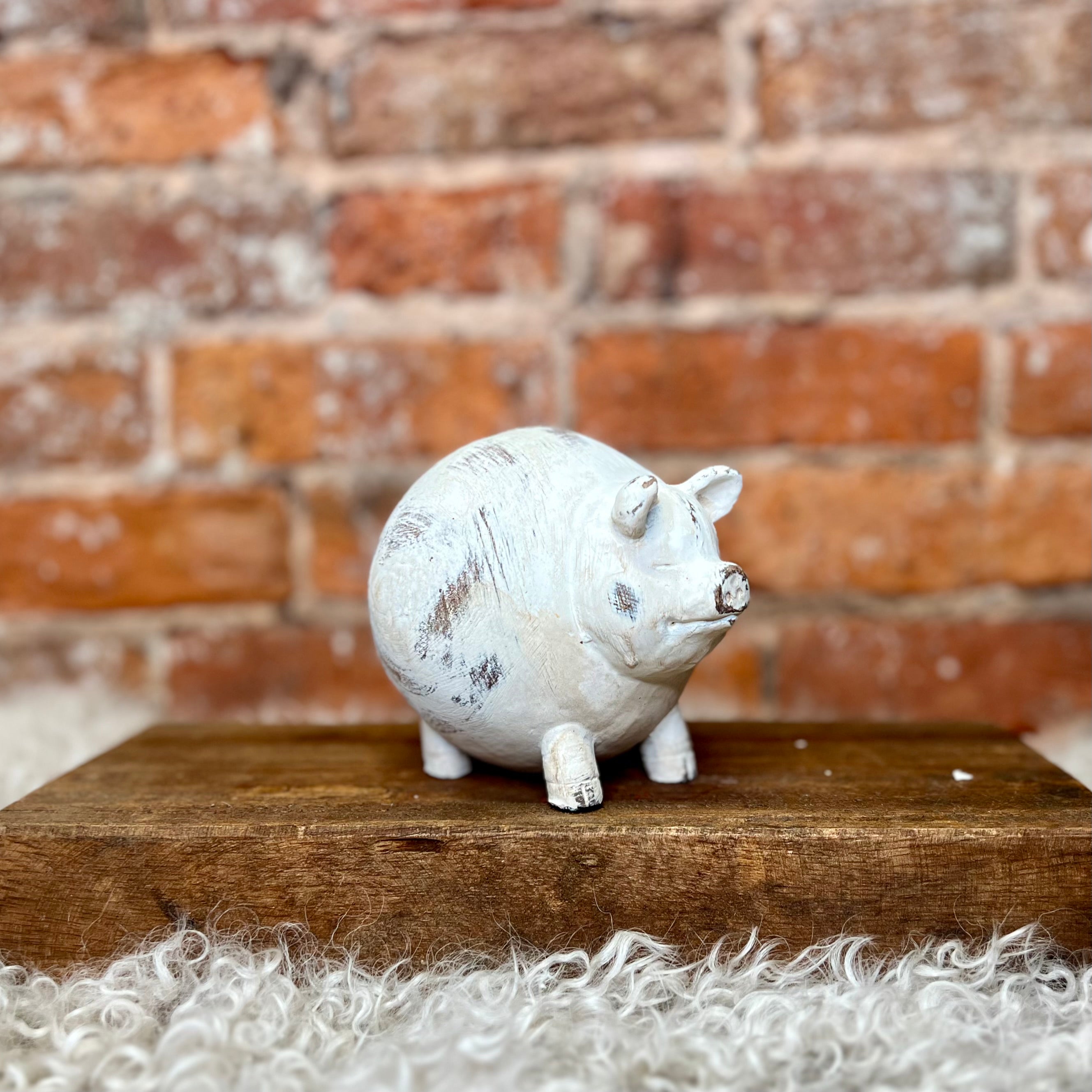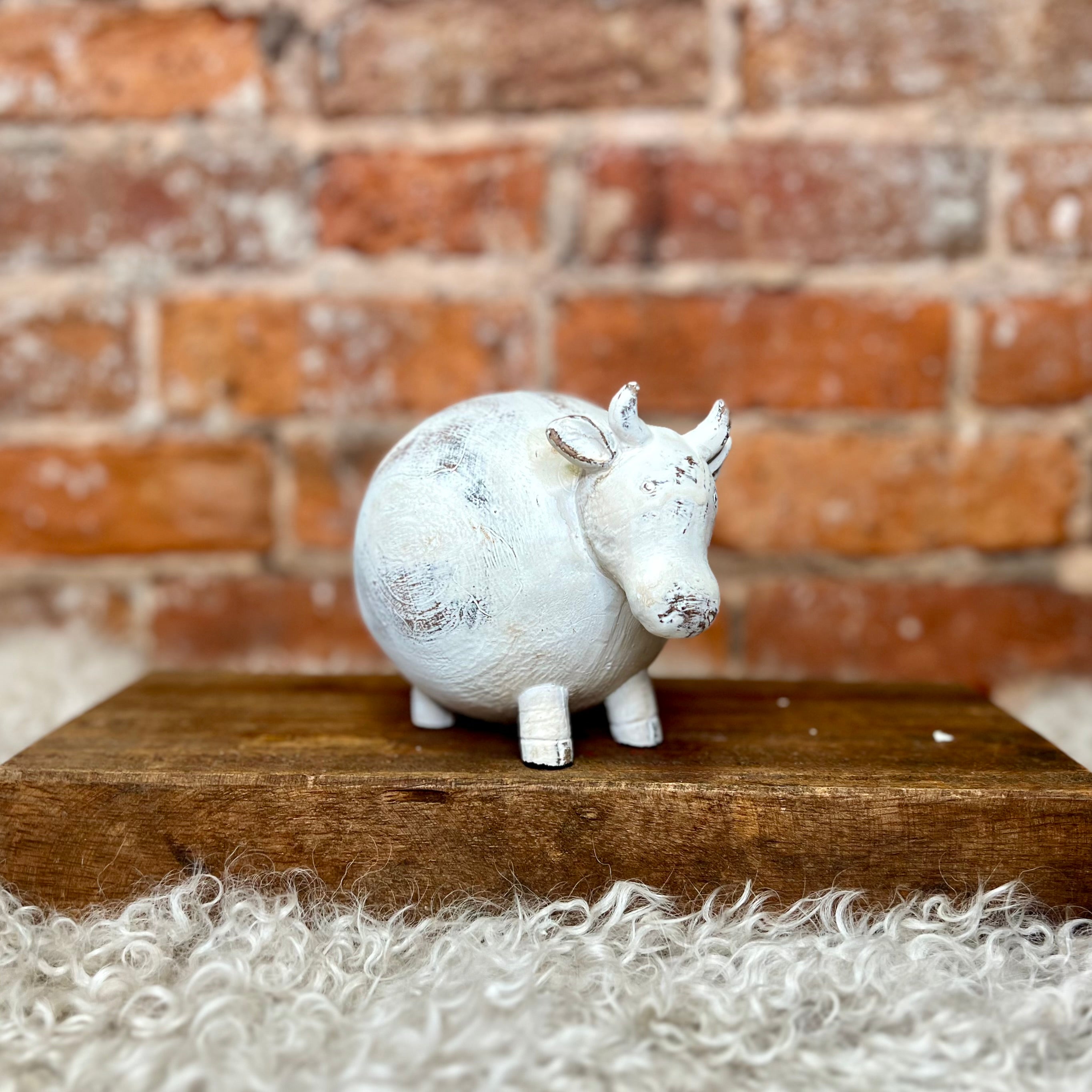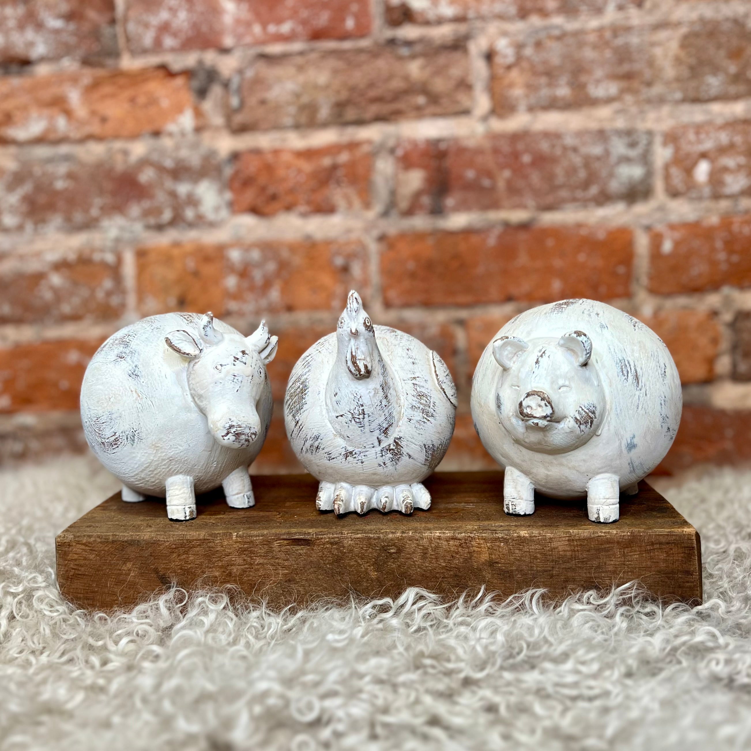 This delightful trio of round resin farm animals are each 4.5-inch pieces featuring a cow, pig, and chicken. Colored in a creamy white with brown scratched and worn detailing that helps give them a rustic look. These simple, chunky animals are perfect for farmhouse shelves and garden displays. Together or solo, create your own little barnyard scene with these adorable companions.