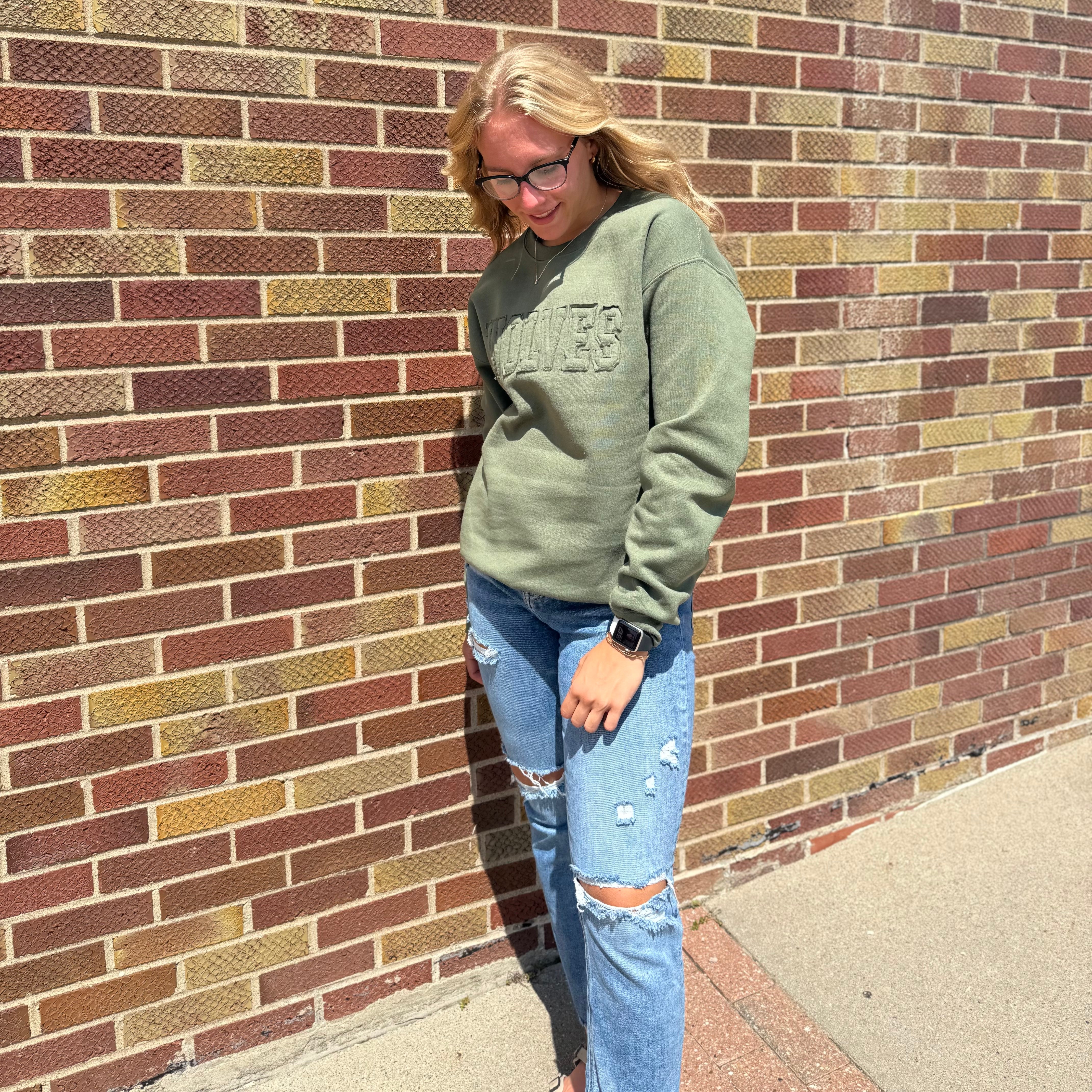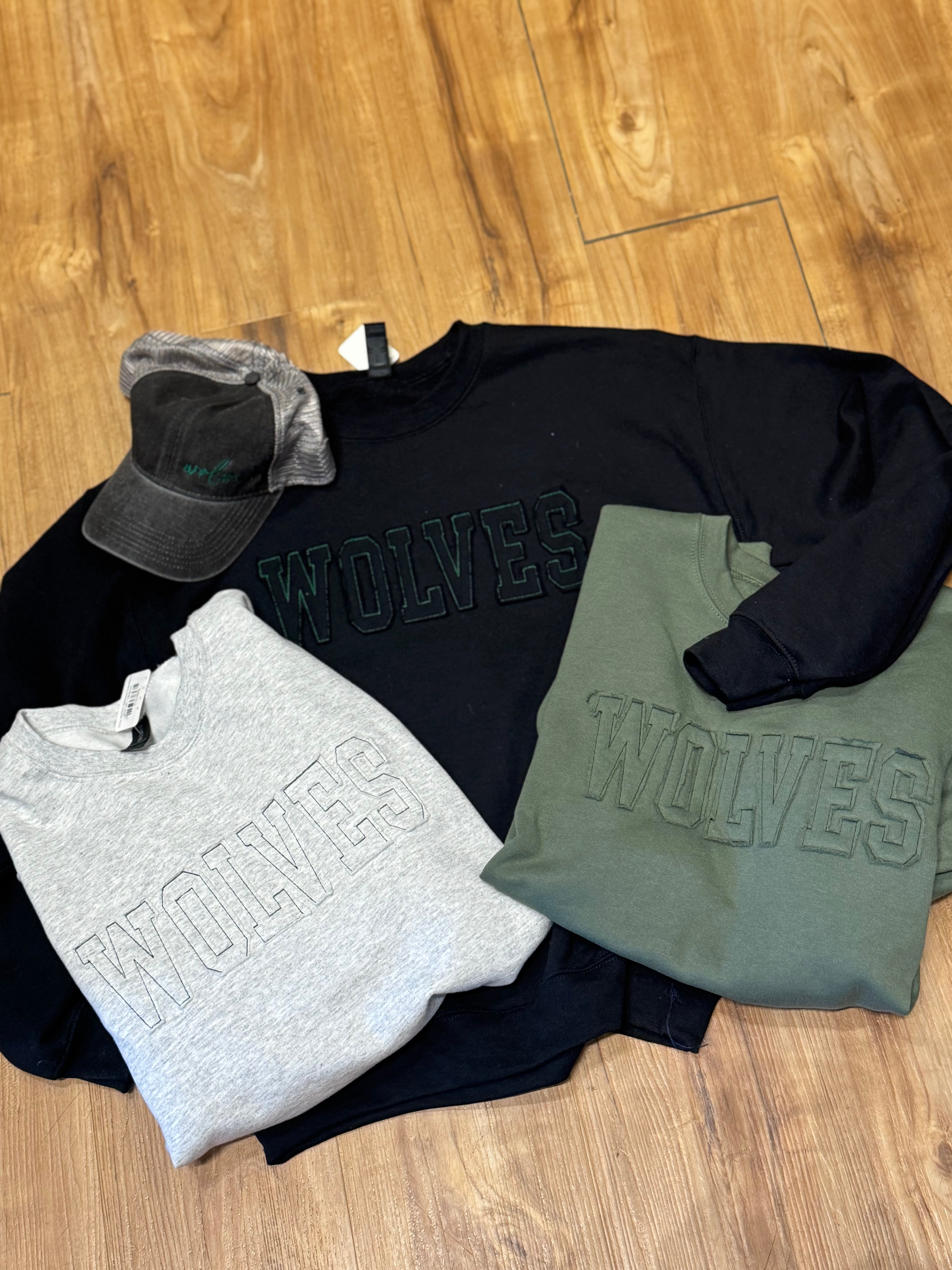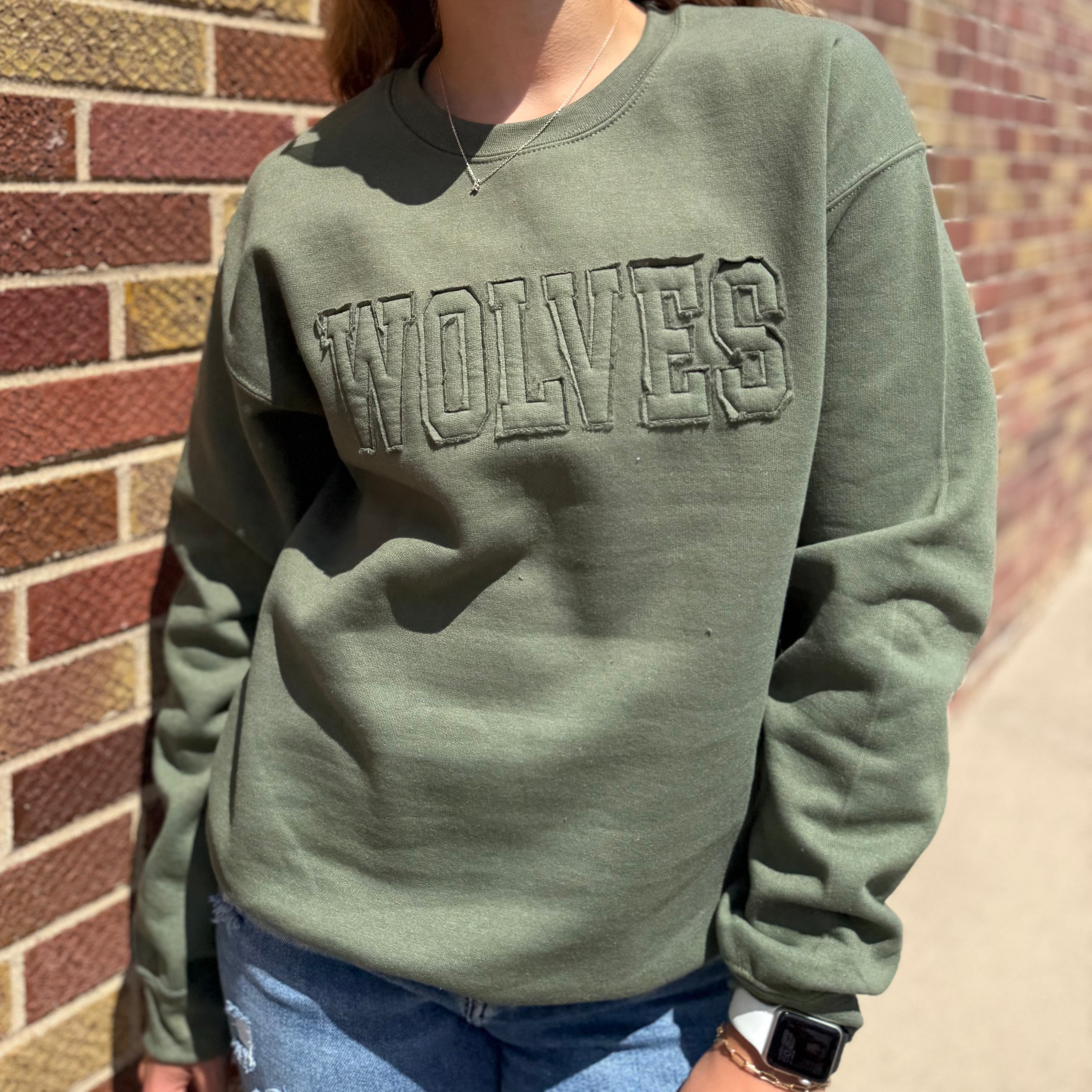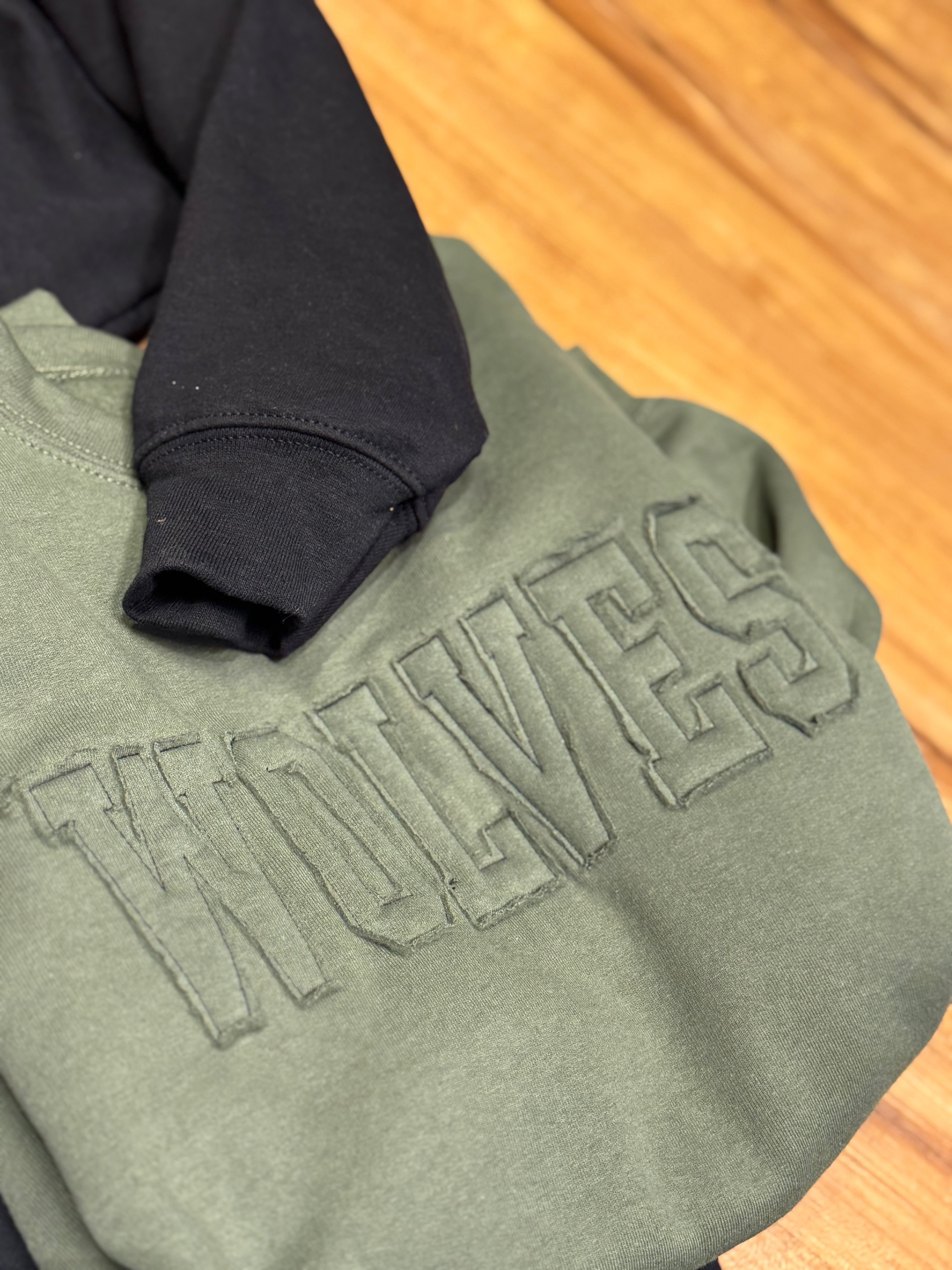 Show your school pride with our Green Applique Wolves Sweatshirt featuring bold green threading on black fabric. The front proudly displays the word "Wolves," making it perfect for fans and students alike. Its comfortable fit and striking design make it an ideal choice to showcase your spirit during any occasion.