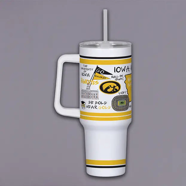 This Iowa tumbler is perfect for all Iowa fans! This cup is 40 oz, has a handle or convenience, and is decorated with sayings and logos all Iowa fans will know and love!