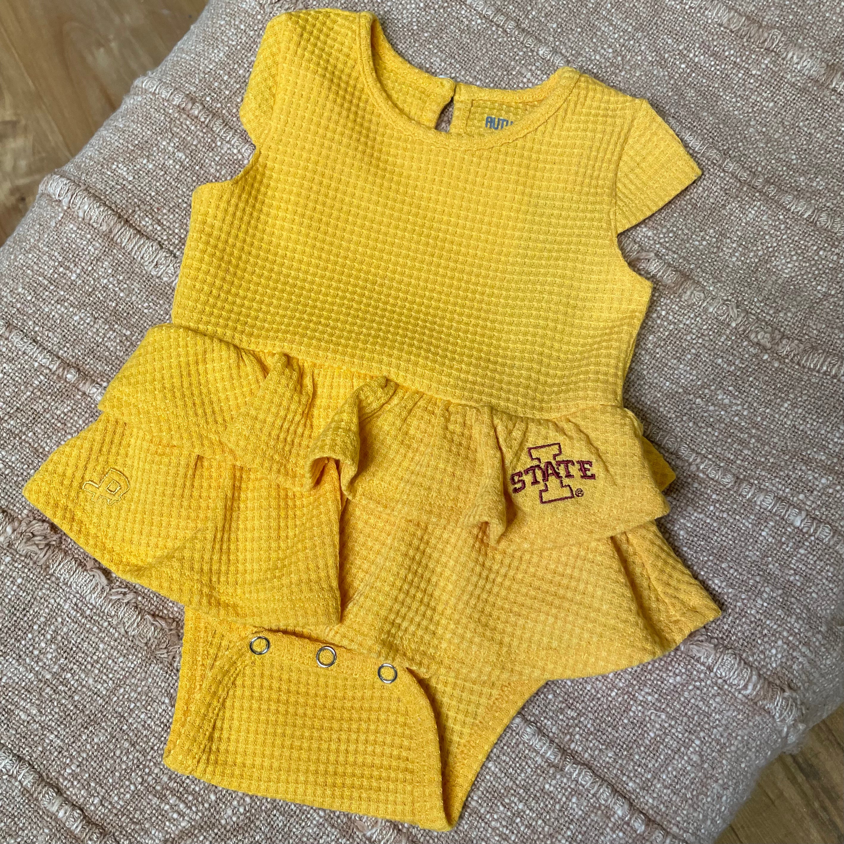 This yellow short-sleeve infant romper is crafted from waffle fabric and features a charming ruffle bottom. The Iowa State logo is subtly placed on the bottom right, combining comfort and team pride in a thoughtfully designed piece for young fans