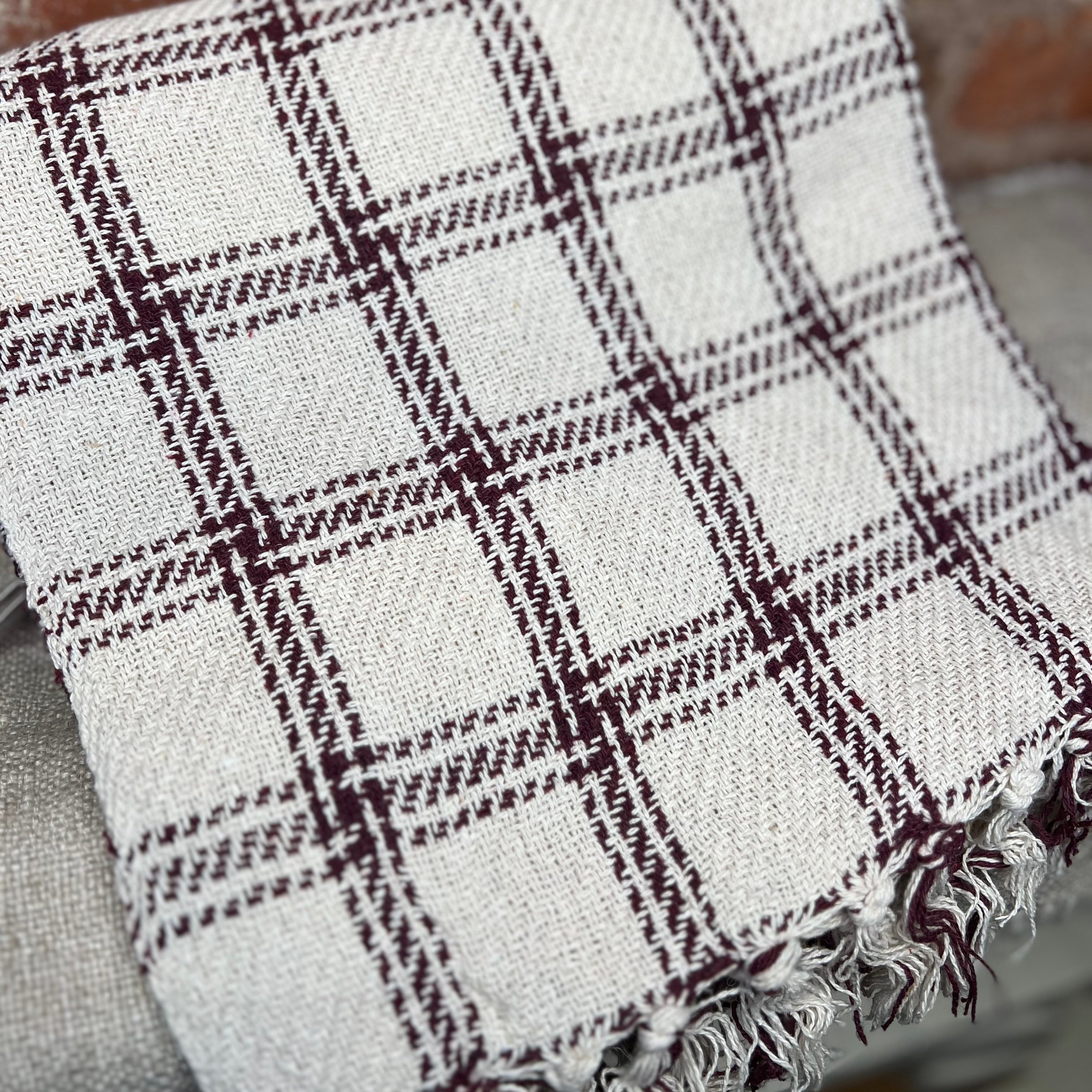 A cotton throw blanket displaying a plaid pattern in a blush inspired fall color palette woven throughout with tassels on top and bottom edge. Seasonal throw blanket measures 50 x 60 inches giving plenty of coverage to accent furniture or to cozy up under the blanket. Our Burgundy Plaid throw blanket is conveniently machine-washable for easy cleaning.