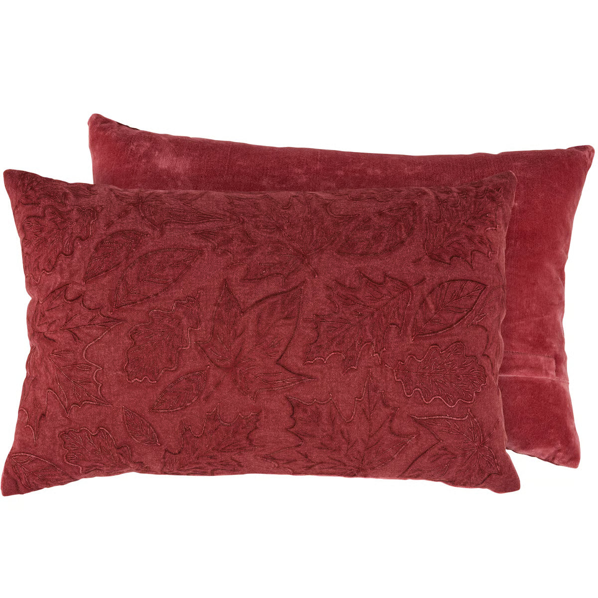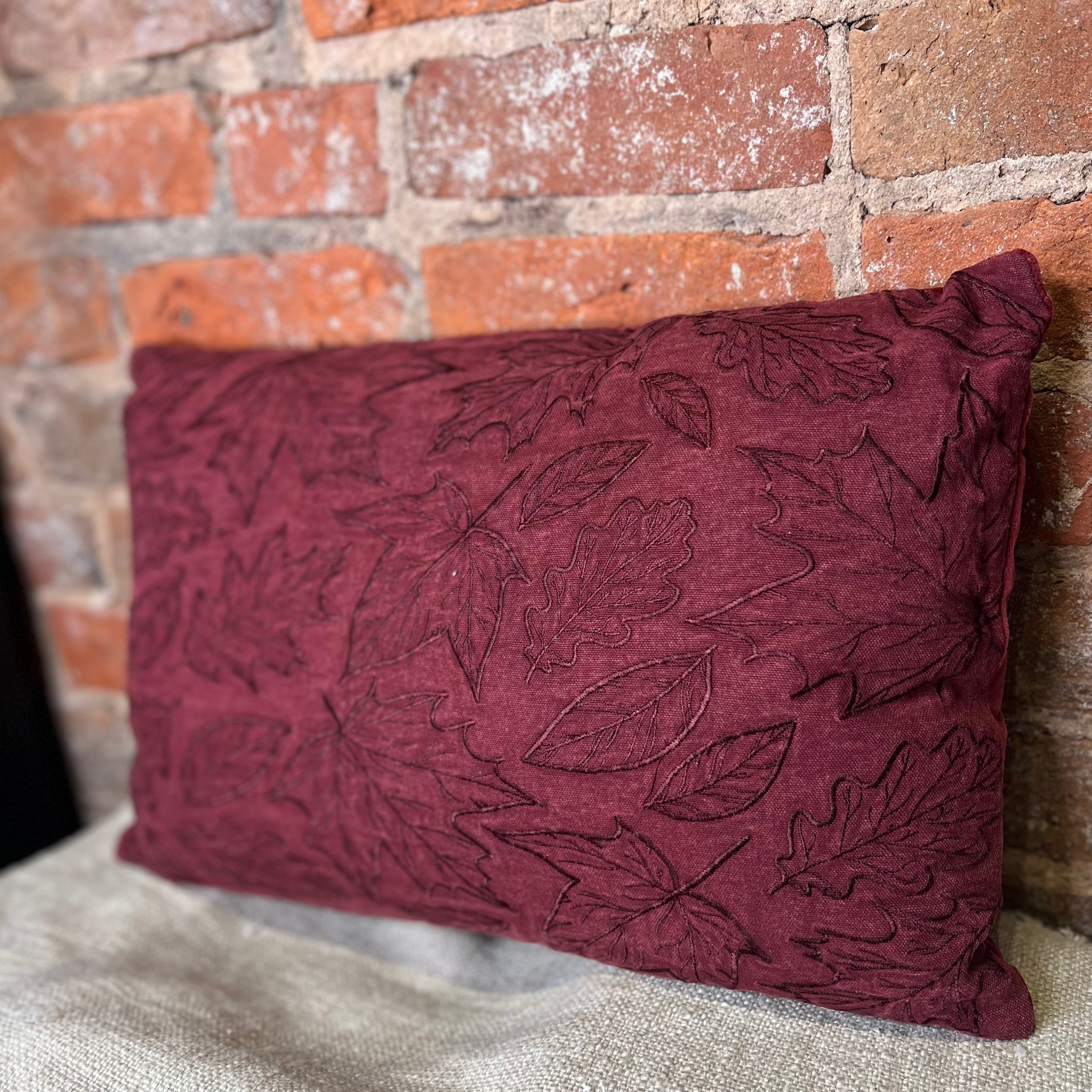 A decorative cotton-linen pillow displaying embroidered falling leaf designs on a blush inspired autumn red color. Pillow features coordinating red velvet on back. Our Falling Leaves pillow includes a zipper to easily remove and clean machine-washable pillow cover. Contains polyester filling and is shipped vacuum-sealed for protection and storage. A stylish seasonal home accent perfect for any room.