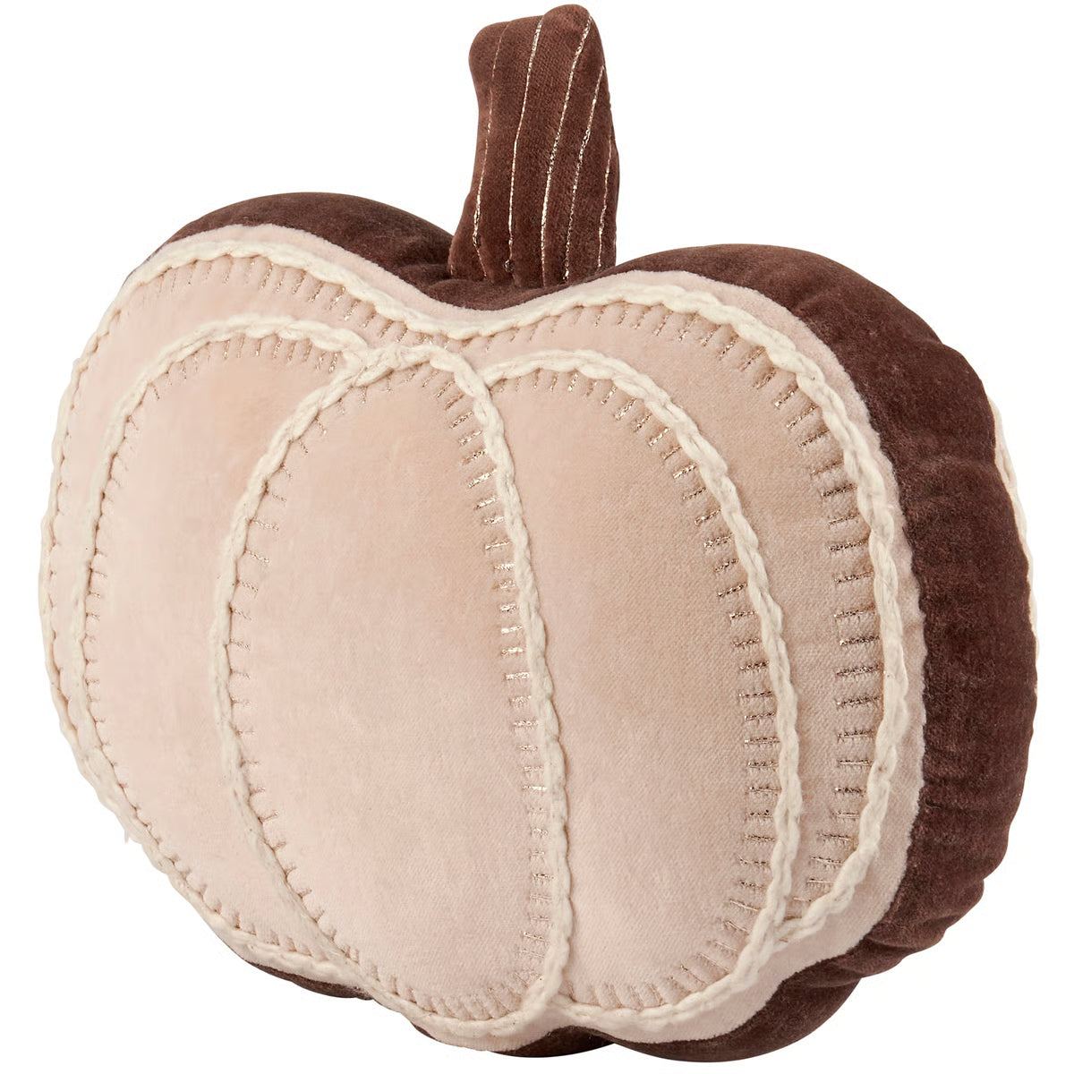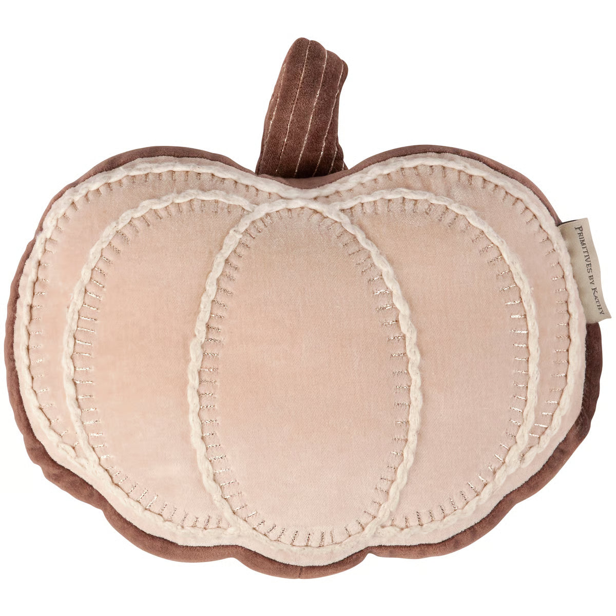 A decorative pillow in the shape of a pumpkin. Pumpkin design features velvet material in a blush inspired fall color palette with metallic thread details throughout. Our Pumpkin shaped pillow contains polyester filling and is shipped vacuum-sealed for protection and storage. A blush inspired fall home accent perfect for seasonal use.
