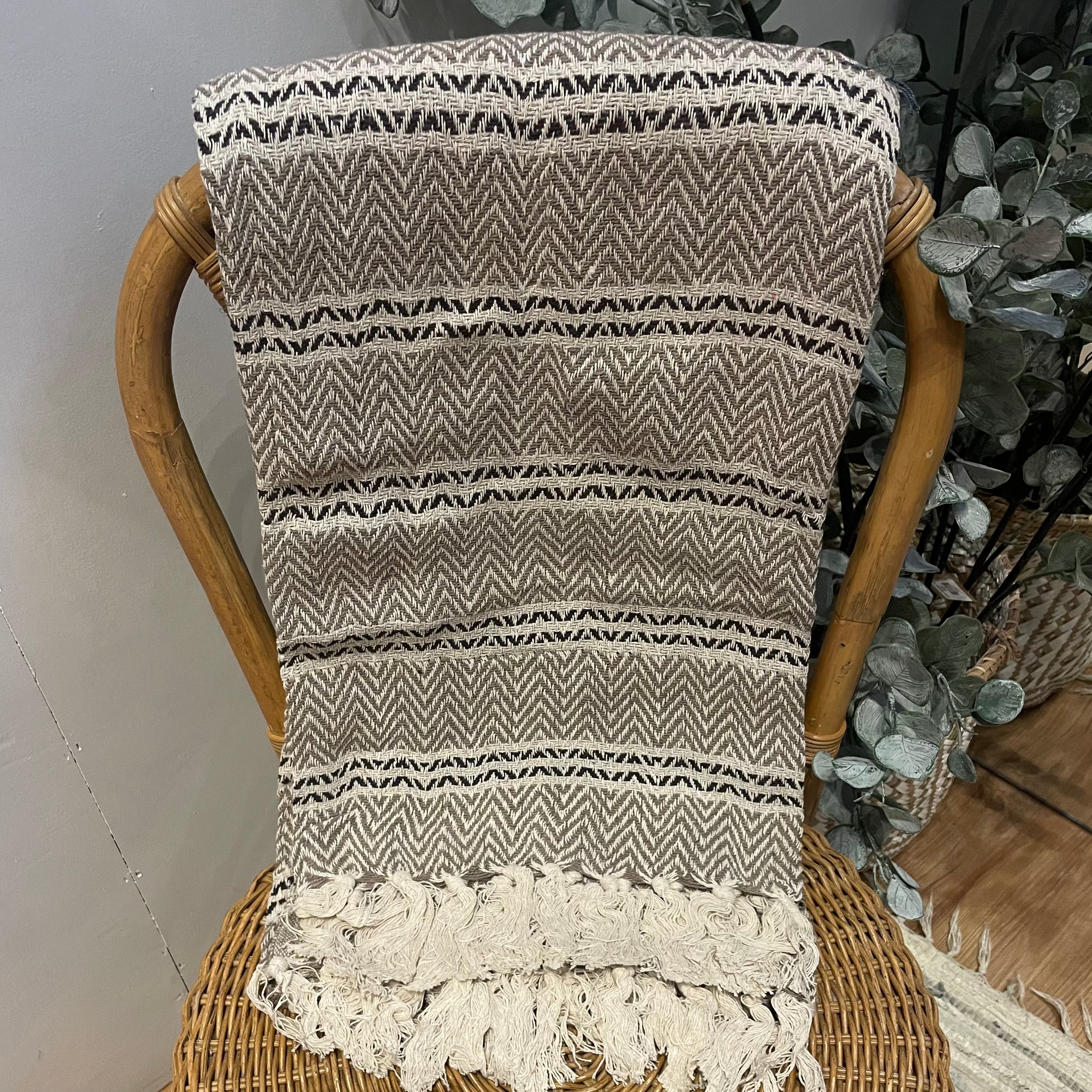 Add a touch of elegance to your home with our Tan & Black Striped Woven Throw. The sophisticated color combination and intricate weaving add a cozy and stylish touch to any room. Measuring 50x60", this throw is perfect for snuggling up on cold nights.