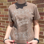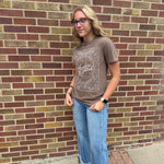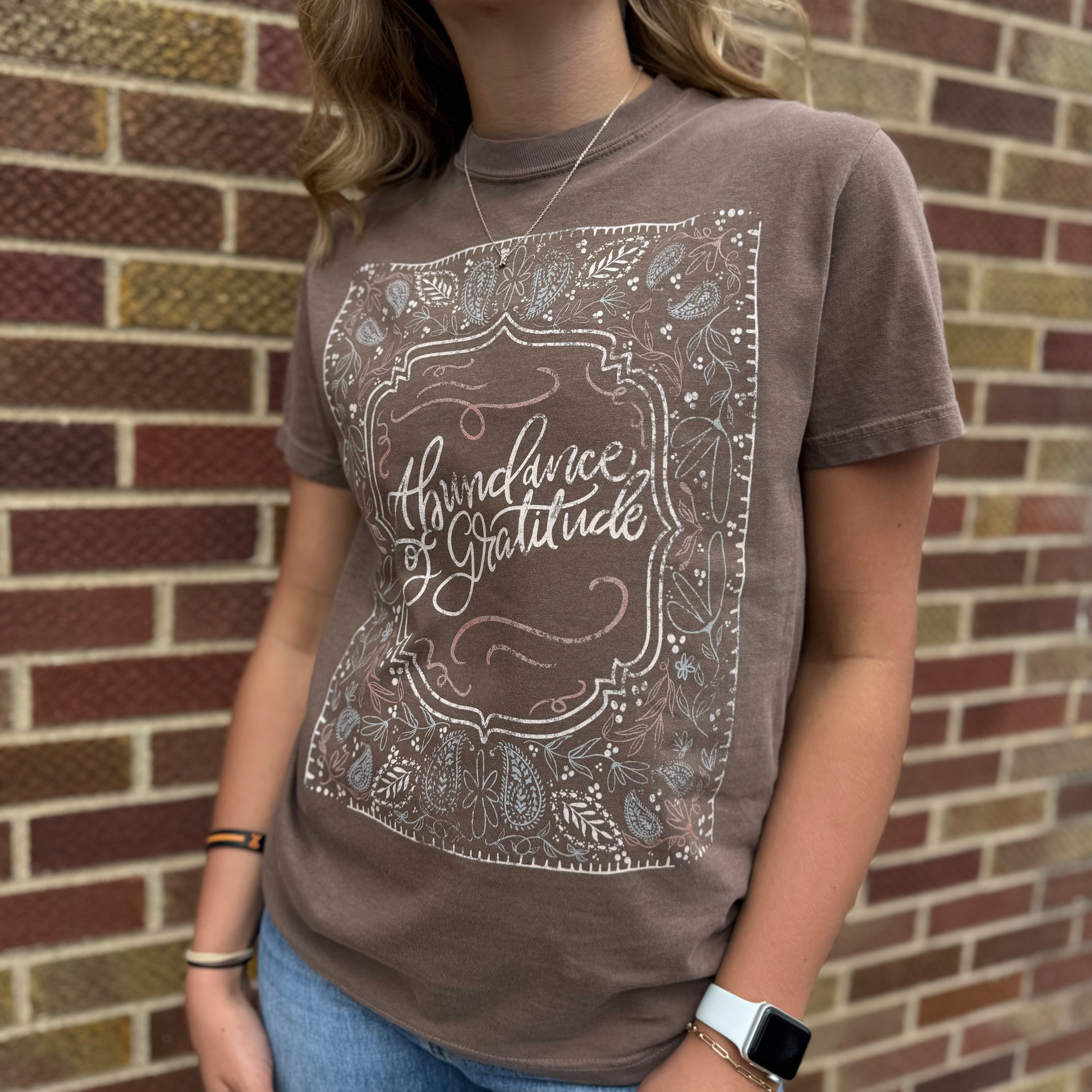 This rustic brown t-shirt features elegant script wording complemented by delicate floral and plant illustrations, embodying a warm country style. Its comfortable fit and natural tones make it an ideal choice for those who appreciate understated, heartfelt designs that celebrate gratitude and simplicity.