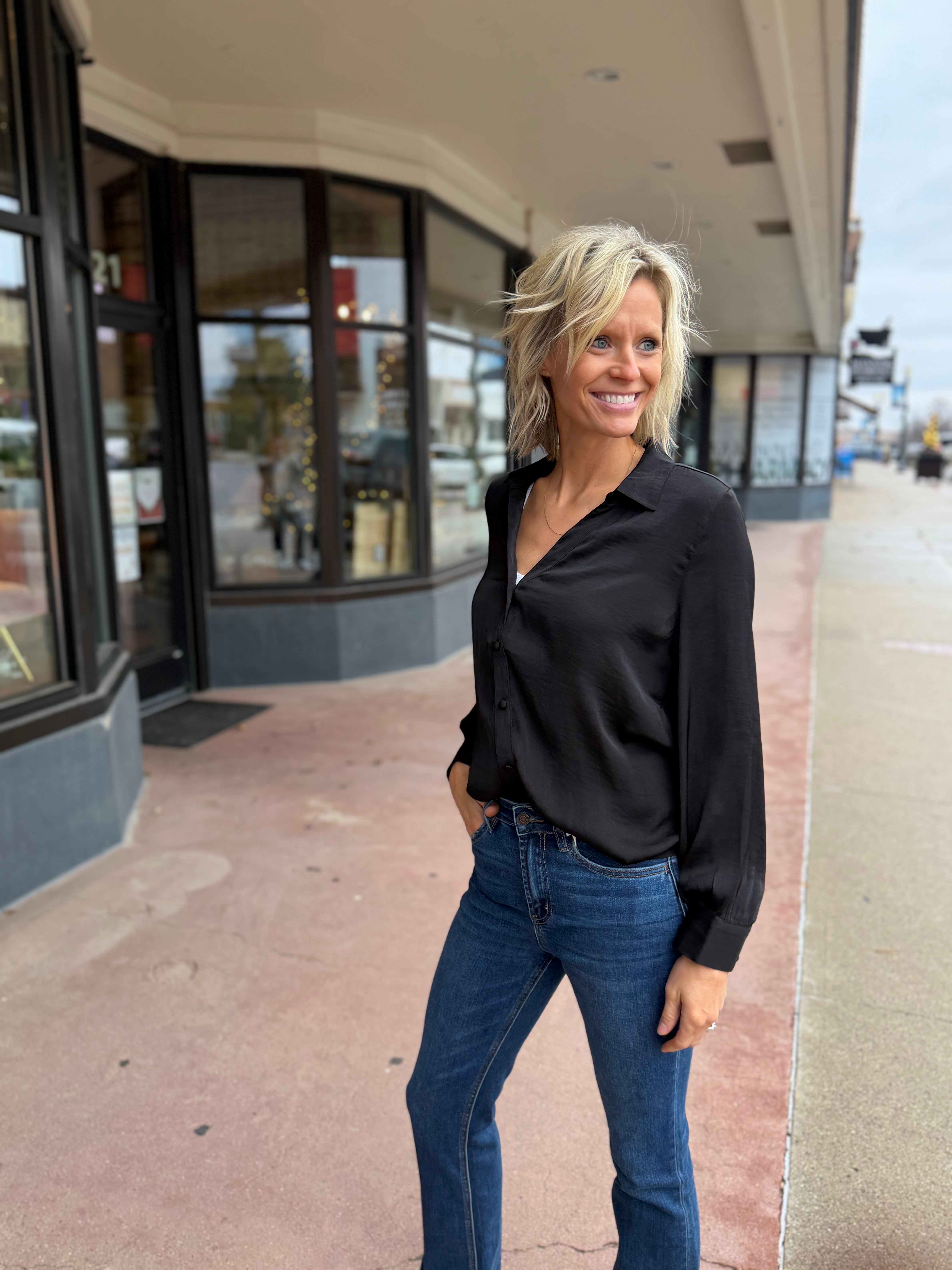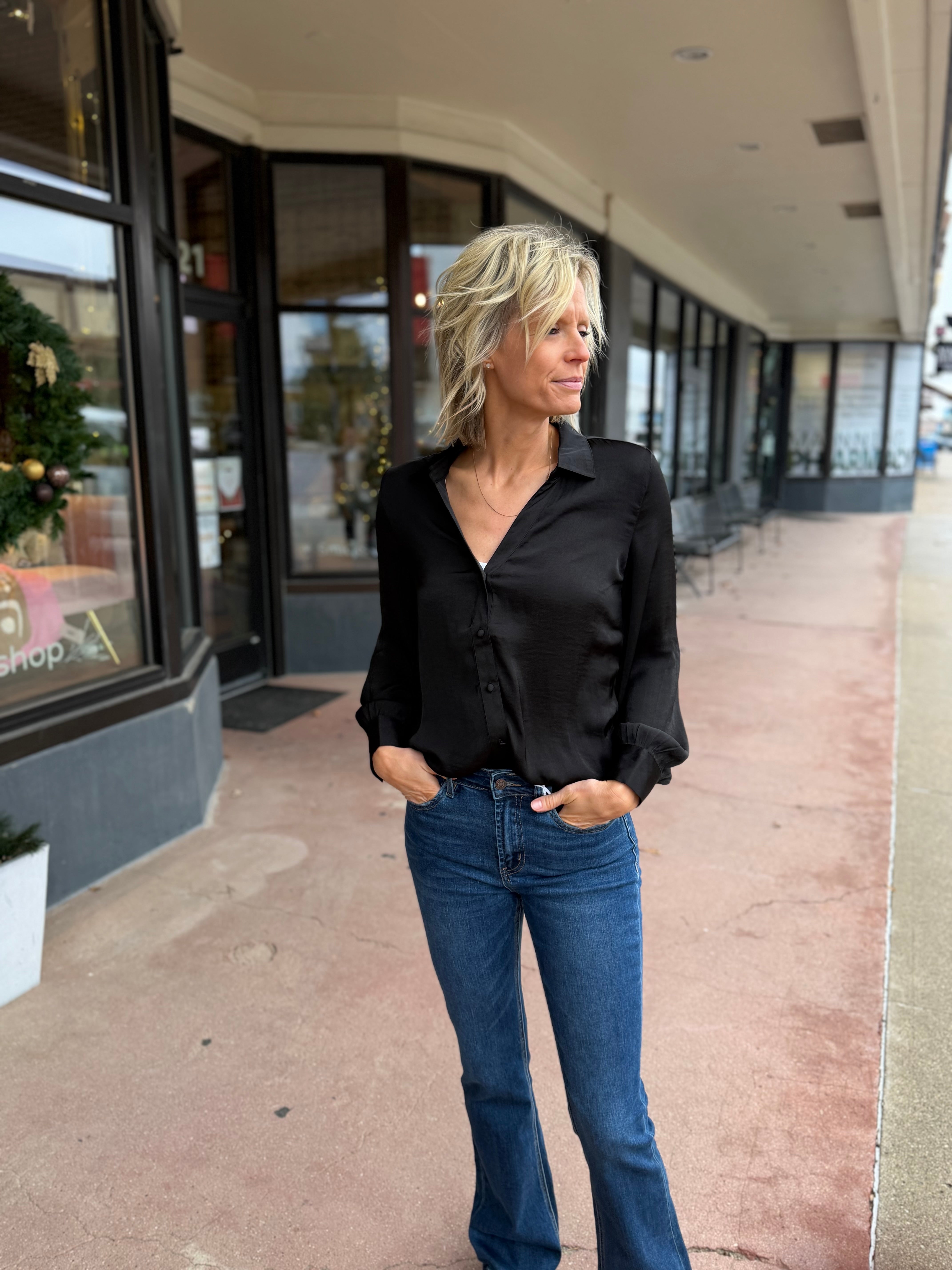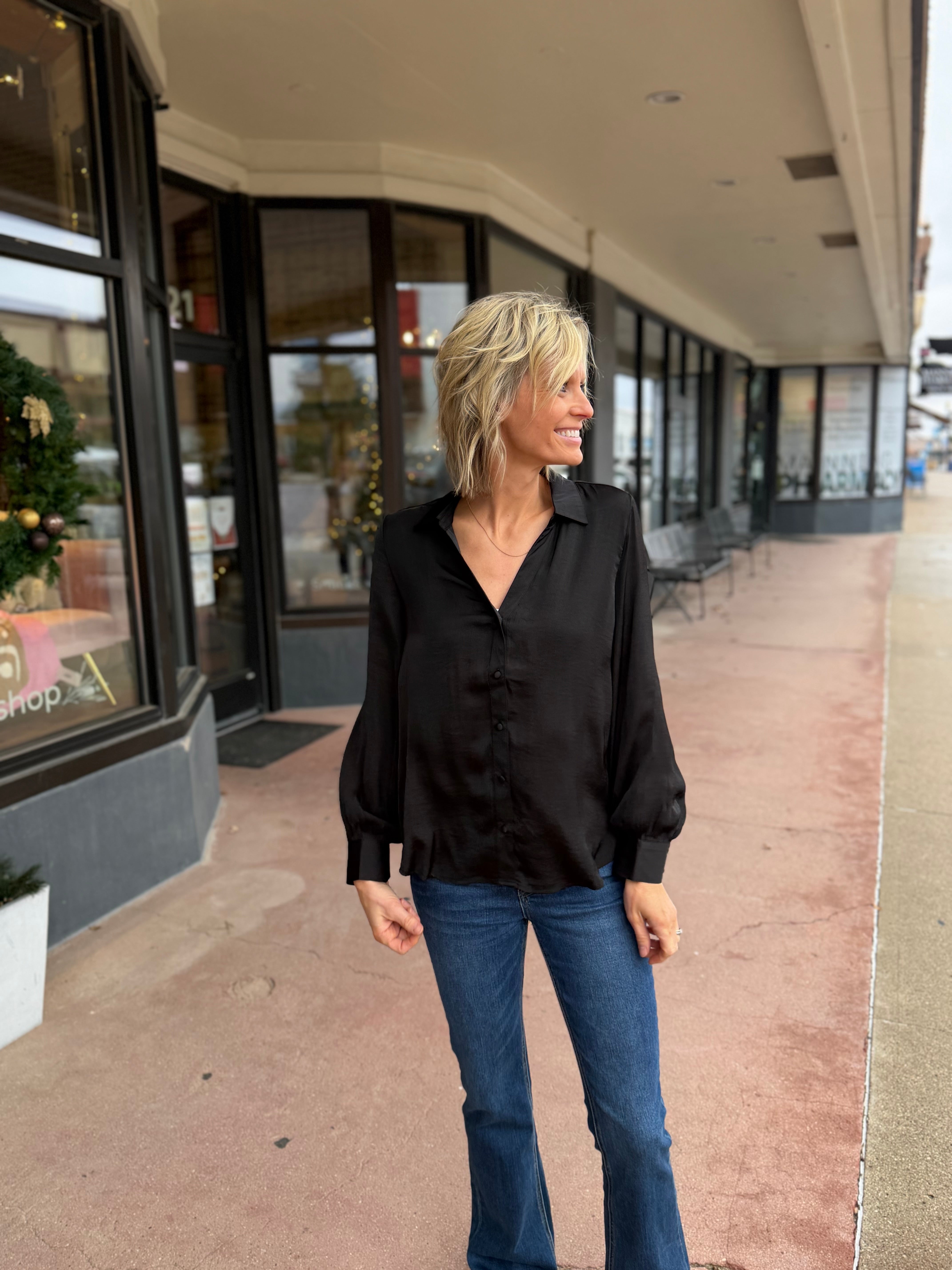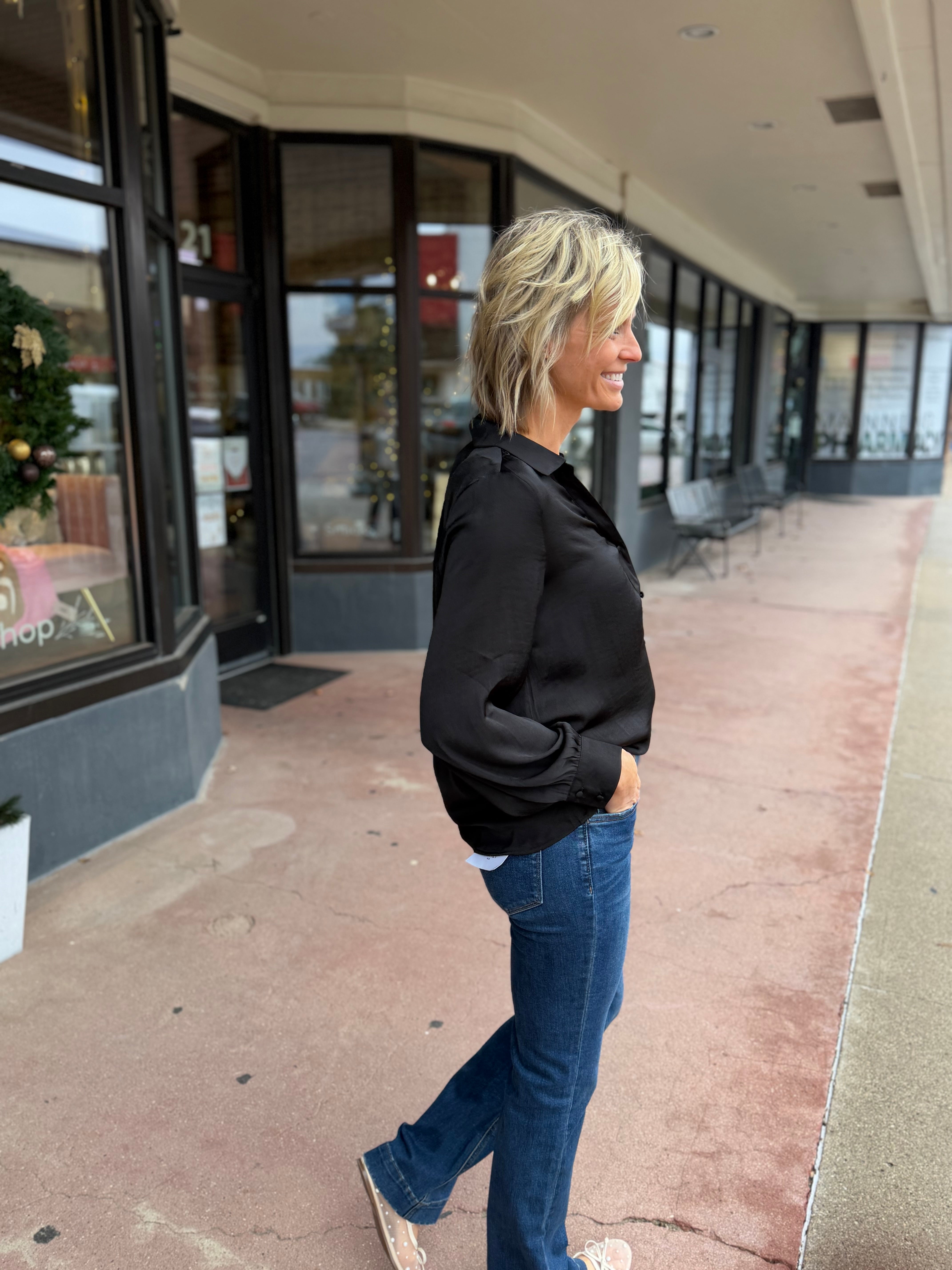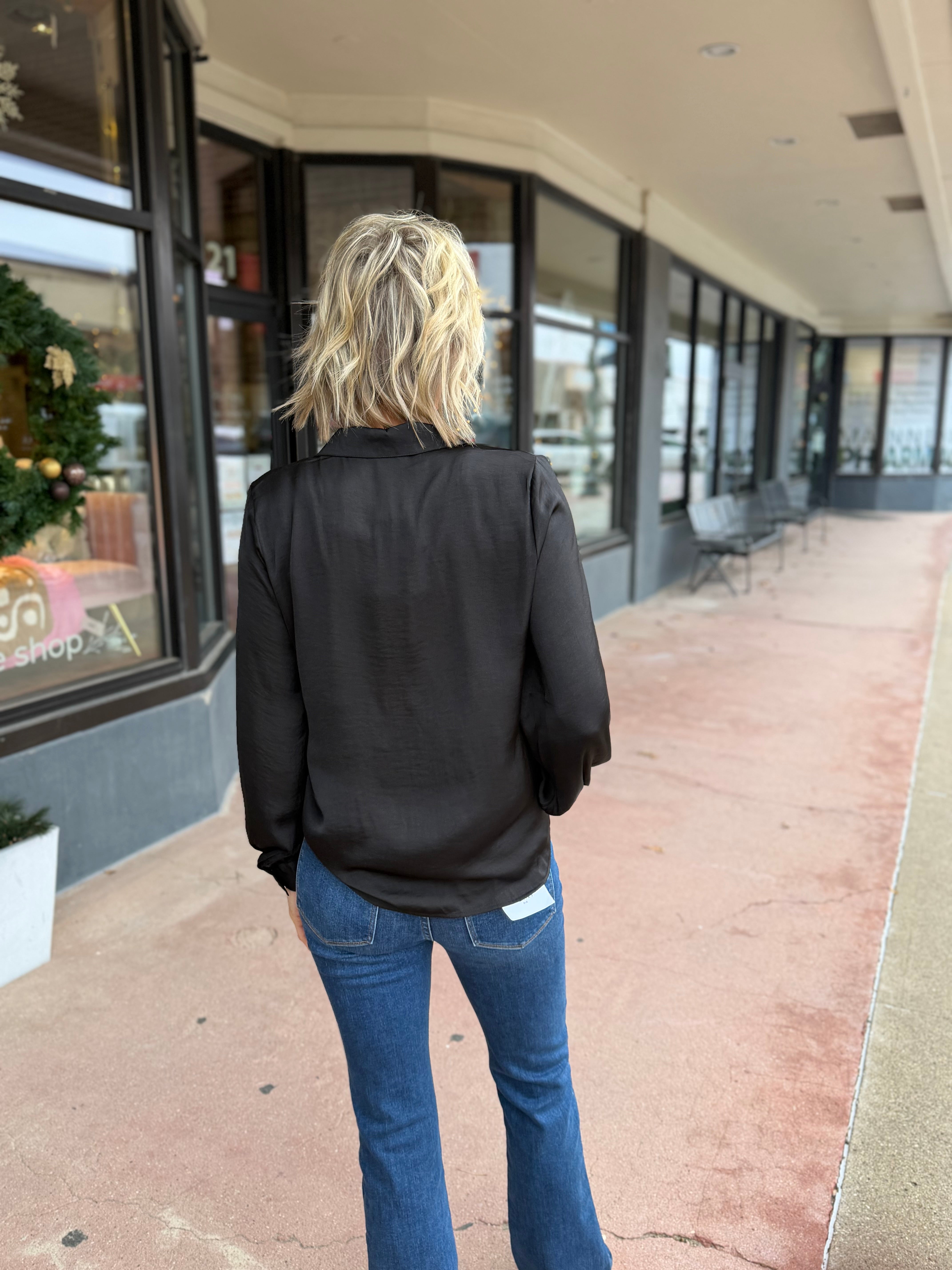 Explore the sophistication of our V-Neck Collared Long Sleeve Blouse, a chic and versatile addition to your fall wardrobe. This blouse features a flattering V-neck and long sleeves, offering both style and comfort for various occasions during the season.