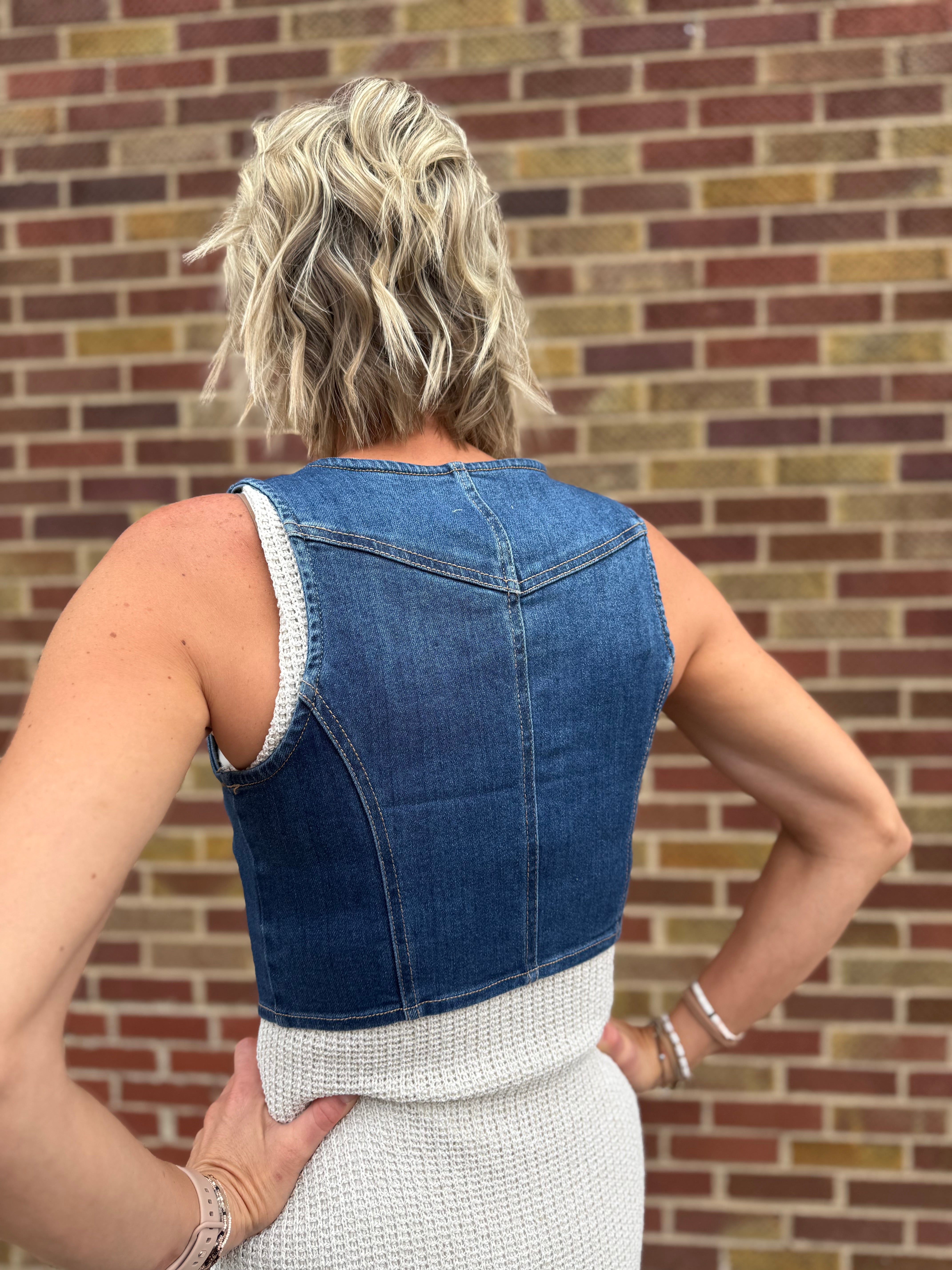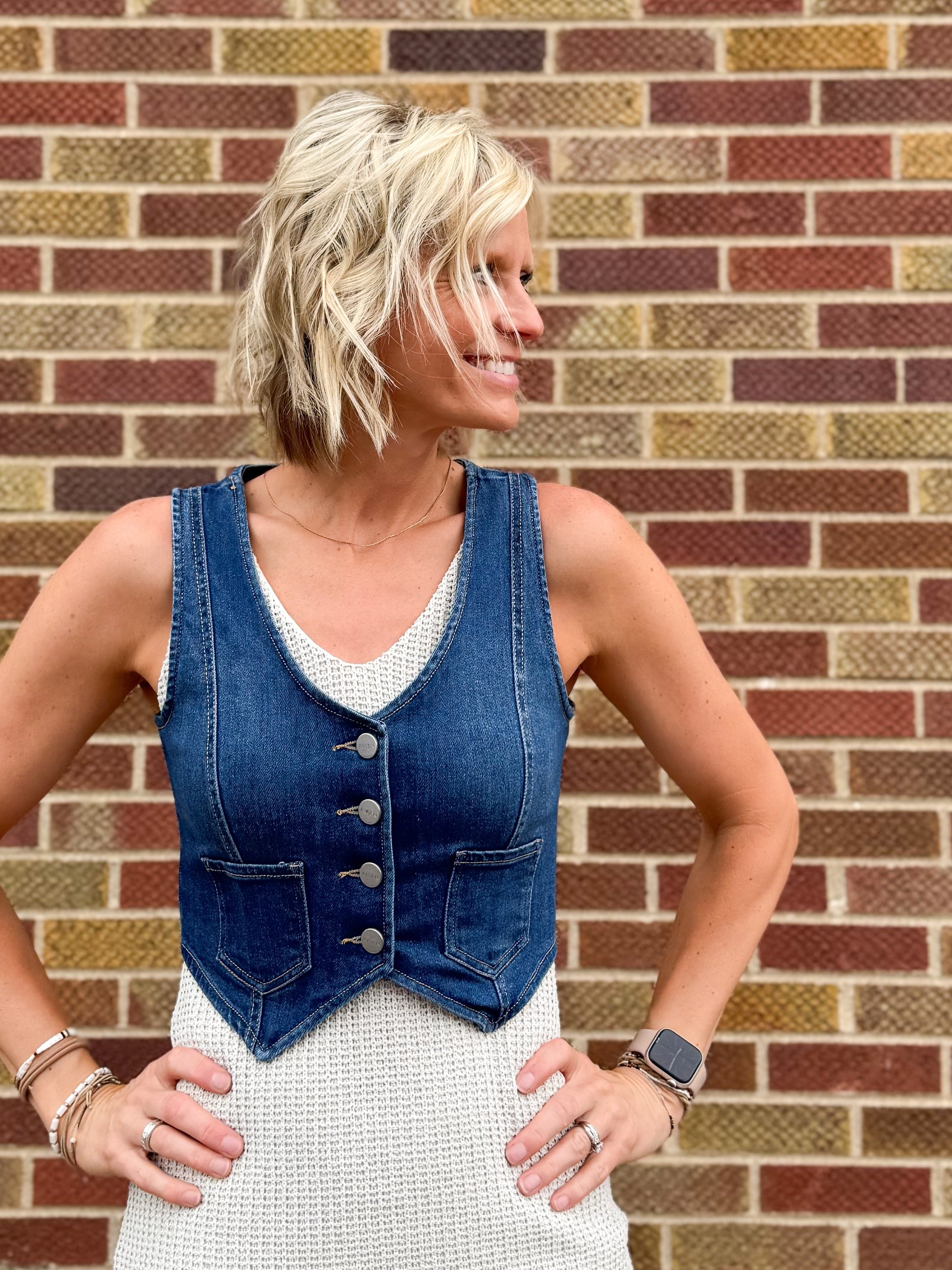 Expertly crafted with metal buttons and 2 small pockets, our Crop Denim Vest offers a classic and practical addition to your wardrobe. Designed to add versatility to any outfit, this vest provides effortless style and convenience.