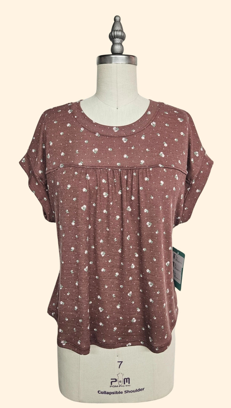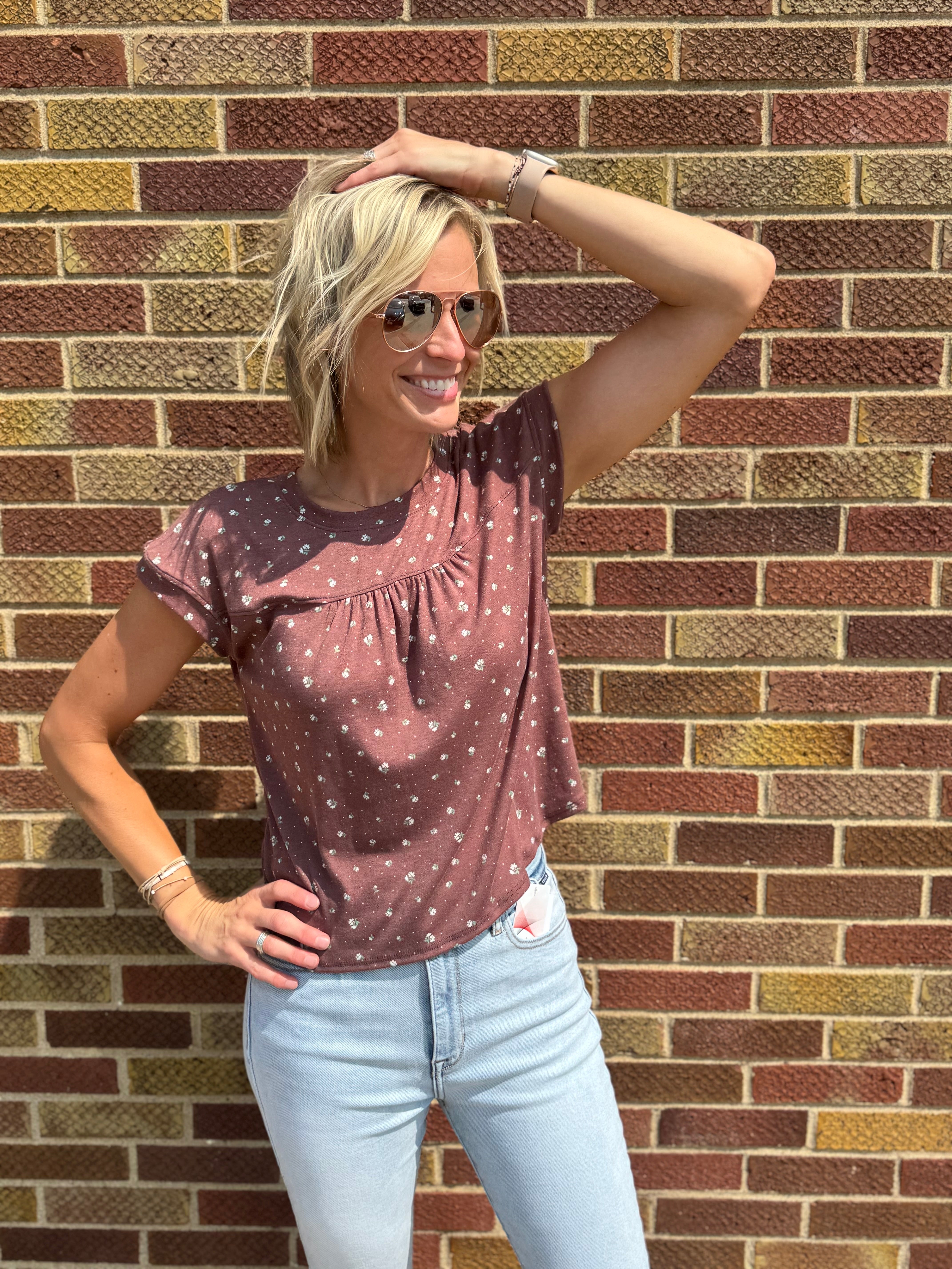 The Ditsy Floral Knit Top features stretchy, lightweight fabric, it offers a flattering fit that moves with you all day. The rich maroon color, accented by delicate white flowers, adds a sophisticated yet fresh look to your wardrobe. Elevate your everyday outfits effortlessly with this versatile and charming top.