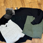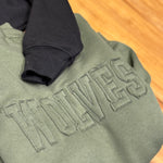 Show your school pride with our Green Applique Wolves Sweatshirt featuring bold green threading on black fabric. The front proudly displays the word "Wolves," making it perfect for fans and students alike. Its comfortable fit and striking design make it an ideal choice to showcase your spirit during any occasion.