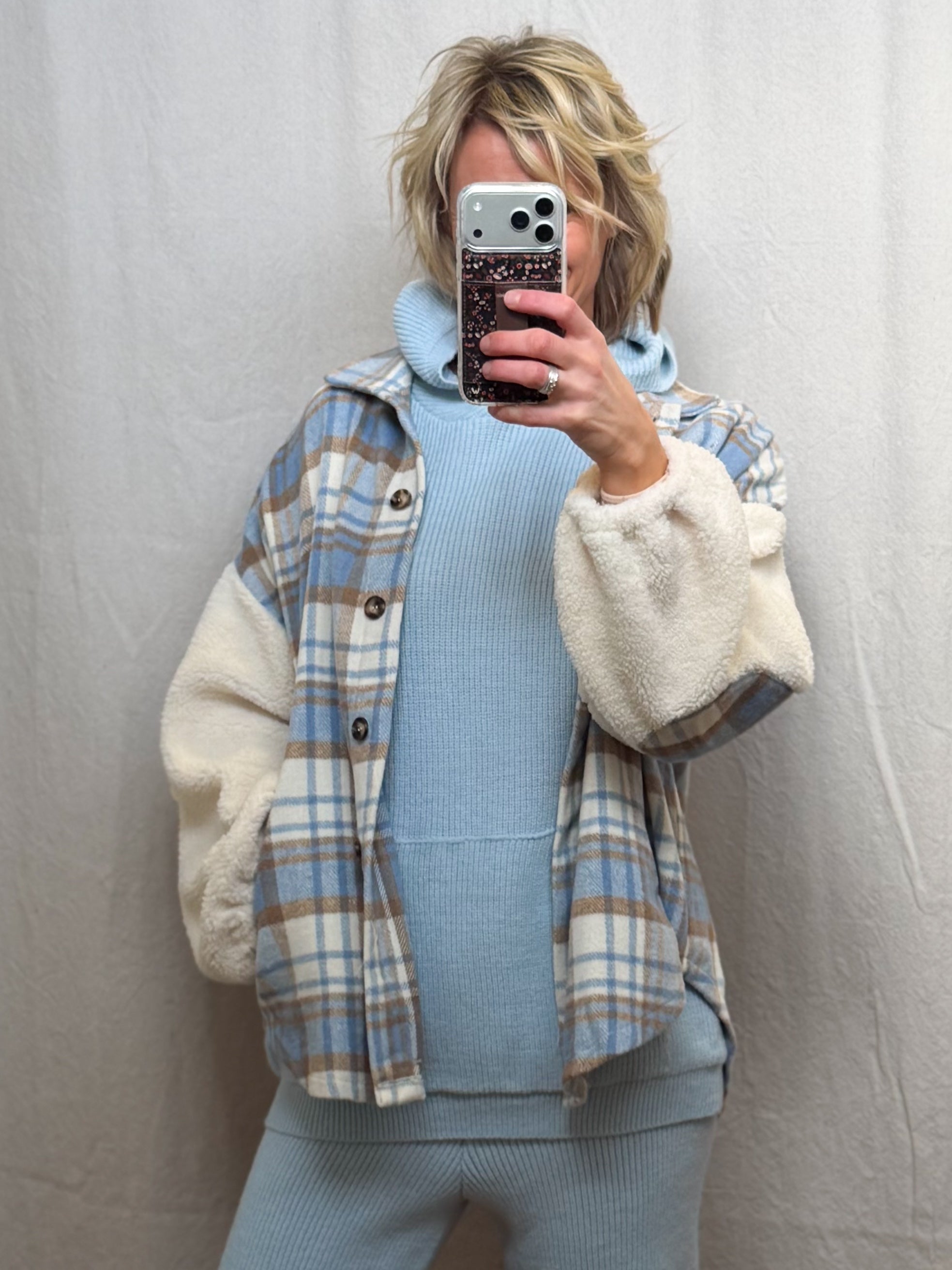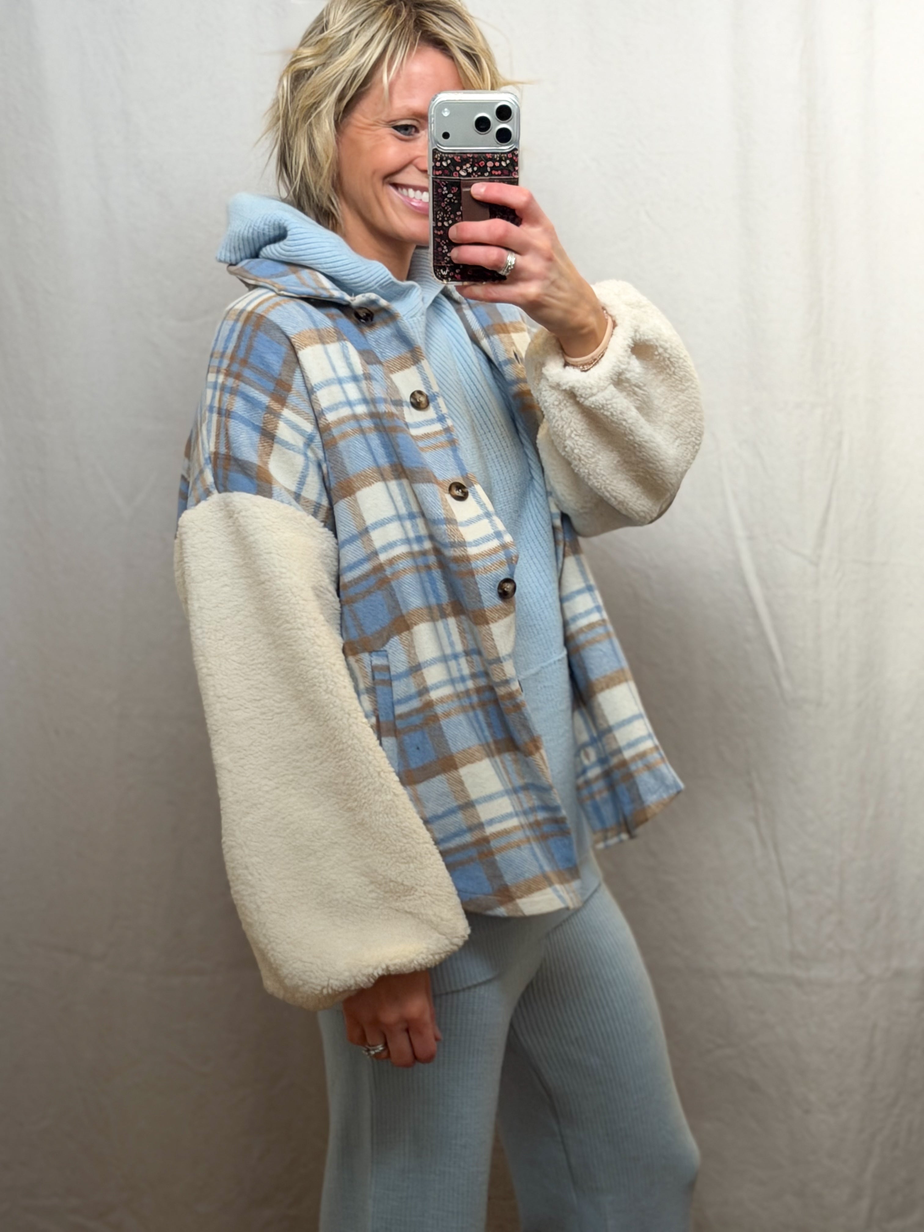 Cozy meets cool in this Plus Plaid Jacket with Teddy Fur Sleeves. Featuring a charming blue, brown, and white plaid pattern, soft teddy fur sleeves, and handy pockets, this button-up jacket is perfect for adding a playful touch to your chilly-day look. Snuggle up in style wherever you go!