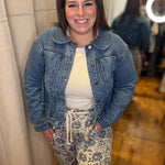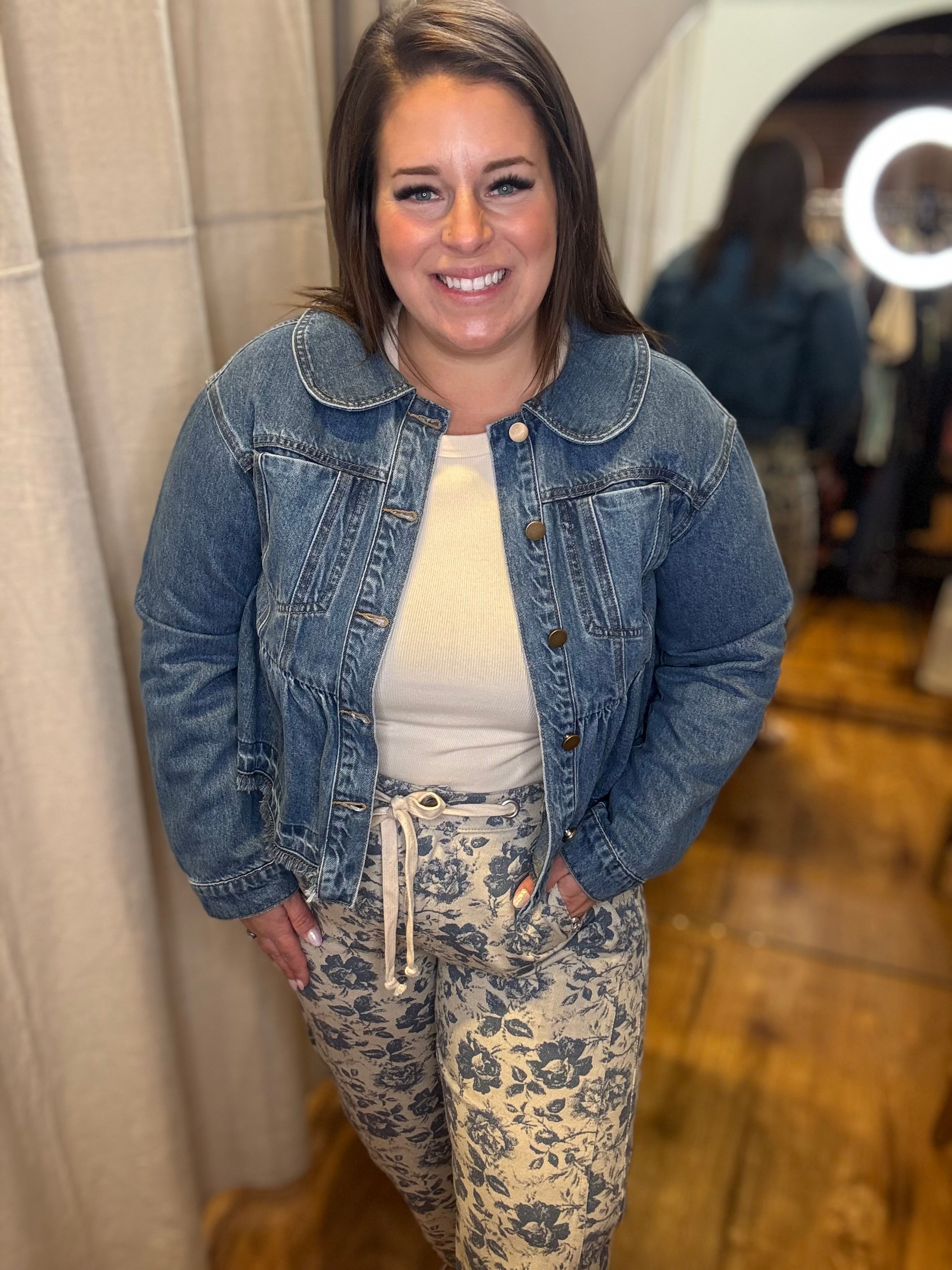 Saddle up in style with this washed cobalt denim jacket that's giving major western vibes. The peplum hem adds a flirty twist to a classic silhouette, making it way more interesting than your standard denim. That perfectly worn-in wash gives it character and pairs beautifully with everything from boots to sneakers. Whether you're channeling cowgirl energy or just love that rugged-meets-feminine aesthetic, this jacket is your new ride-or-die. Layer it over anything and instantly level up your look.