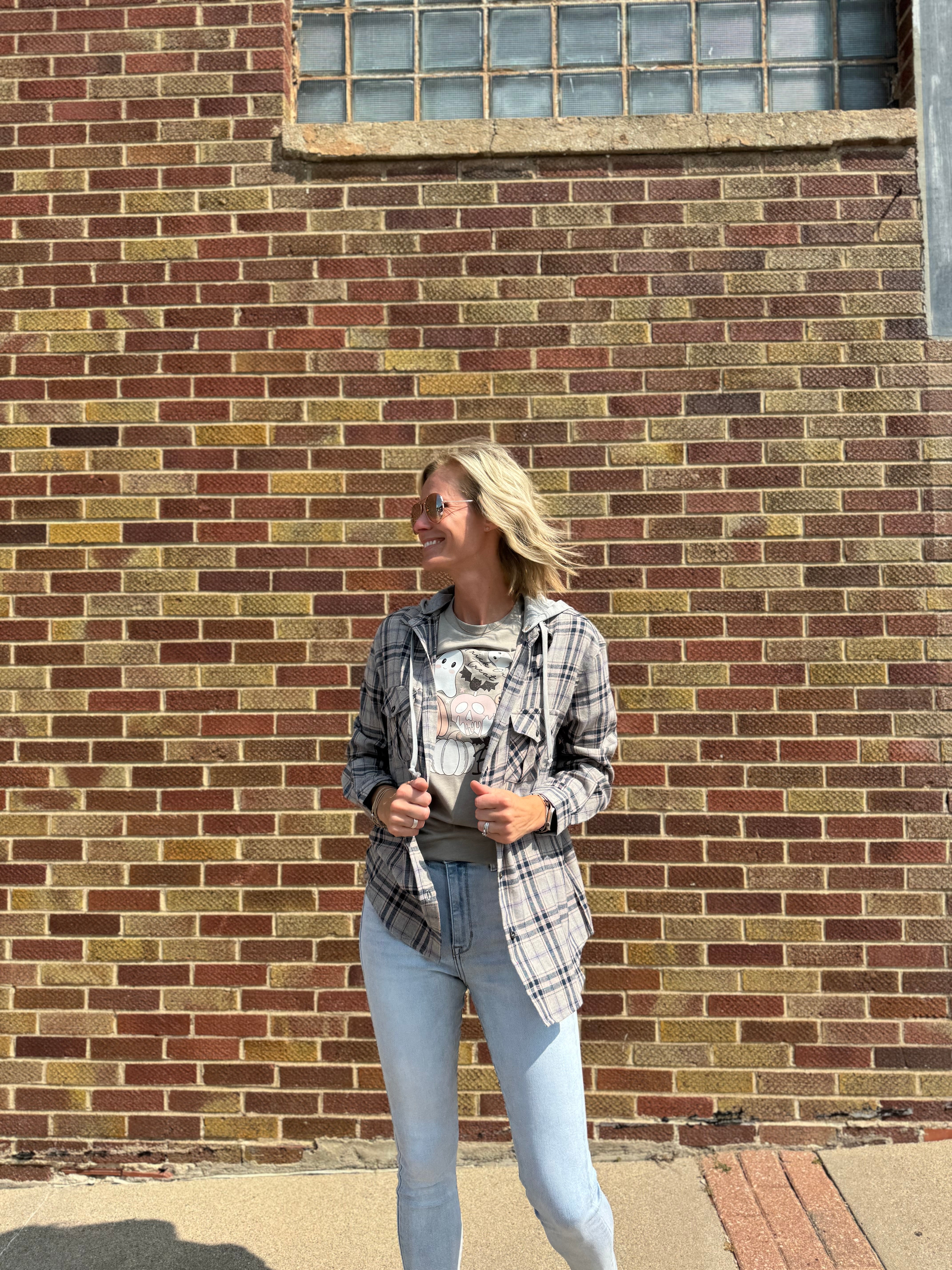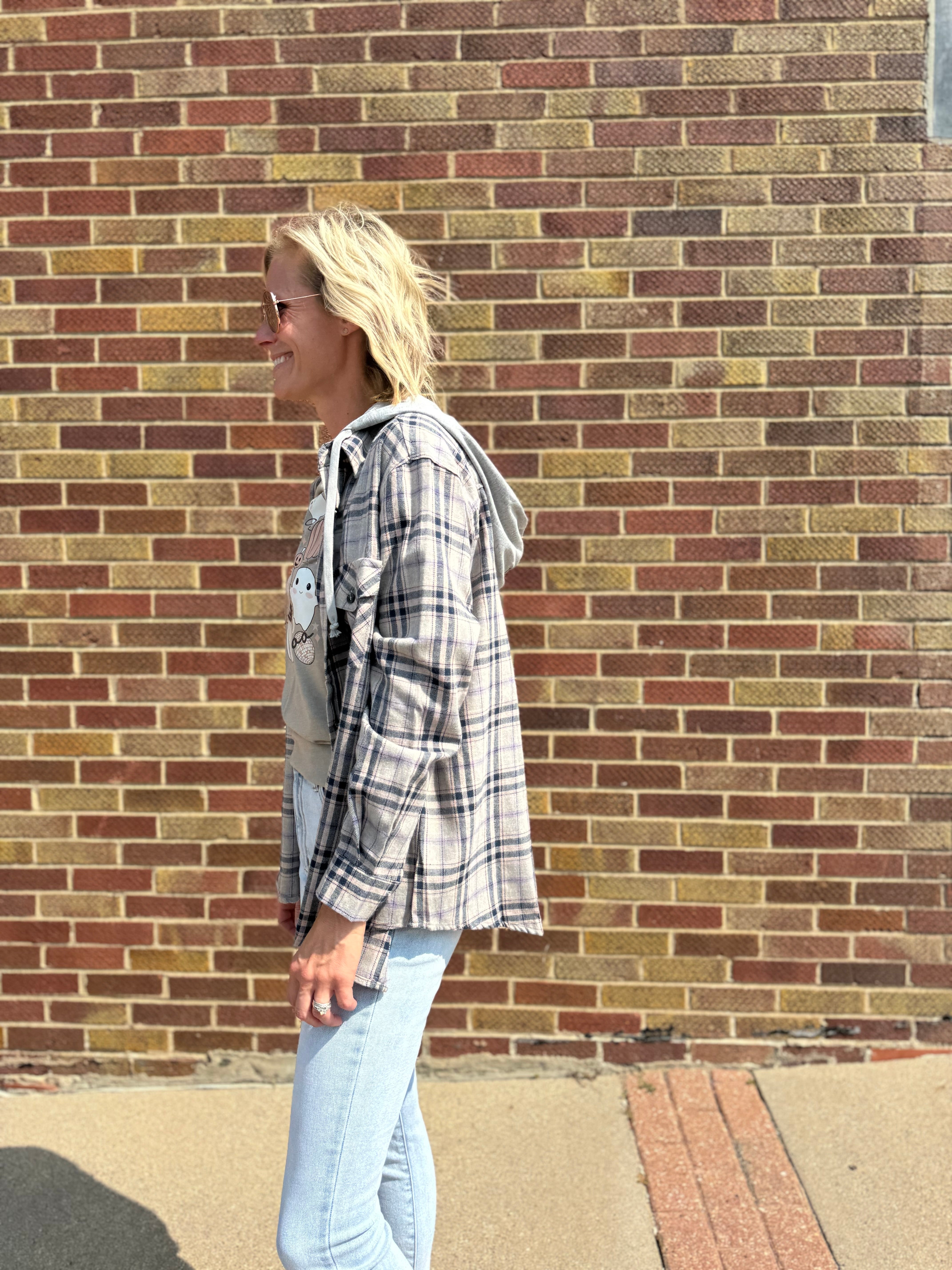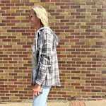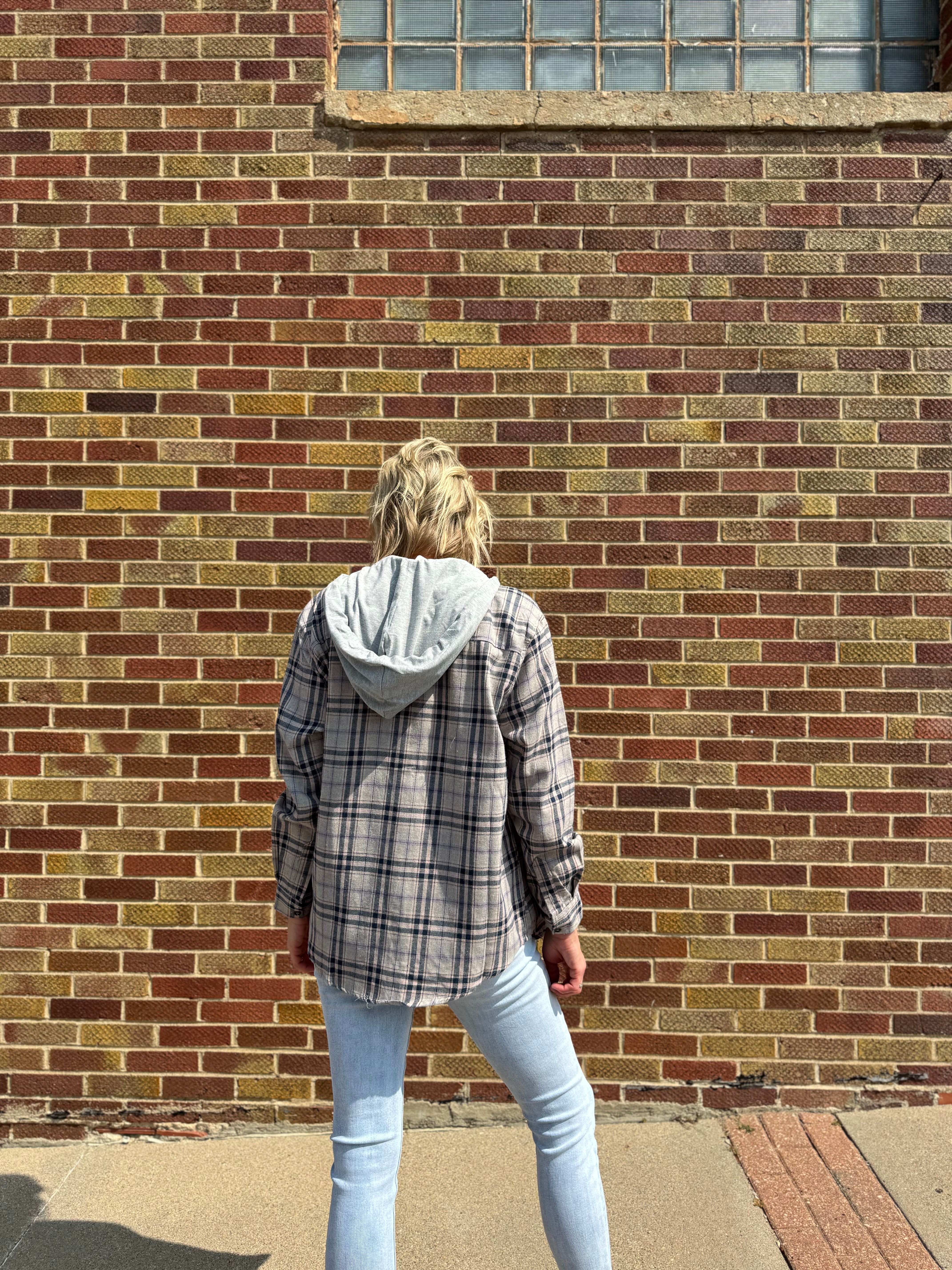 Navy Plaid Button Up Shirt w/ Hoodie & Front Pockets