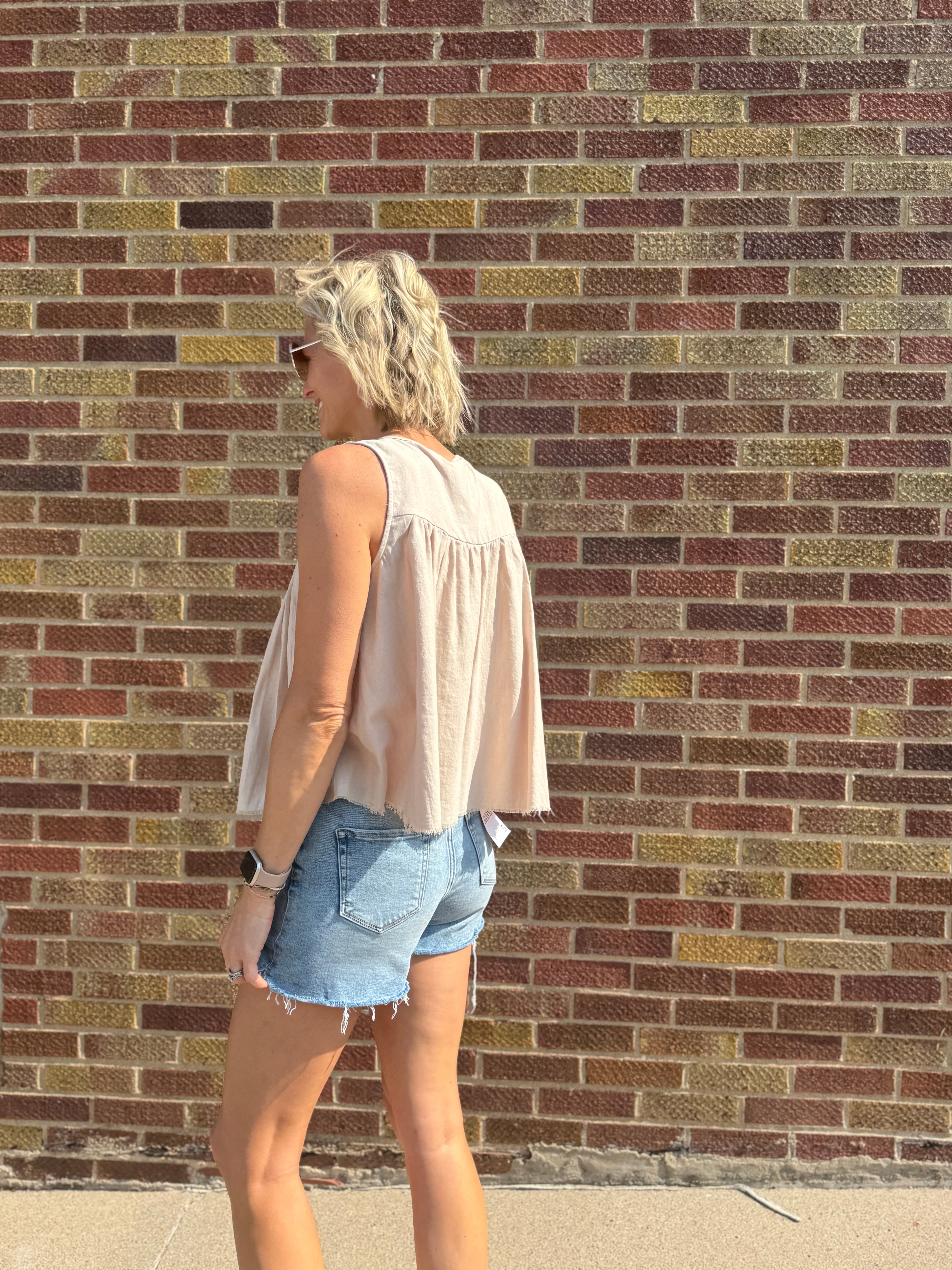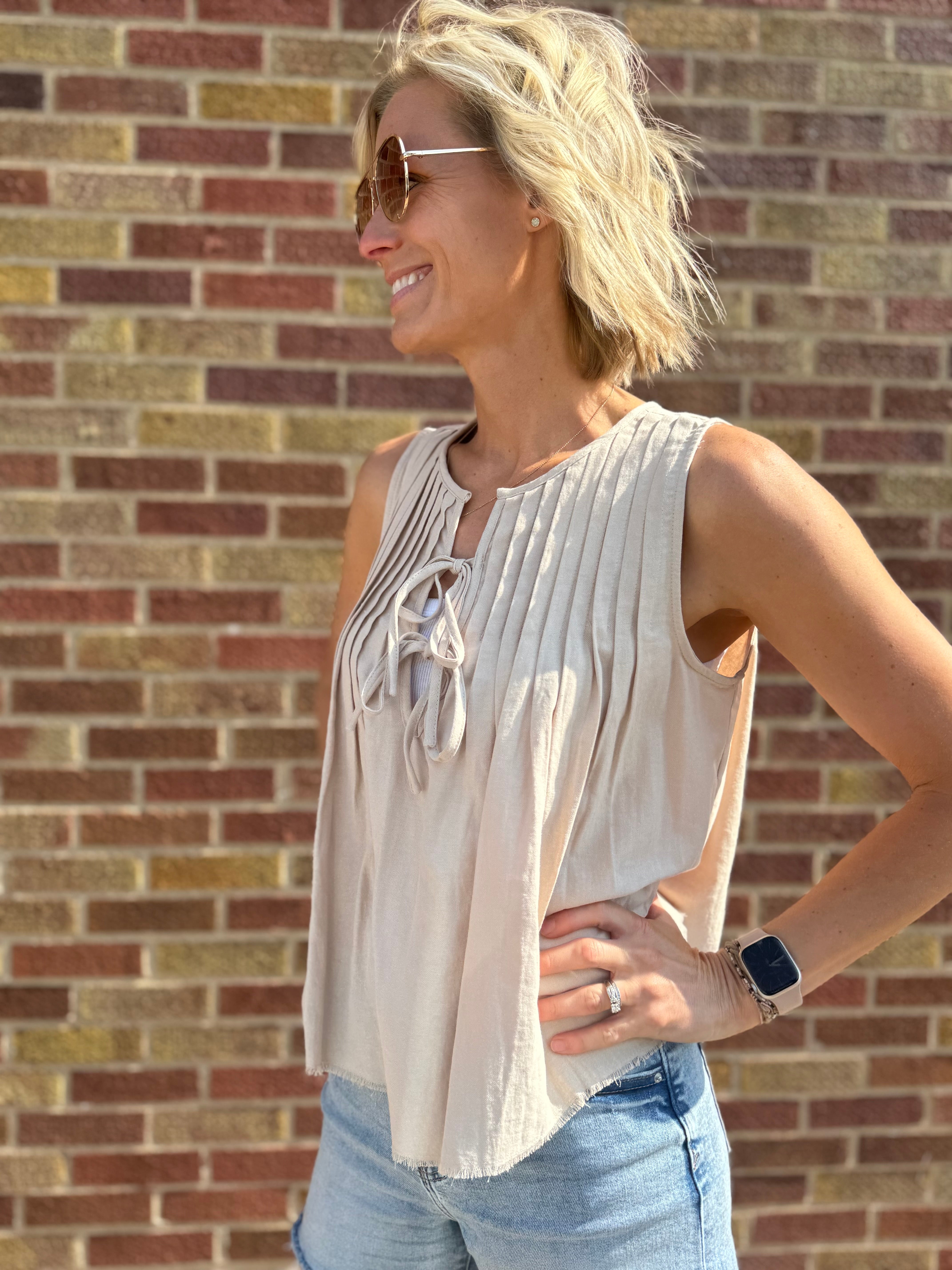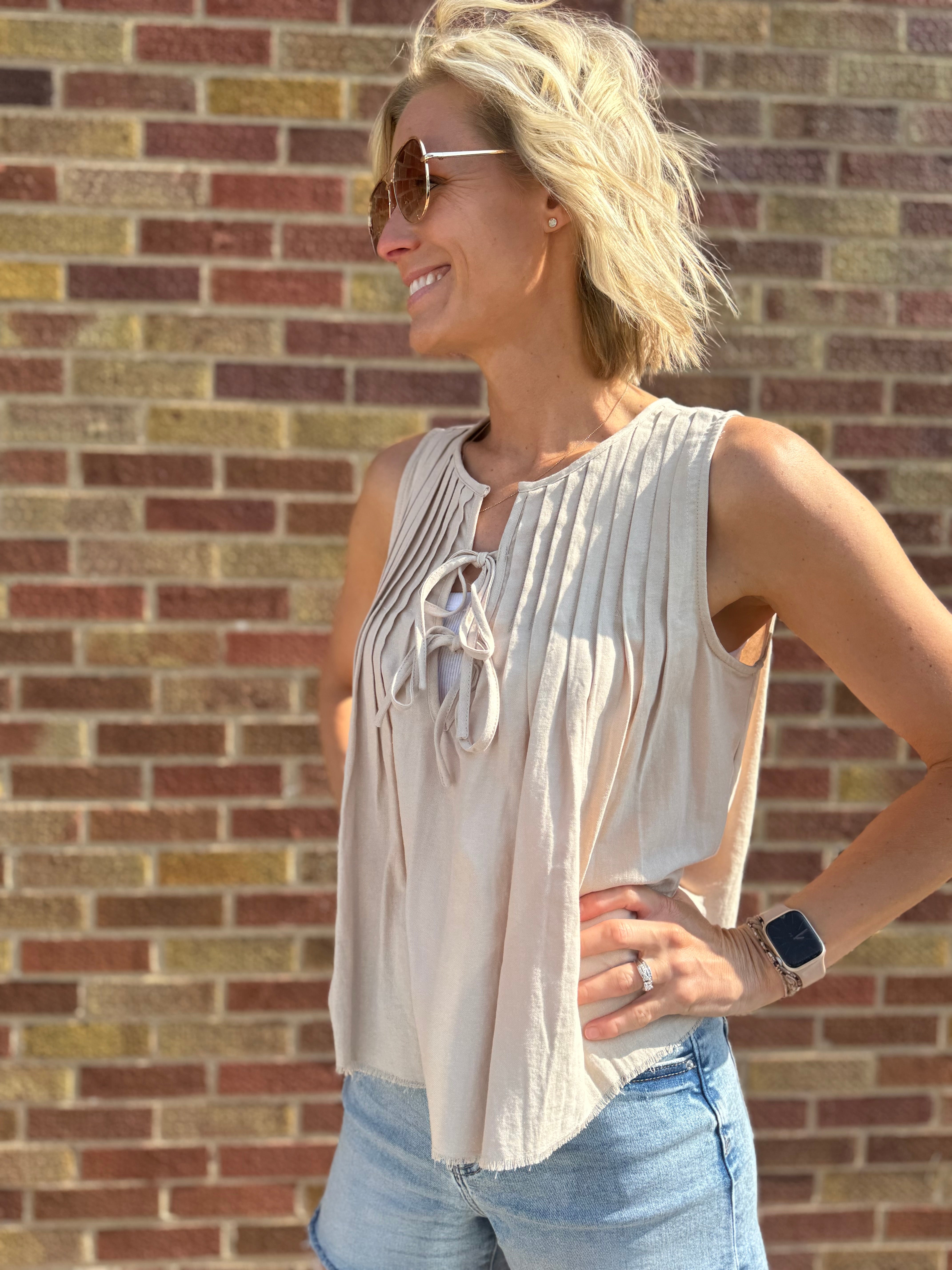 This sleeveless top offers a versatile and stylish option for any occasion. Its V-neckline with two ties adds a touch of femininity, while the raw hem adds a modern edge. Made from high-quality materials, this top provides both comfort and a flattering fit. Perfect for dressing up or down, it's a must-have for any wardrobe.
