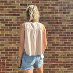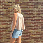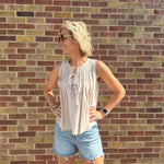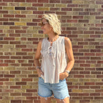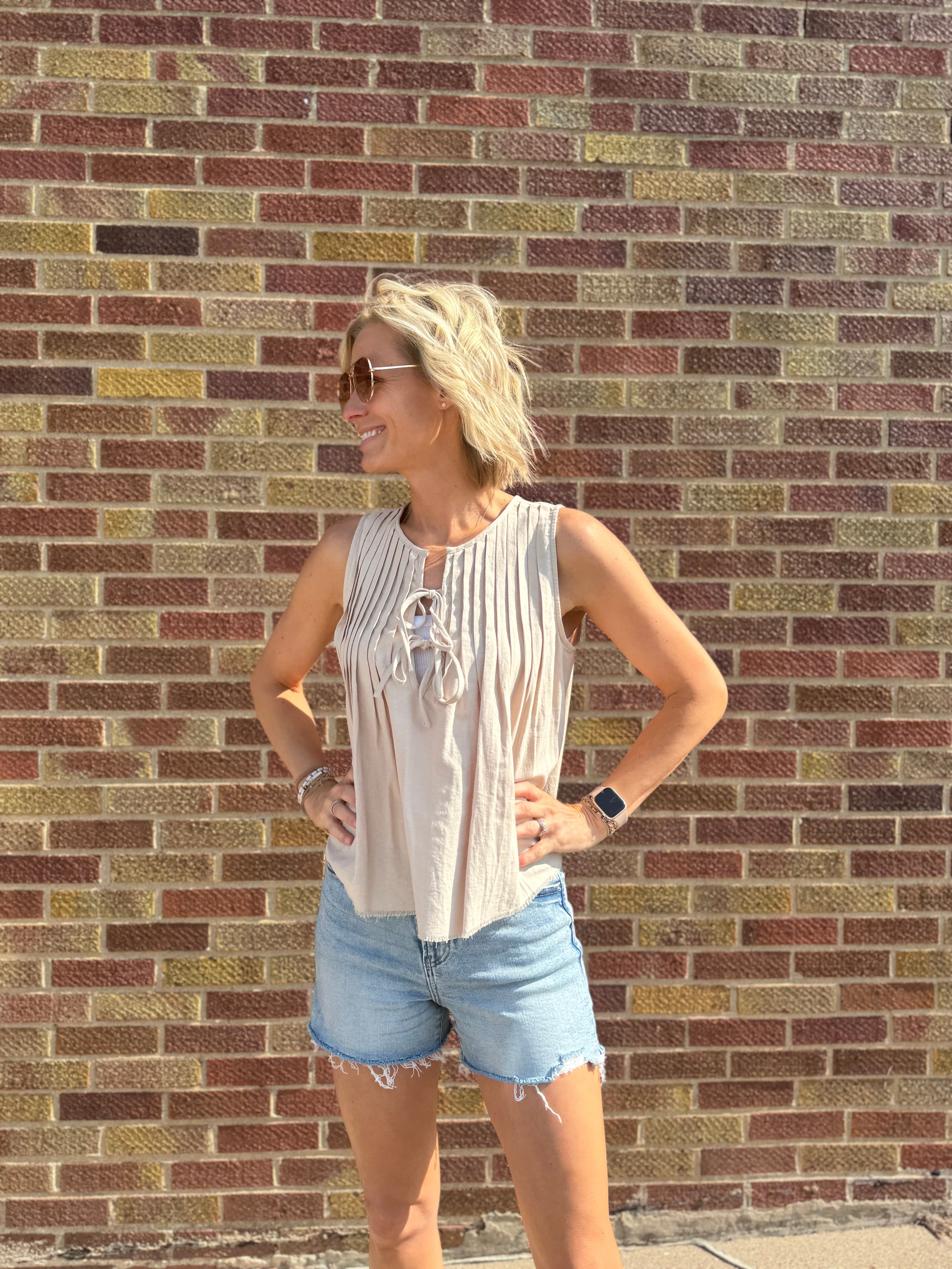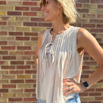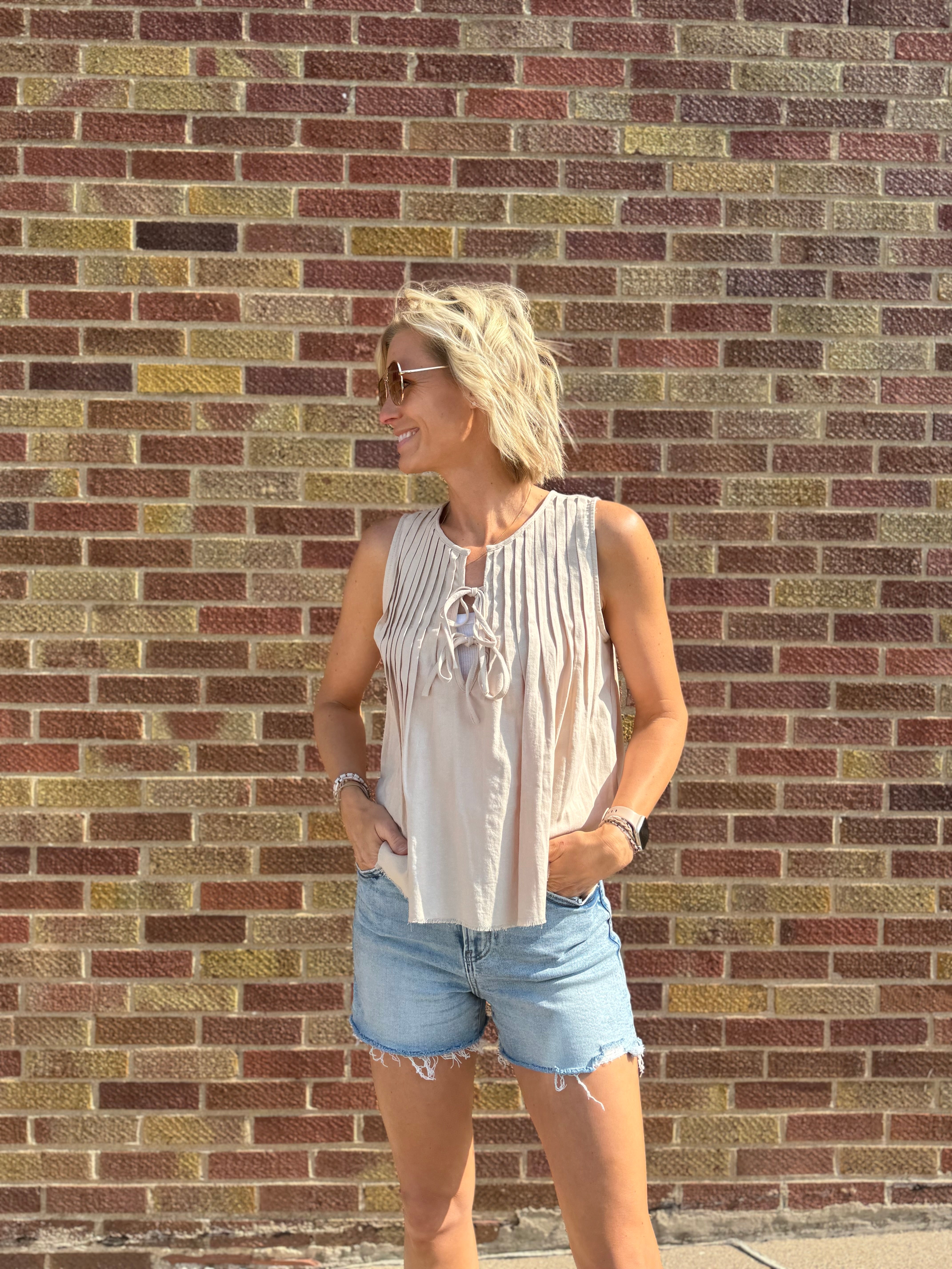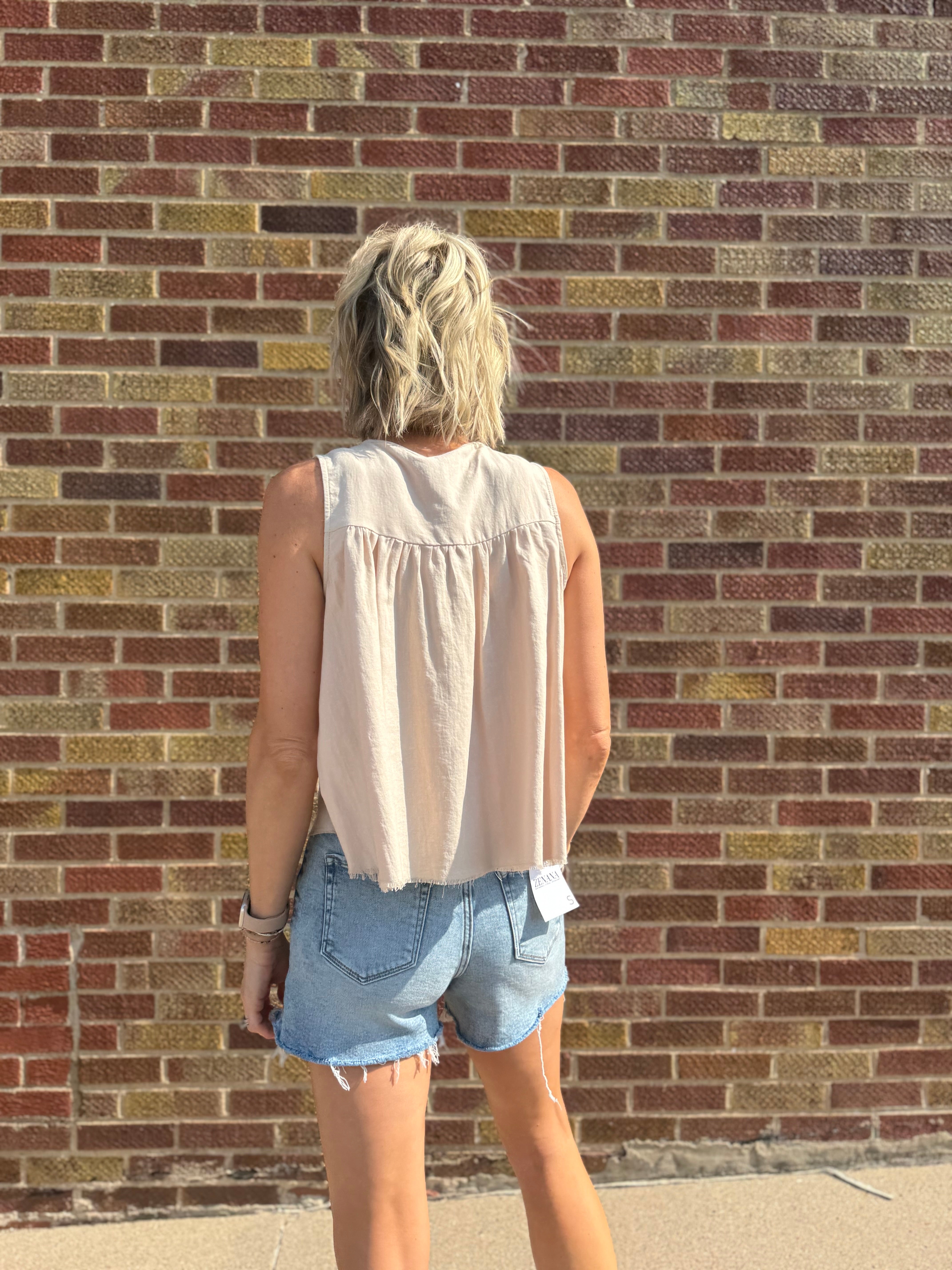 This sleeveless top offers a versatile and stylish option for any occasion. Its V-neckline with two ties adds a touch of femininity, while the raw hem adds a modern edge. Made from high-quality materials, this top provides both comfort and a flattering fit. Perfect for dressing up or down, it's a must-have for any wardrobe.